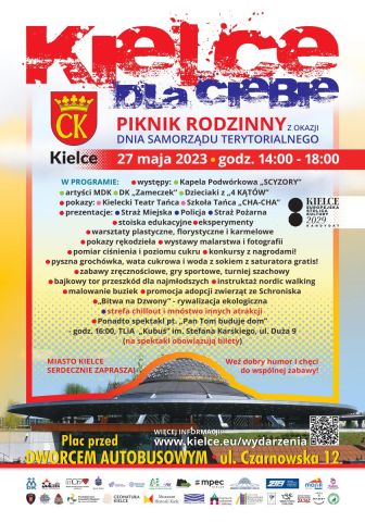 Występy artystyczne, warsztaty, pokazy, konkursy z nagrodami, ciepły i słodki poczęstunek oraz mnóstwo innych atrakcji - Miasto Kielce zaprasza do wspólnej zabawy na Pikniku Rodzinnym „Kielce dla Ciebie” z okazji Dnia Samorządu Terytorialnego. Wydarzenie będzie organizowane 27 maja w godzinach 14:00-18:00 przed Dworcem Autobusowym przy ul. Czarnowskiej 12.