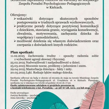 Serdecznie zapraszamy rodziców na warsztaty do Miejskiego Zespołu Poradni Psychologiczno-Pedagogicznych w Kielcach