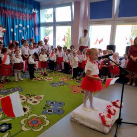 Dnia 10 listopada 2023 r. w naszym Przedszkolu obchodziliśmy Narodowe Święto Niepodległości połączone z konkursem recytatorskim ,,Polska moja Ojczyzna”. Uroczystość rozpoczęła Dyrektor przedszkola – p. Renata Monika Jas, która przywitała wyjątkowych gości: pana Jerzego Gruszczyńskiego - komendanta Związku Strzeleckiego im. J. Piłsudskiego w Kielcach, panią Beatę Kanię - szefową sztabu Związku Strzeleckiego im. J. Piłsudskiego w Kielcach, seniorów z Klubu Seniora, podopiecznych Środowiskowego Domu Samopomocy Typu C oraz całą społeczność przedszkolną. Odświętnie ubrane przedszkolaki w barwach biało-czerwonych zaprezentowały się w programie słowno-muzycznym związanym z odzyskaniem przez nasz kraj niepodległości. W czasie swojego występu dzieci przedstawiły krótką lekcję historii, recytowały wiersze, śpiewały pieśni patriotyczne Legiony, Rozkwitały pąki białych róż, Piechota. Nie zabrakło tańca Kujawiaka, pięknego układu z serduszkami do piosenek Kto ty jesteś?, tańca z wstążkami do piosenki W listopadzie, tańca z chustkami biało-czerwonymi do melodii filmowej Polskie drogi. Najmłodsze przedszkolaki z grupy Biedroneczek i Żabek wykonały taniec do piosenki Symbole Polski. Wszyscy obecni na tej uroczystości odśpiewali Hymn Polski w ramach akcji Ministerstwa Edukacji Narodowej „Szkoła do hymnu”.
