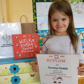 W ostatnim czasie Zuzia z grupy Motylków wzięła udział w konkursie "PRZEDSZKOLAK - MAŁY PATRIOTA" zorganizowanym przez Przedszkole Samorządowe nr 18 w Kielcach zaś Iruś i Piotruś z grupy Sówek zaprezentowali swój talent w konkursie ekologicznym pt. "ZIEMIA - ZIELONA WYSPA" zorganizowanym przez Przedszkole Samorządowe nr 9 w Kielcach. Przedszkolaki za udział w konkursie otrzymały dyplomy i nagrody.
