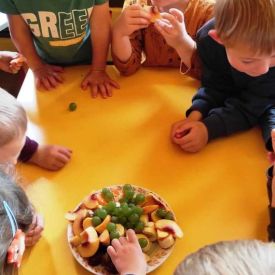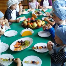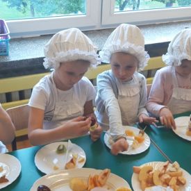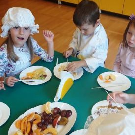 zaś przedszkolaki z grup starszych przygotowały pyszne, kolorowe szaszłyki owocowe, które później ze smakiem zjadły.