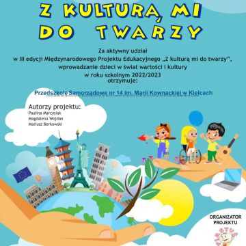 Miło nam poinformować, iż nasze Przedszkole otrzymało certyfikat za aktywny udział w III edycji Międzynarodowego Projektu Edukacyjnego "Z kulturą mi ...
