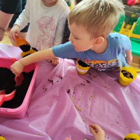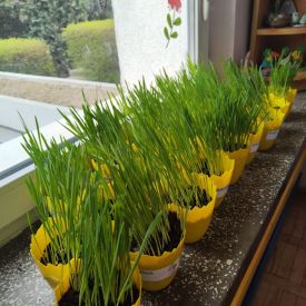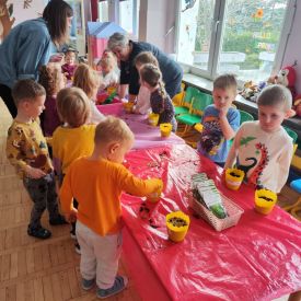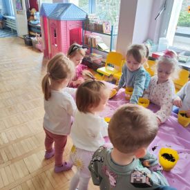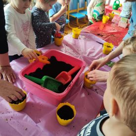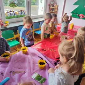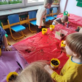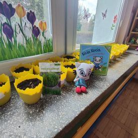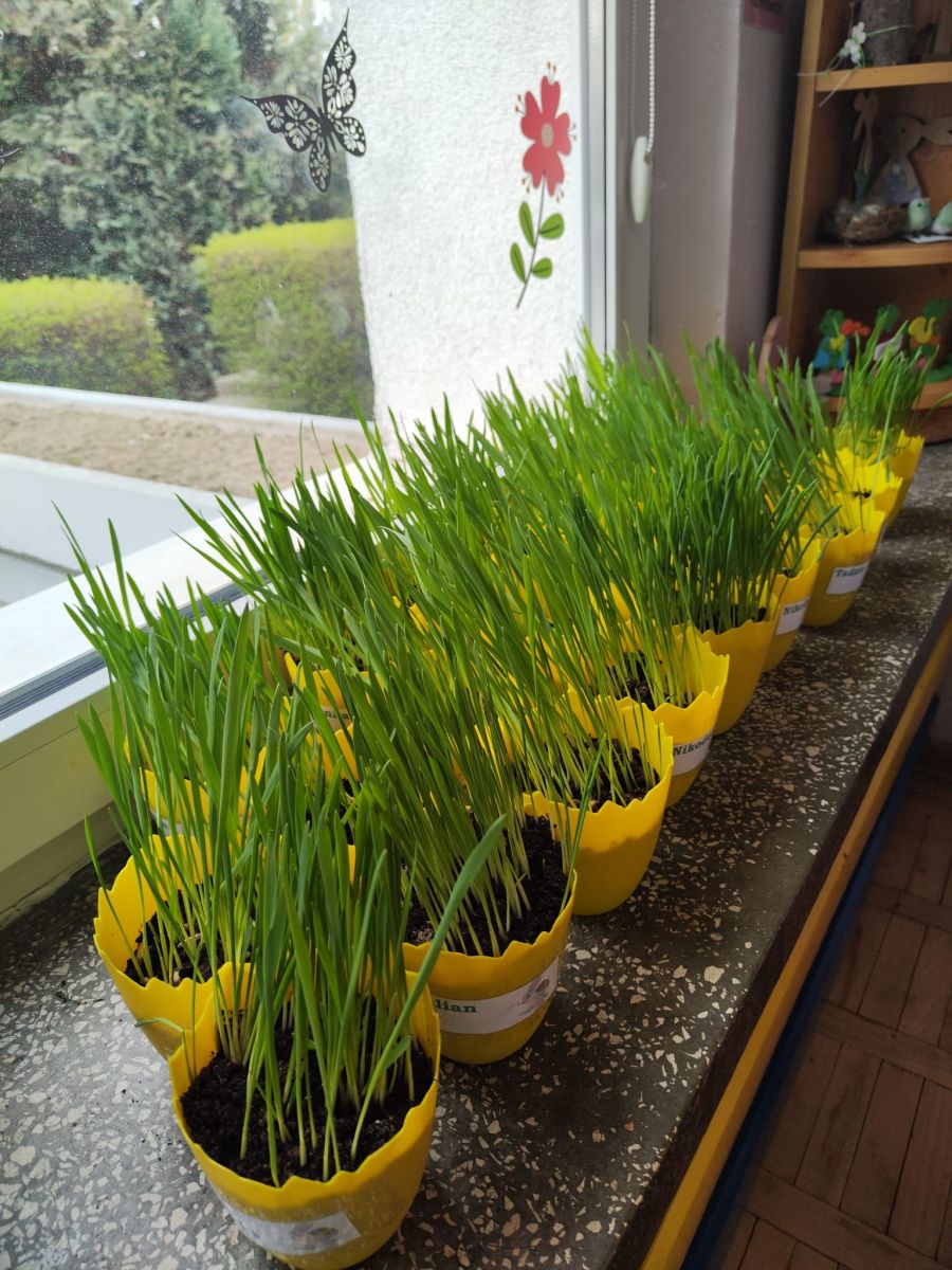Dzieci z grupy Biedronek wykonały kolejne zadanie projektowe "Z Kicią Kocią maluchy zmieniają się w zuchy". Tym razem przedszkolaki wysłuchały opowiadania "Co zasiejemy w ogródku?" i zainspirowane treścią książeczki stworzyły w sali własny zielony ogródek. Każde dziecko samodzielnie umieściło ziarna owsa wielkanocnego w doniczce wypełnionej ziemią, a następnie przykryło je cienką warstwą gleby. Sianie owsa w przedszkolu to zajęcie, które pozwala dzieciom poznać etap siania zboża i obserwować jak rośnie owies. Dzieci każdego dnia obserwują swoje doniczki i pamiętają o regularnym podlewaniu owsa.