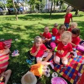 W tym samym dniu również dzieci z grupy Biedronek wybrały się na rajd na polanę. Po powrocie z rajdu odbył się piknik na kocach „pod wierzbami" w naszym ogrodzie przedszkolnym, świętowanie urodzin Różyczki oraz zabawy na zjeżdżalni.