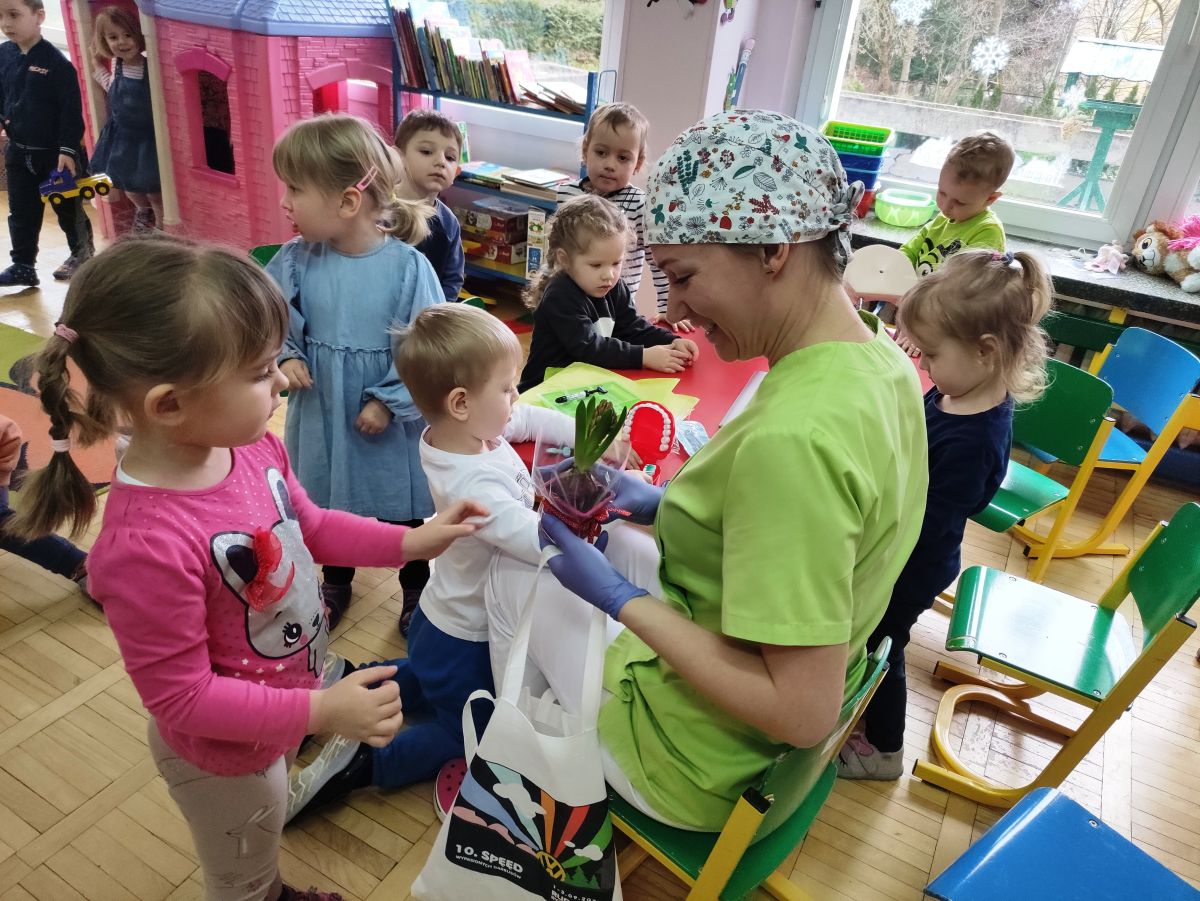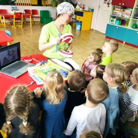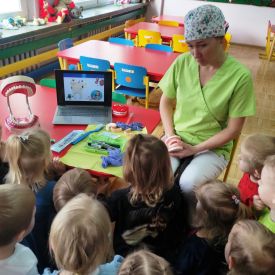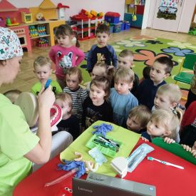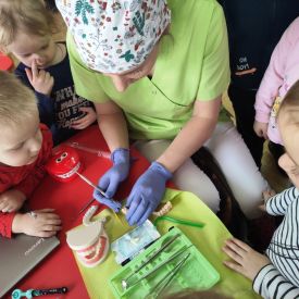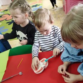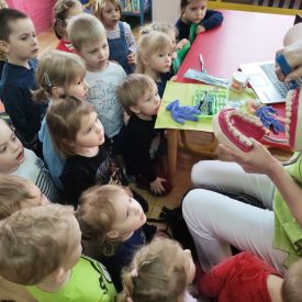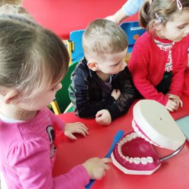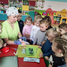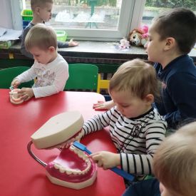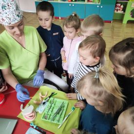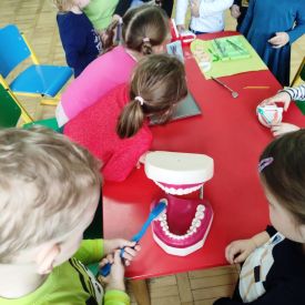 2 lutego grupę Biedronek odwiedziła mama Malwinki - Pani Iwona Lengier, która opowiedziała przedszkolakom o swojej pracy dentysty. Głównym celem spotkania było uświadomienie przedszkolakom konieczności dbania o higienę jamy ustnej. Przedszkolaki z zaciekawieniem wysłuchały pogadanki na temat właściwej higieny jamy ustnej. Dowiedziały się, jak należy prawidłowo czyścić zęby. Ogromną atrakcją były ćwiczenia praktyczne na modelu szczęki, które trwały jeszcze długo po wyjściu naszego gościa.