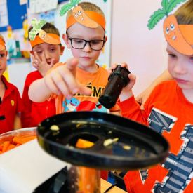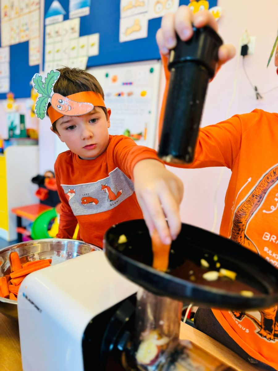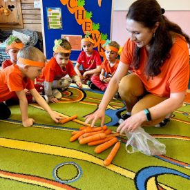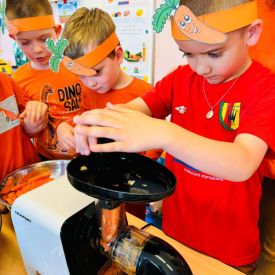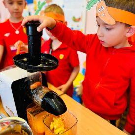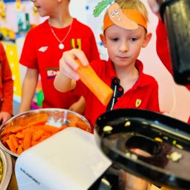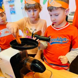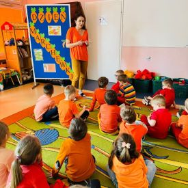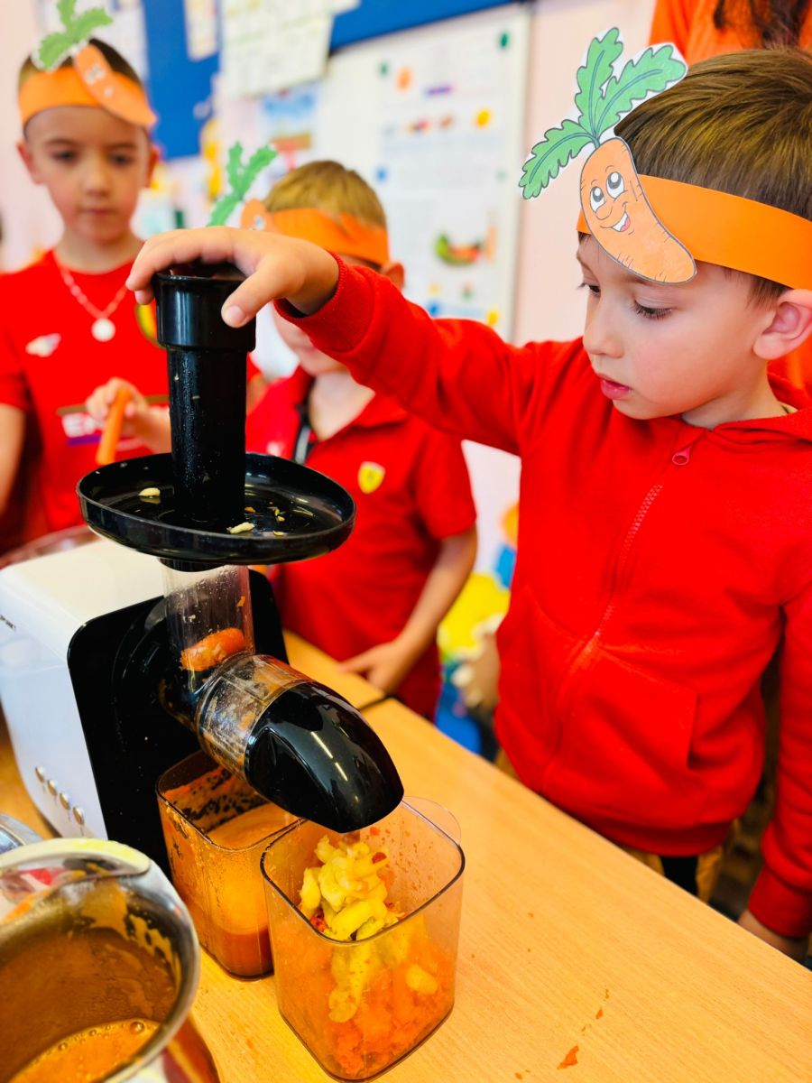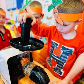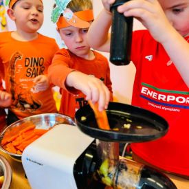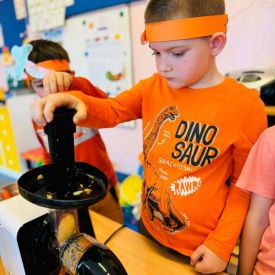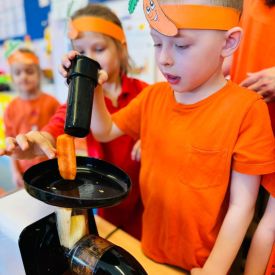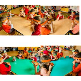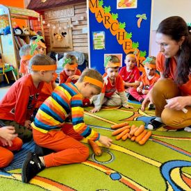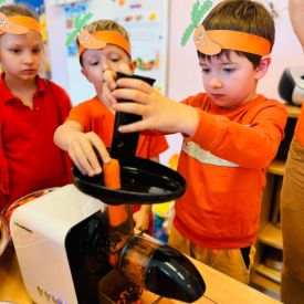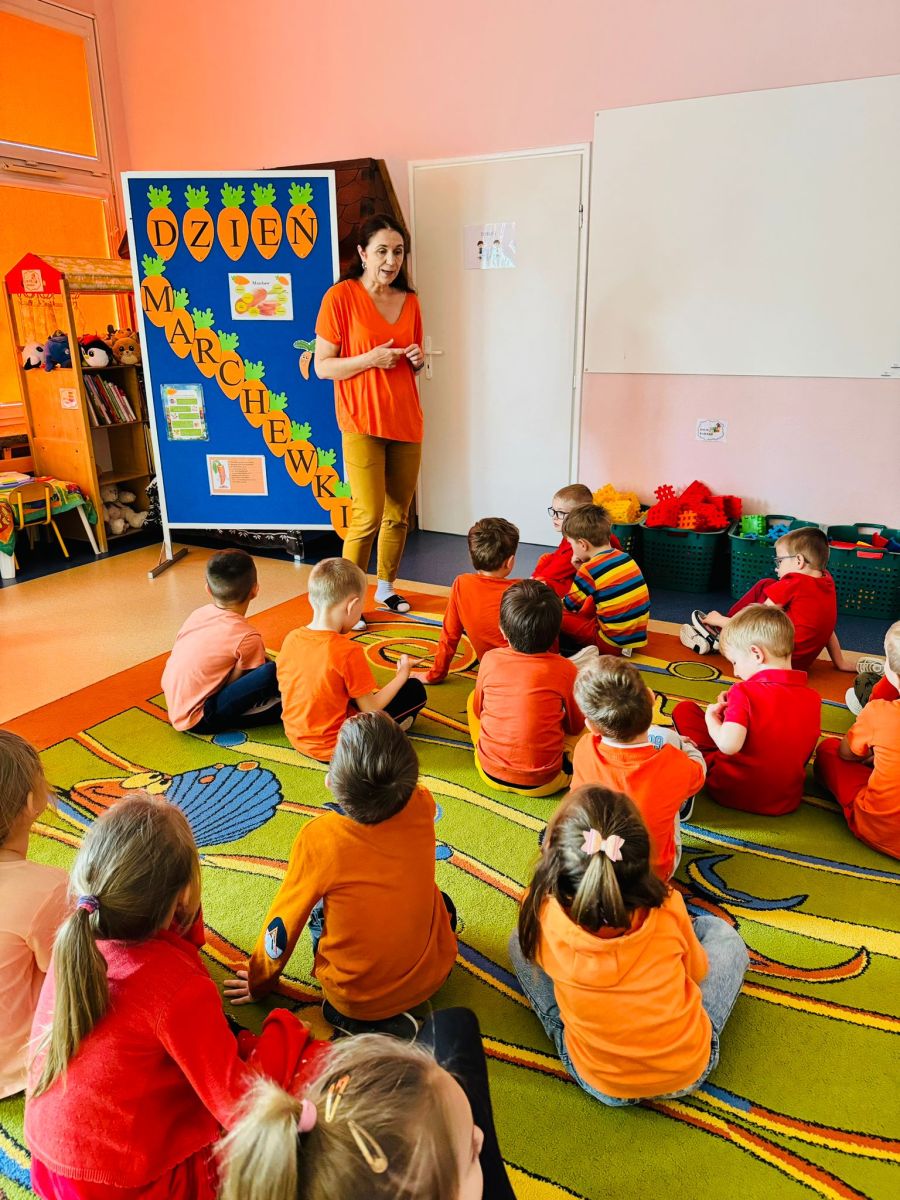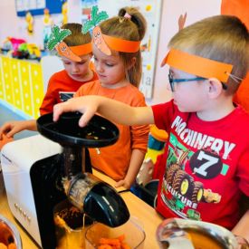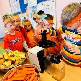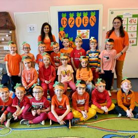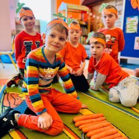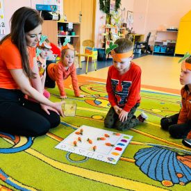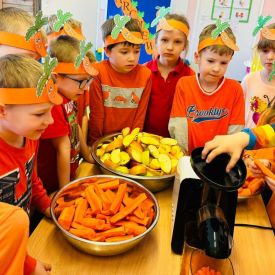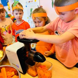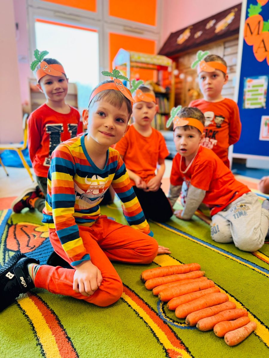 4 kwietnia obchodzimy Międzynarodowy Dzień Marchewki. W grupie Pszczółek zrobiło się pomarańczowo. Dzieci w pięknych marchewkowych opaskach bawiły się w różne zabawy, których główną bohaterką była marchewka. Przedszkolaki poznały dobrodziejstwa tego warzywa, dowiedziały się jakich witamin nam dostarcza oraz poznały strukturę marchewki poprzez dotyk. Dzieci obejrzały krótki filmik edukacyjny pt: „Kubuś - Dzień Marchewki” oraz wysłuchały wierszyka o pomarańczowym warzywku. Pszczółki sprawdzały swoje siły w „Marchewkowym kodowaniu”. Najwięcej frajdy sprawiło dzieciom wyciskanie soku marchewkowo- jabłkowego.