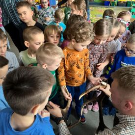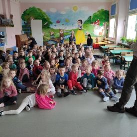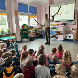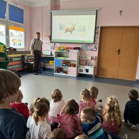 Pan Cezary opowiedział przedszkolakom o pracy leśnika. Dzieci z zaciekawieniem słuchały ciekawostek o roślinach i zwierzętach występujących w polskich lasach. Podczas spotkania maluchy dowiedziały się jak należy zachować się w lesie, by żyć z przyrodą w zgodzie. Największą atrakcją spotkania było poroże jelenia, które przedszkolaki mogły zobaczyć z bliska, dotknąć, powąchać. Spotkanie upłynęło w miłej atmosferze, a wysłuchane ciekawostki i wiadomości poszerzyły wiedzę przyrodniczą przedszkolaków.