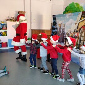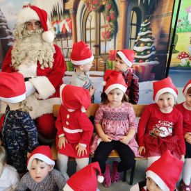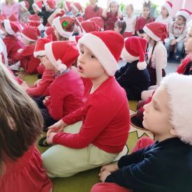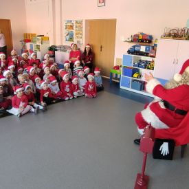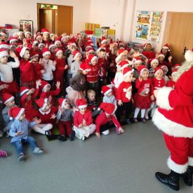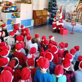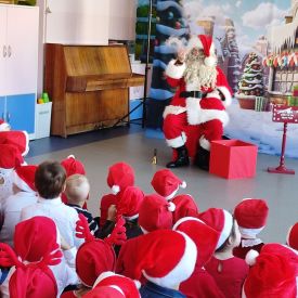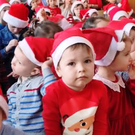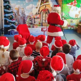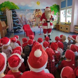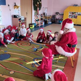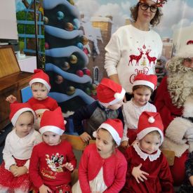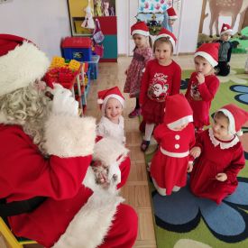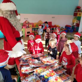 Pięknym momentem spotkania była również chwila, gdy dzieci z całego przedszkola zaśpiewały dla Mikołaja. Maluchy z uśmiechem na twarzach, zjednoczyły się, by podziękować Mikołajowi za jego obecność i radosny czas spędzony razem. Śpiewały zarówno po polsku, jak i po angielsku, tworząc atmosferę międzykulturowego świętowania. Następnie przedszkolaki wykonały zdjęcie grupowe z Mikołajem, które będzie stanowiło dla nich uroczą pamiątkę. Po wspólnym zdjęciu Mikołaj, pełen ciepła i życzliwości, odwiedził kolejno poszczególne sale, gdzie udzielał dzieciom mądrych rad i odpowiadał na ich pytania. W magiczny sposób, w trakcie wizyty Mikołaja, w salach przedszkolnych pojawiły się prezenty, dodając dodatkową dawkę radości i tajemnicy.
