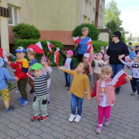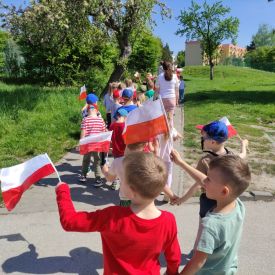 i wszystko co polskie jest dla nas bliskie i ważne. Przedszkolaki na zajęciach wysłuchały nie tylko legend związanych z historią Polski, ale również obejrzały filmy edukacyjne ,,Ola i Święta Majowe”, ,,Święta Majowe dla dzieci” podczas których utrwaliły symbole narodowe. Wykonały wspaniałe prace plastyczne z wykorzystaniem różnorodnych technik: mapę Polski, flagę, godło i kotyliony. Budząc zainteresowania dzieci wydarzeniami ogólnopolskimi, a także rozwijając poczucie przynależności narodowej postanowiliśmy uczcić nasze barwy ojczyste organizując z przedszkolakami marsz z chorągiewkami po osiedlu. Dni te były dla przedszkolaków wspaniałą lekcją przypomnienia sobie, że są Polakami, a POLSKA! – TO NASZ KRAJ, DOM, OJCZYZNA.
