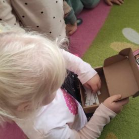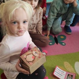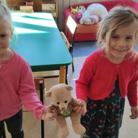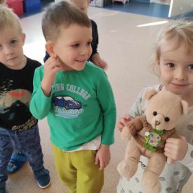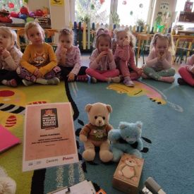 Dzieci z grupy Żabek realizują projekt Mały Miś w Świecie Wielkiej Literatury. Od listopada rozpoczęły zabawę z modułem I - Czytamy razem z Małym Misiem. Przedszkolaki wybrały spośród maskotek misia w sweterku z żabką i nadały mu imię Kum-Kumuś.