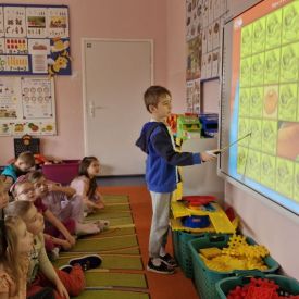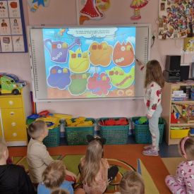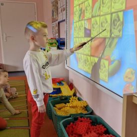 W grupie Pszczółek często proponujemy dzieciom ciekawe zajęcia z wykorzystaniem tablicy interaktywnej. To świetna pomoc, która pomaga nam uatrakcyjnić zajęcia. Przedszkolaki mogą oglądać specjalne programy zamieszczone w Internecie, albo uczestniczyć w specjalnie dla nich przygotowanych ćwiczeniach. Tablica interaktywna służy nam do zabaw dydaktycznych, matematycznych, układania puzzli, przechodzenia przez labirynty, poznawania instrumentów muzycznych, ćwiczeń z zakresu przygotowania do czytania i pisania, poznawania różnych kontynentów oraz podróży w czasie, zarówno w przeszłość jak i przyszłość. To tylko niektóre z możliwości, jakie wykorzystujemy w przedszkolu wykorzystując tablicę interaktywną. Zajęcia z tablicą są bardzo wyczekiwane i lubiane przez wszystkie dzieci.