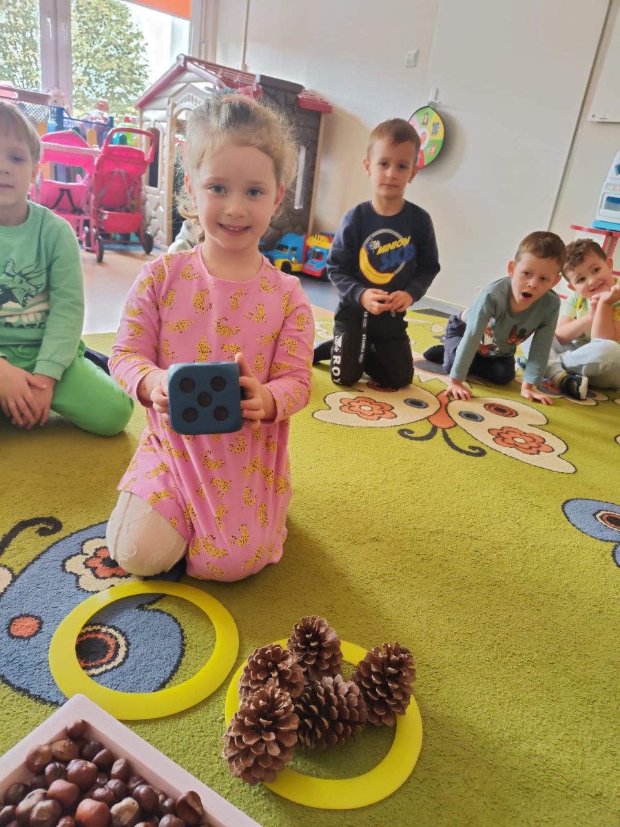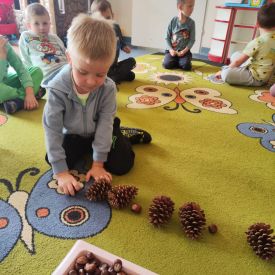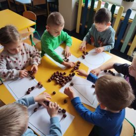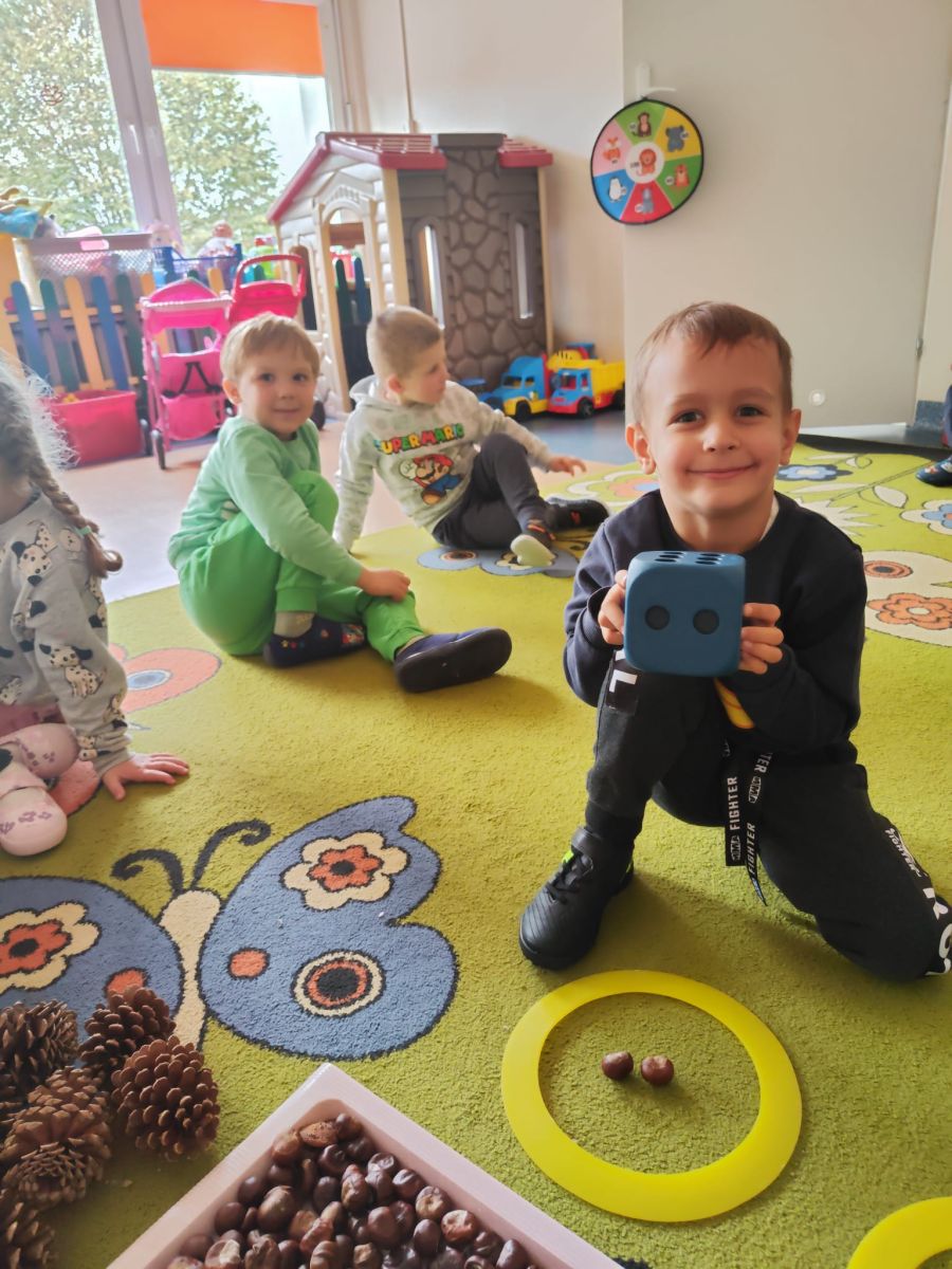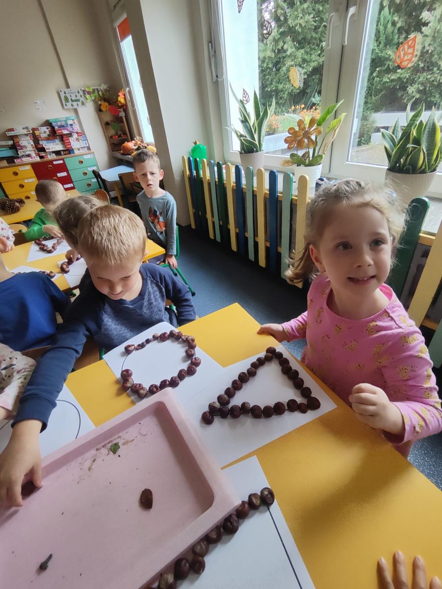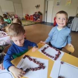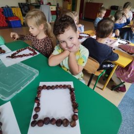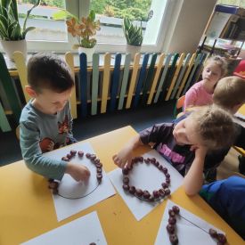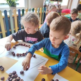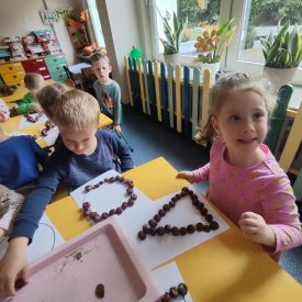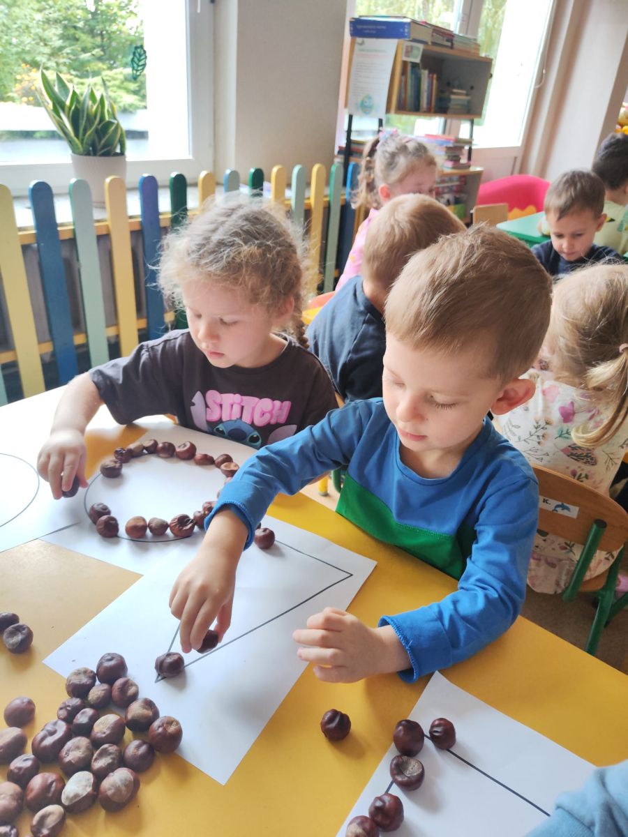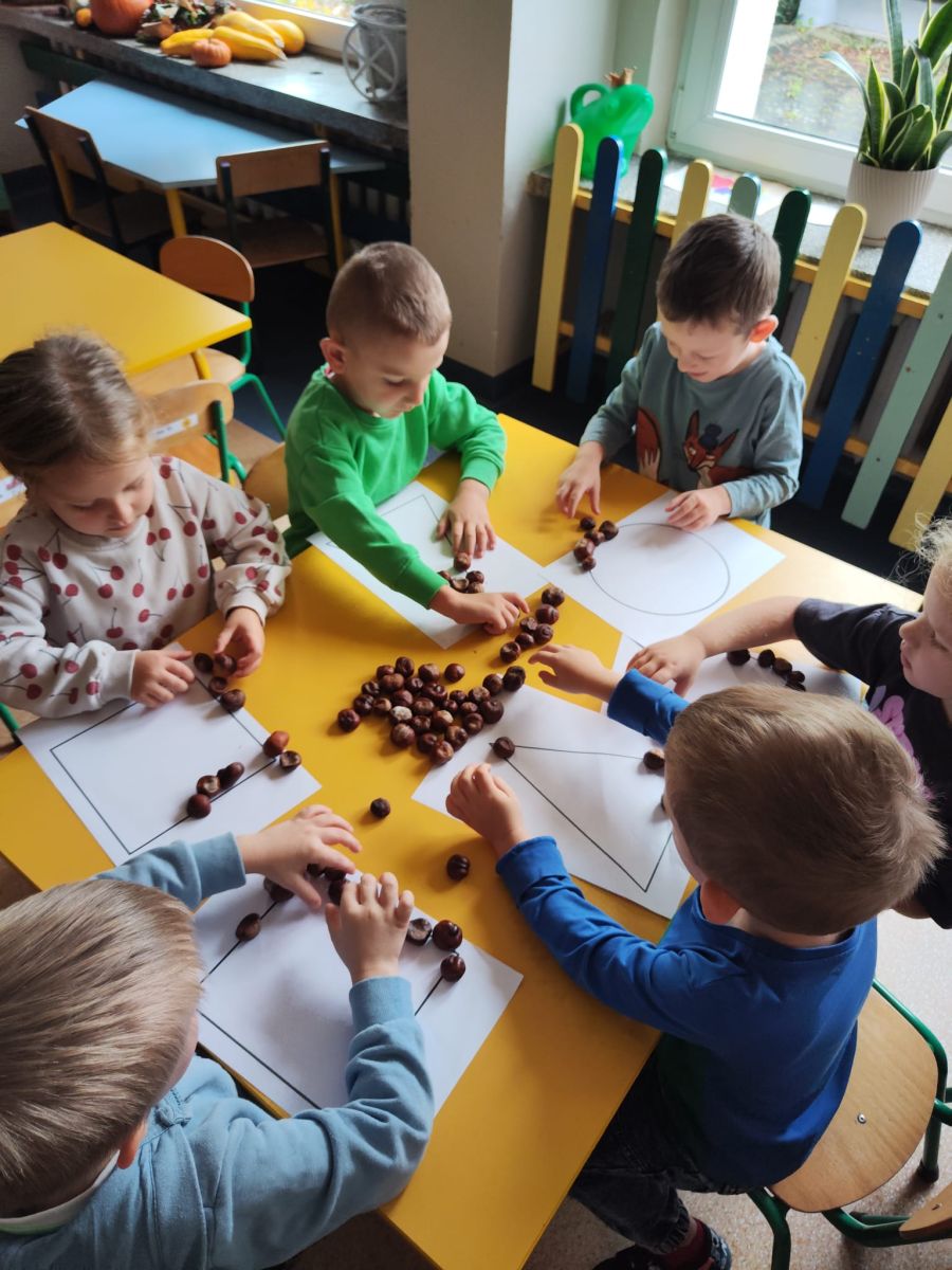W roku szkolnym 2025/2026 dzieci z grupy Żabek biorą udział w Ogólnopolskim Projekcie Edukacyjnym "Kreatywna Matematyka". Przedszkolaki wykonały październikowe zadanie: "Matematyka w plenerze". Choć pogoda tym razem nie dopisała - nie przeszkodziło nam to w matematycznej zabawie - przenieślismy plener do naszej sali i z uśmiechem odkrywaliśmy matematyczny świat dzięki przyniesionym darom jesieni.