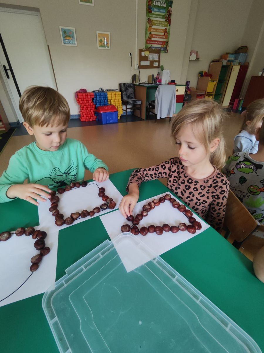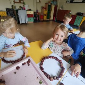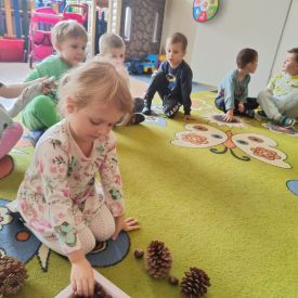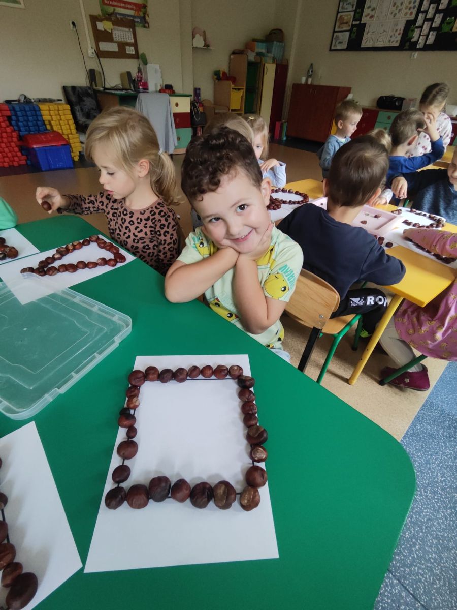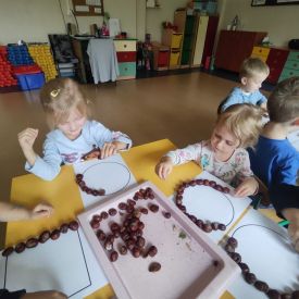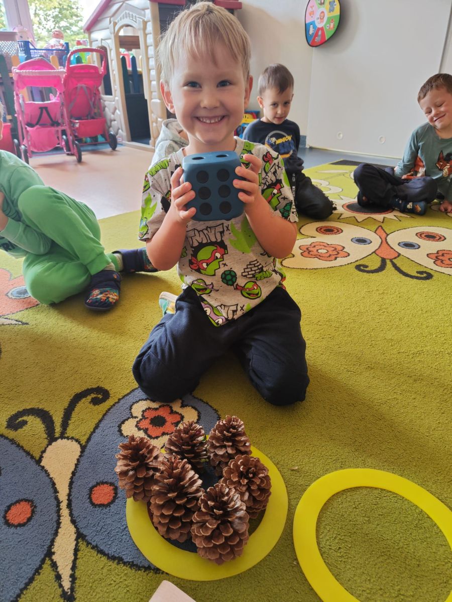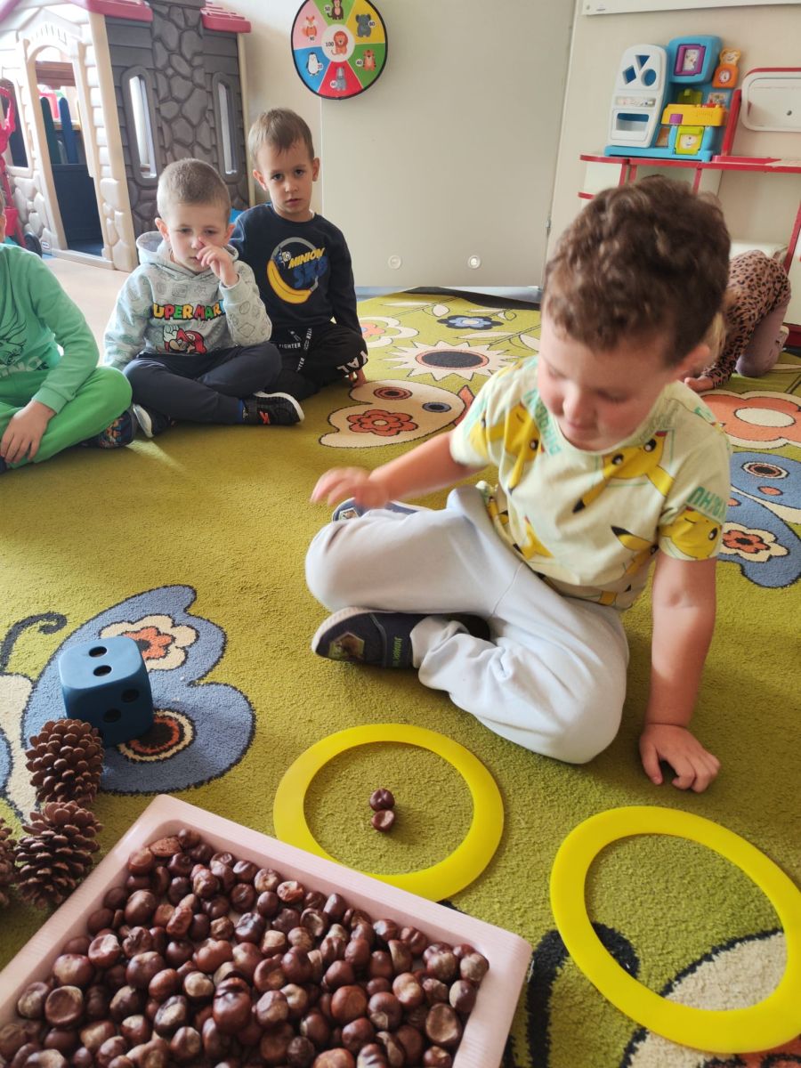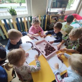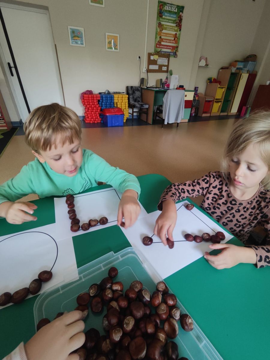 W roku szkolnym 2025/2026 dzieci z grupy Żabek biorą udział w Ogólnopolskim Projekcie Edukacyjnym "Kreatywna Matematyka". Przedszkolaki wykonały październikowe zadanie: "Matematyka w plenerze". Choć pogoda tym razem nie dopisała - nie przeszkodziło nam to w matematycznej zabawie - przenieślismy plener do naszej sali i z uśmiechem odkrywaliśmy matematyczny świat dzięki przyniesionym darom jesieni.