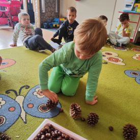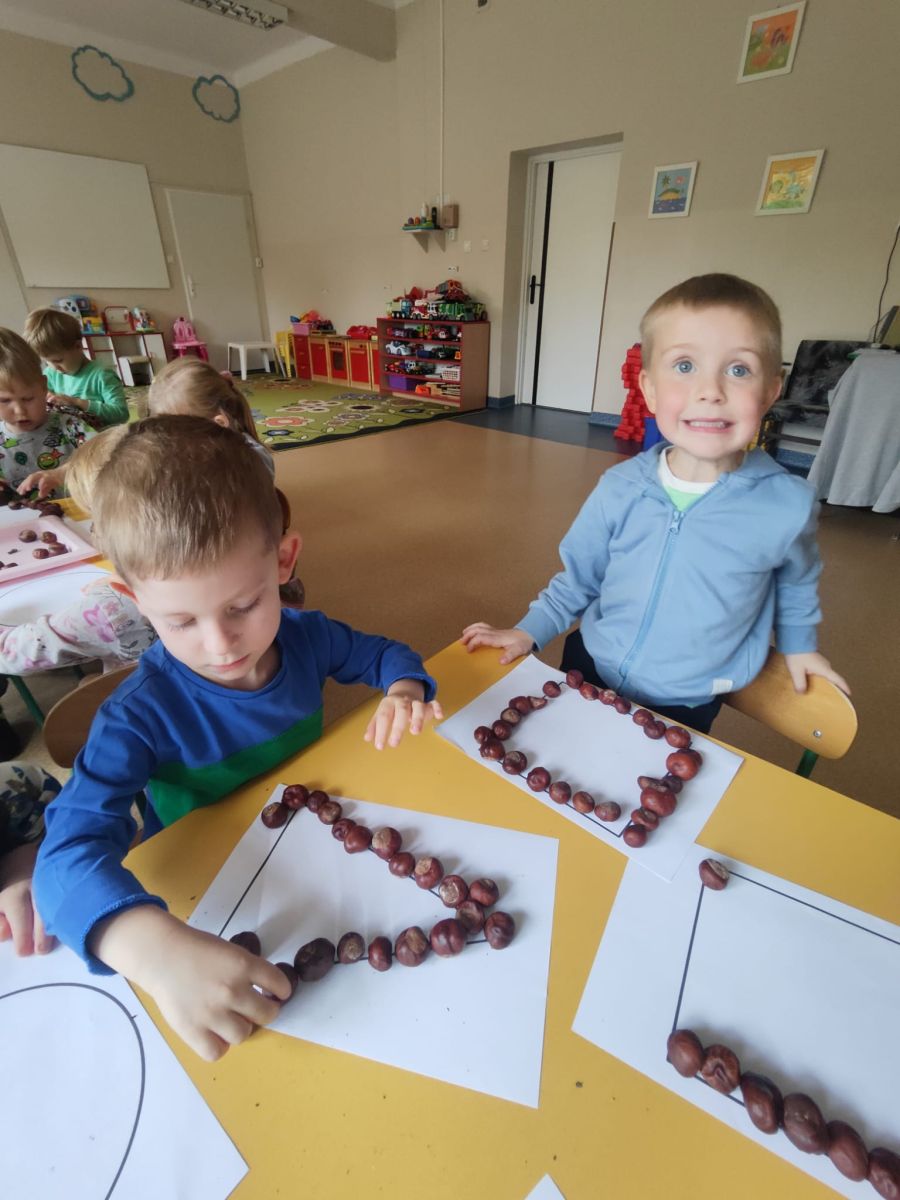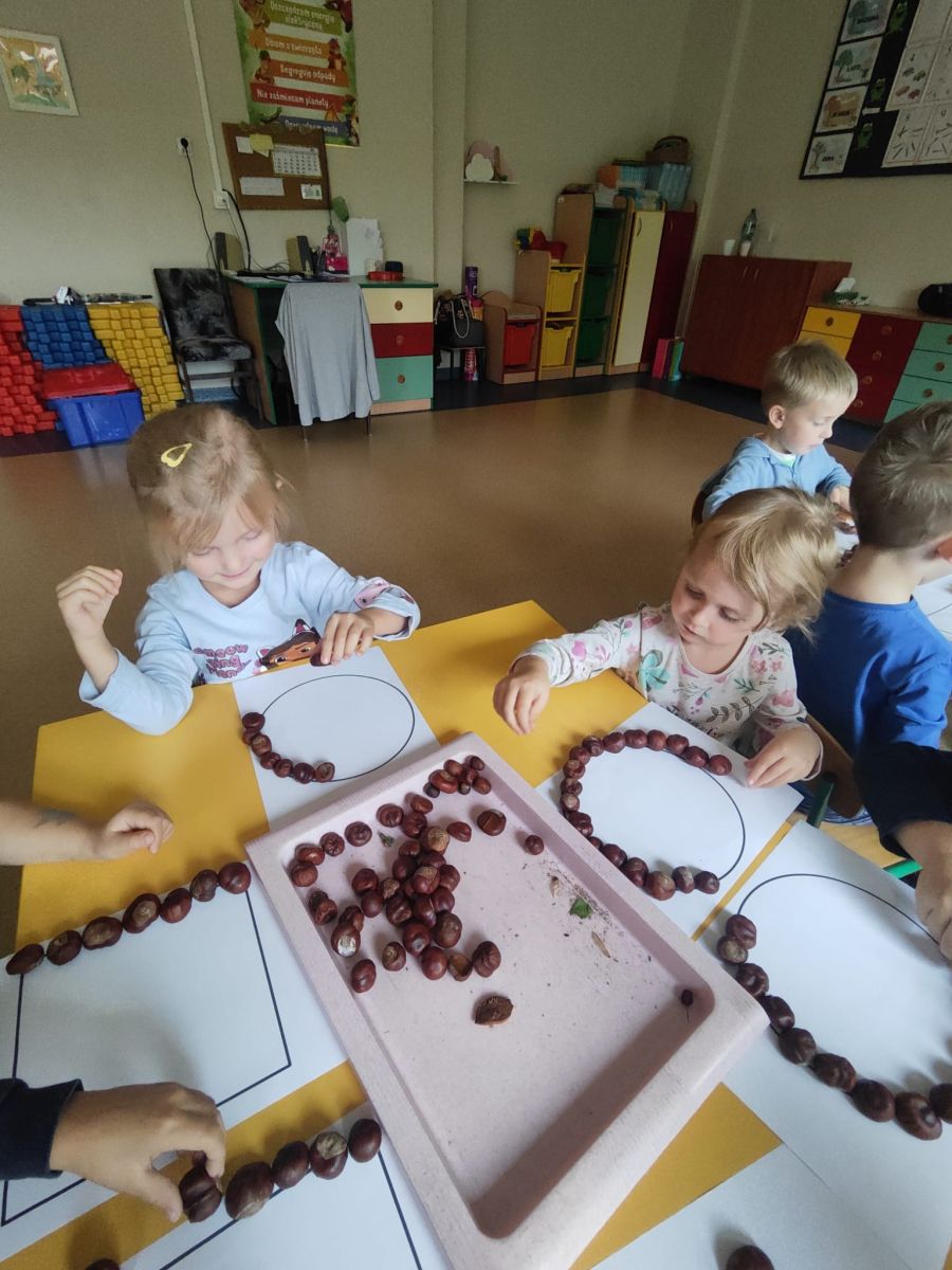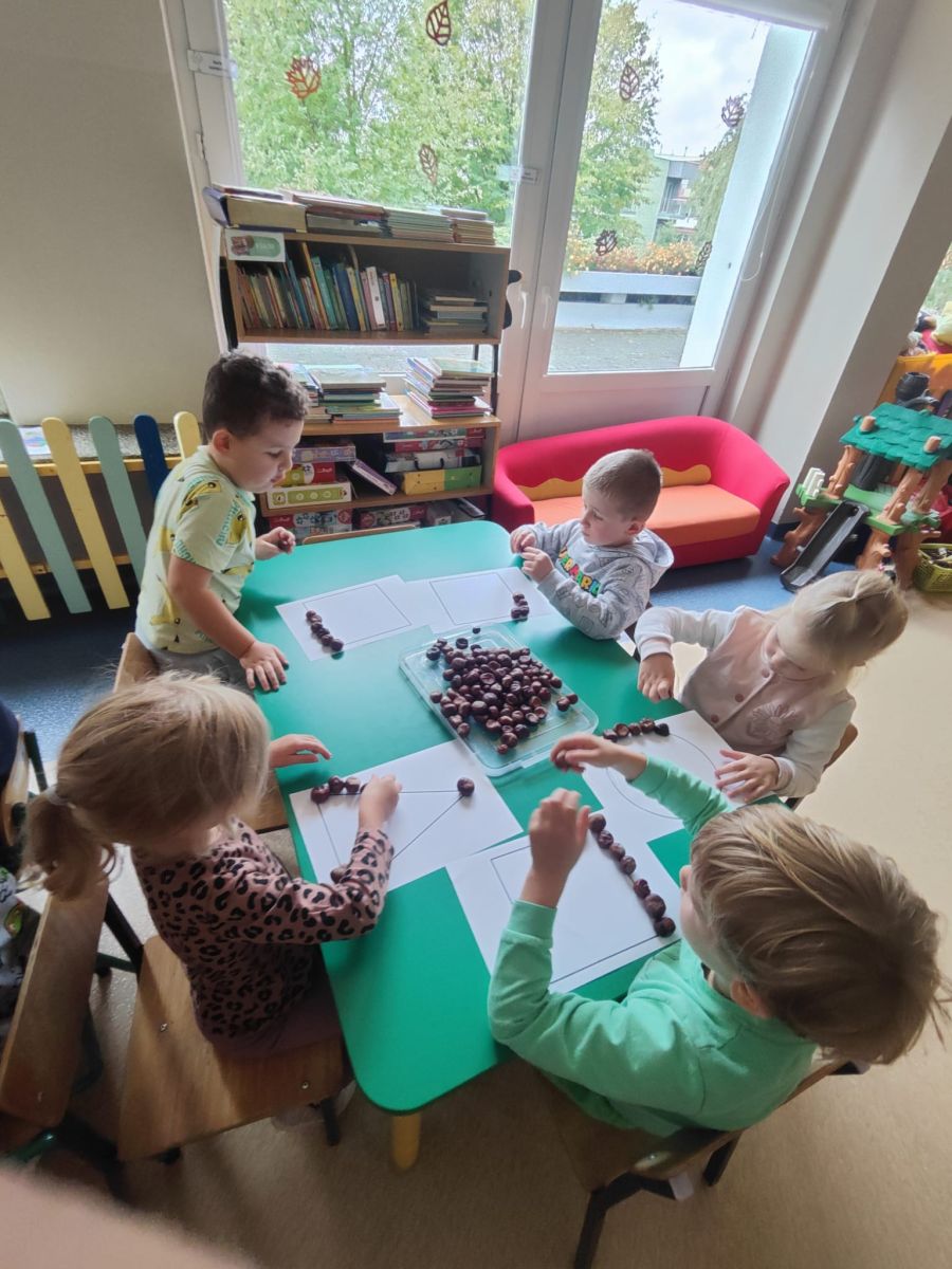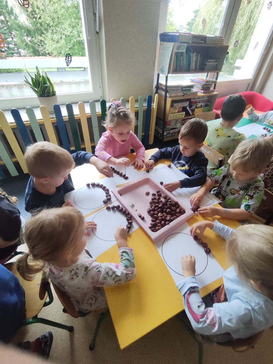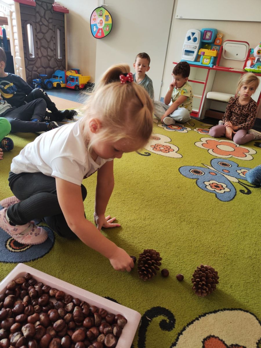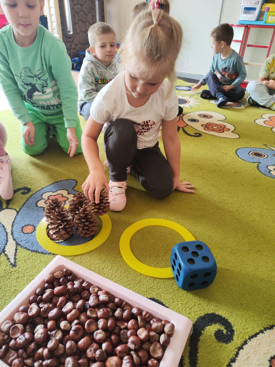W roku szkolnym 2025/2026 dzieci z grupy Żabek biorą udział w Ogólnopolskim Projekcie Edukacyjnym "Kreatywna Matematyka". Przedszkolaki wykonały październikowe zadanie: "Matematyka w plenerze". Choć pogoda tym razem nie dopisała - nie przeszkodziło nam to w matematycznej zabawie - przenieślismy plener do naszej sali i z uśmiechem odkrywaliśmy matematyczny świat dzięki przyniesionym darom jesieni.