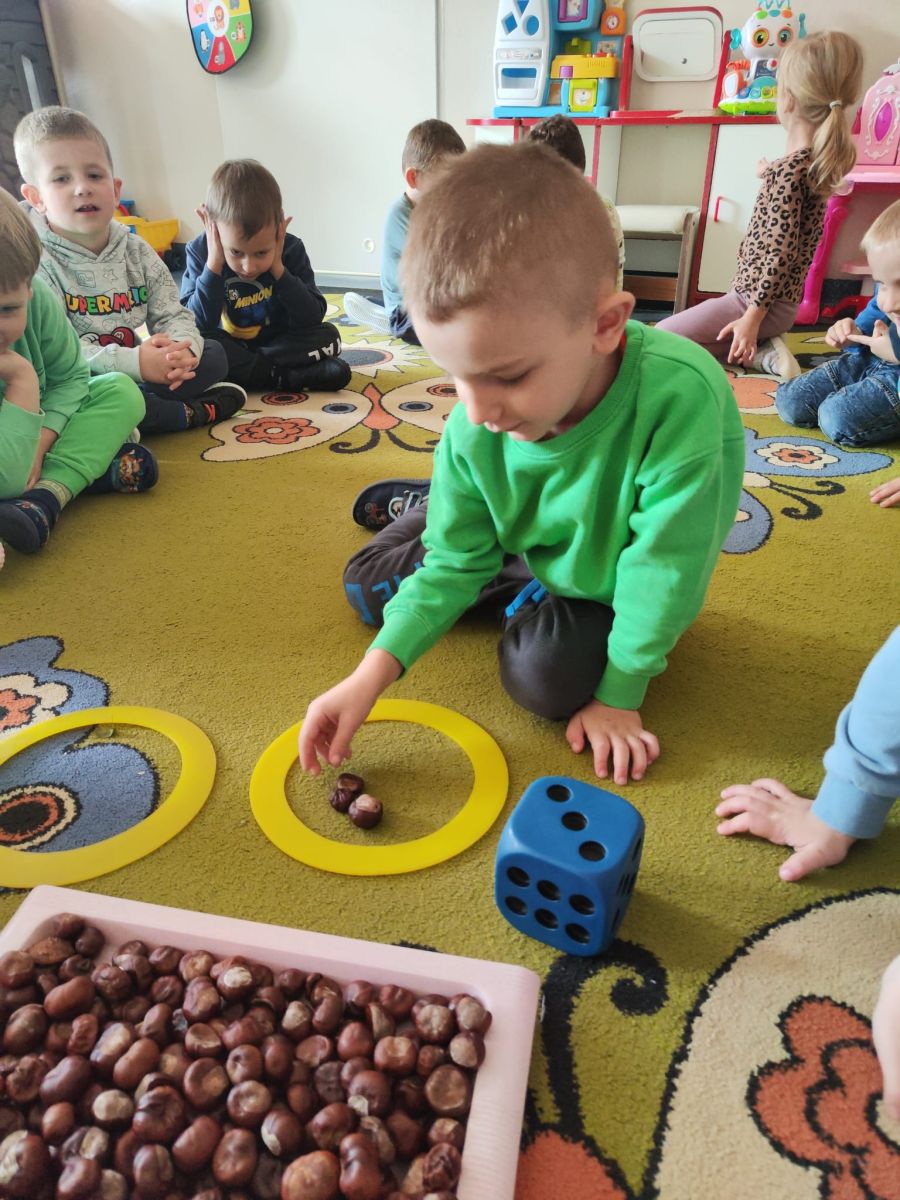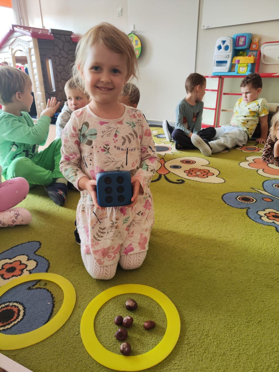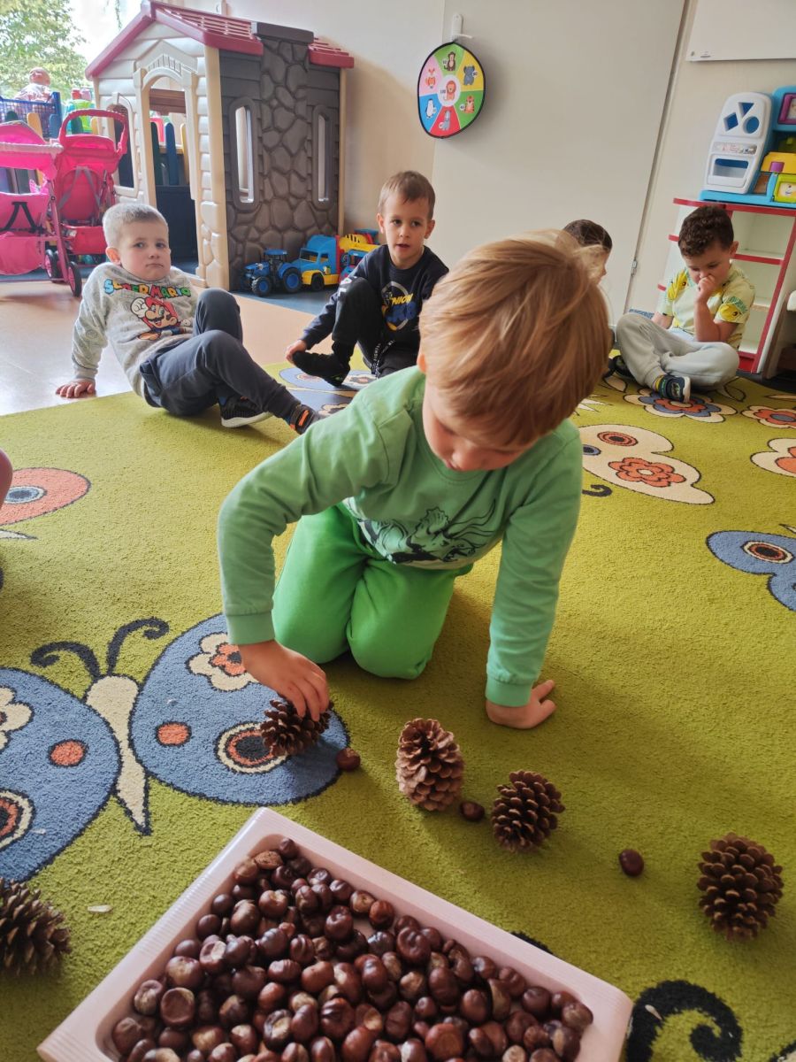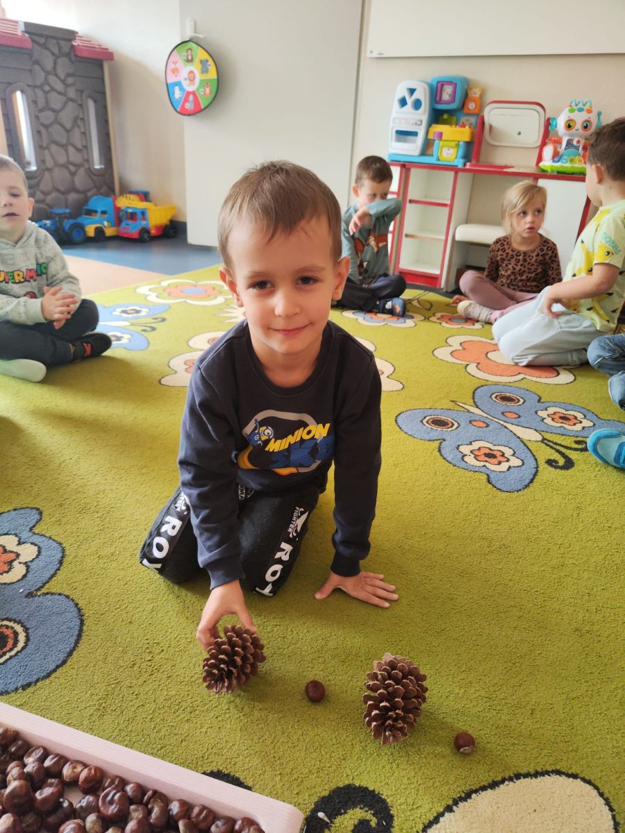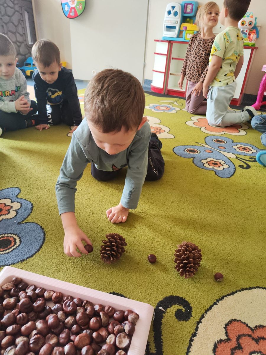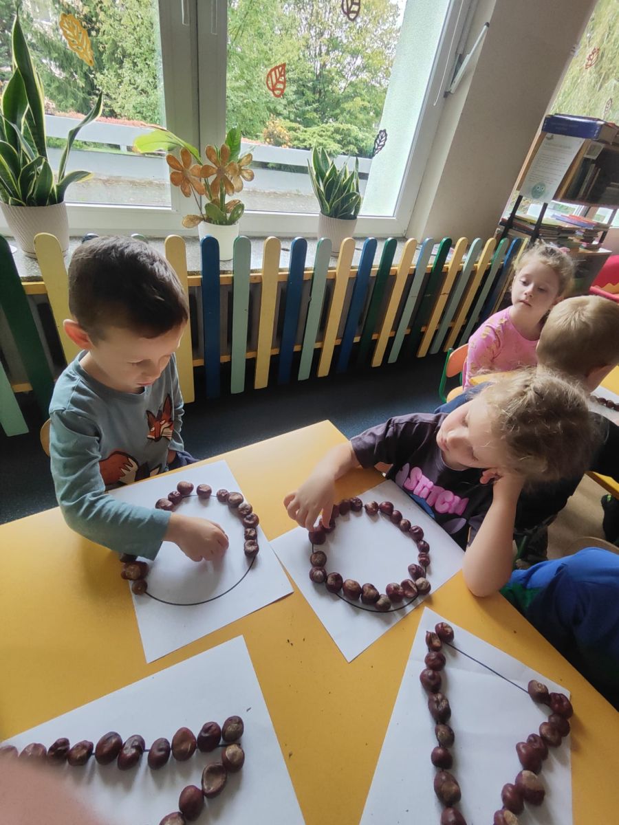 W roku szkolnym 2025/2026 dzieci z grupy Żabek biorą udział w Ogólnopolskim Projekcie Edukacyjnym "Kreatywna Matematyka". Przedszkolaki wykonały październikowe zadanie: "Matematyka w plenerze". Choć pogoda tym razem nie dopisała - nie przeszkodziło nam to w matematycznej zabawie - przenieślismy plener do naszej sali i z uśmiechem odkrywaliśmy matematyczny świat dzięki przyniesionym darom jesieni.