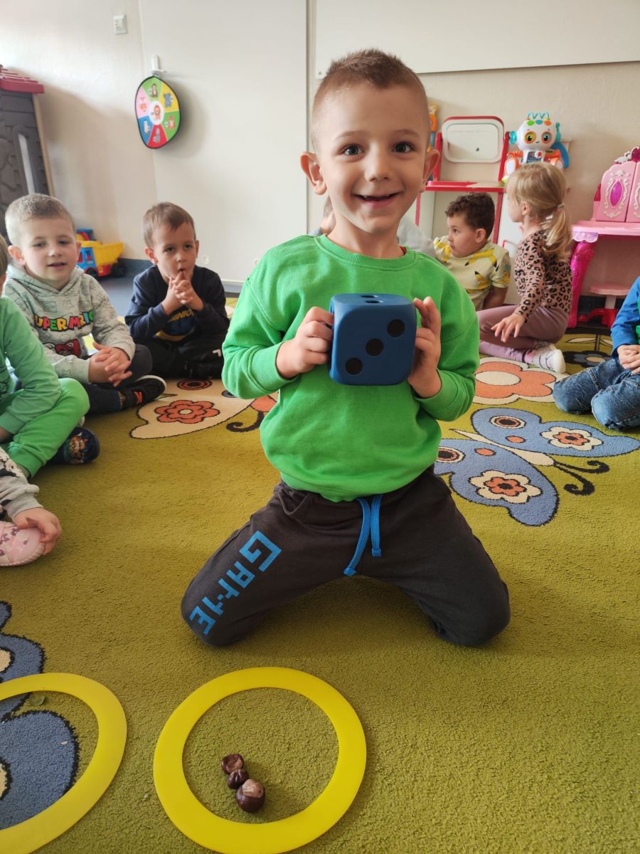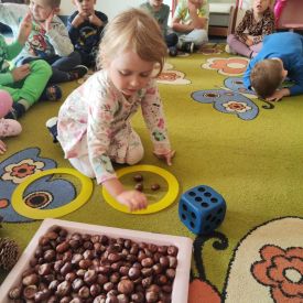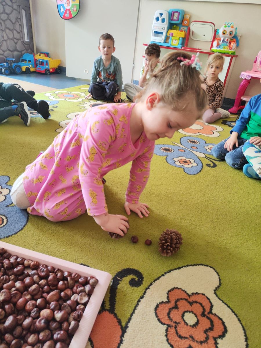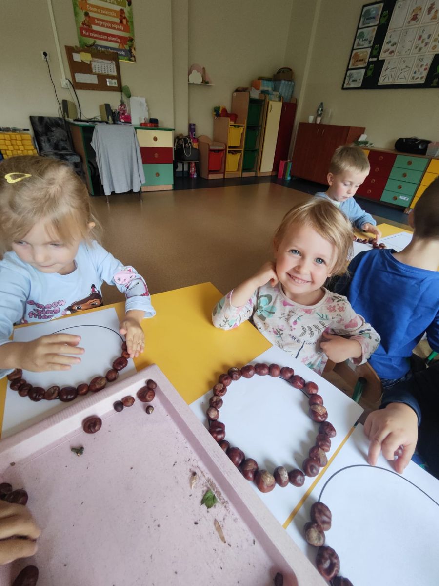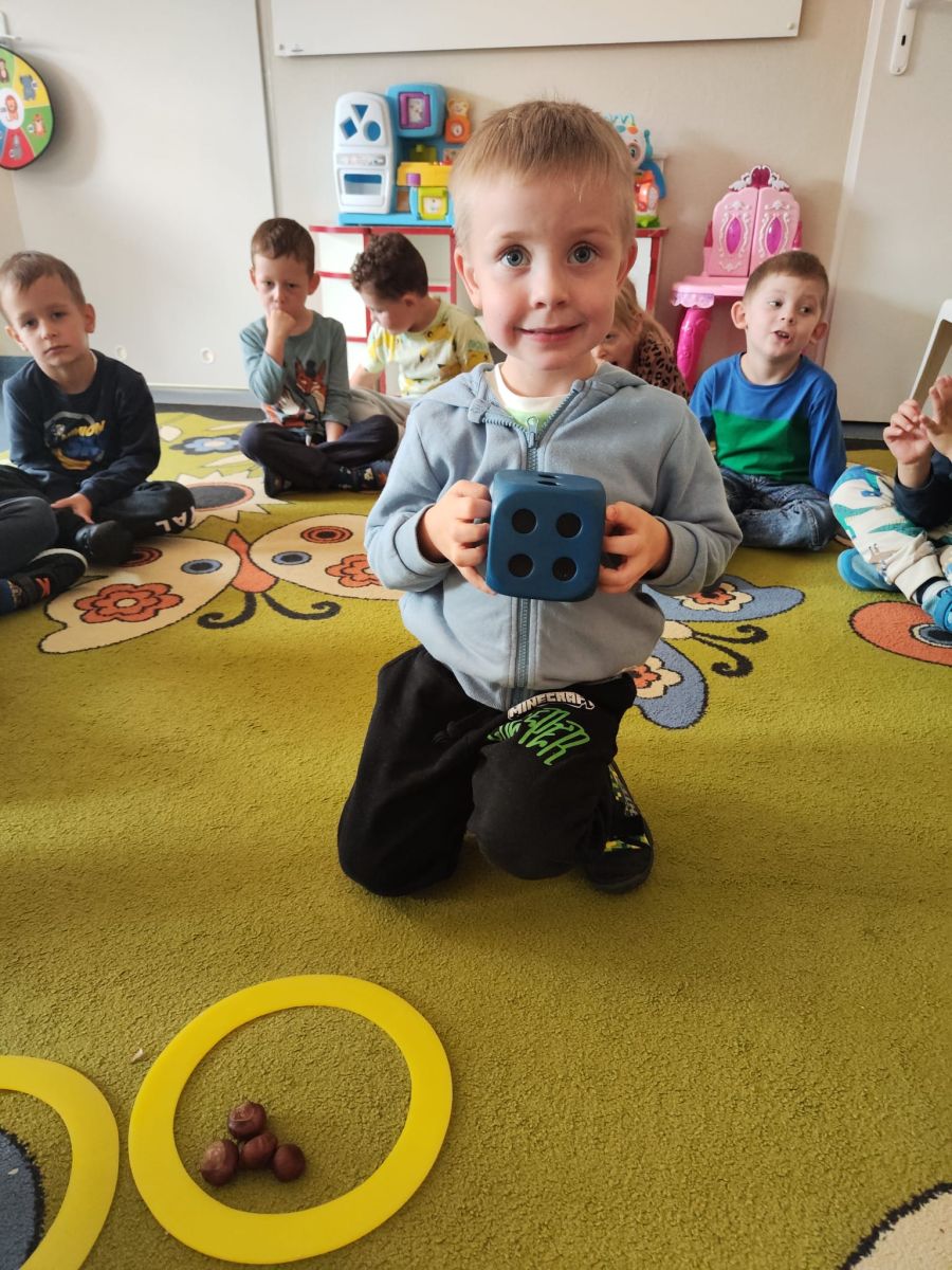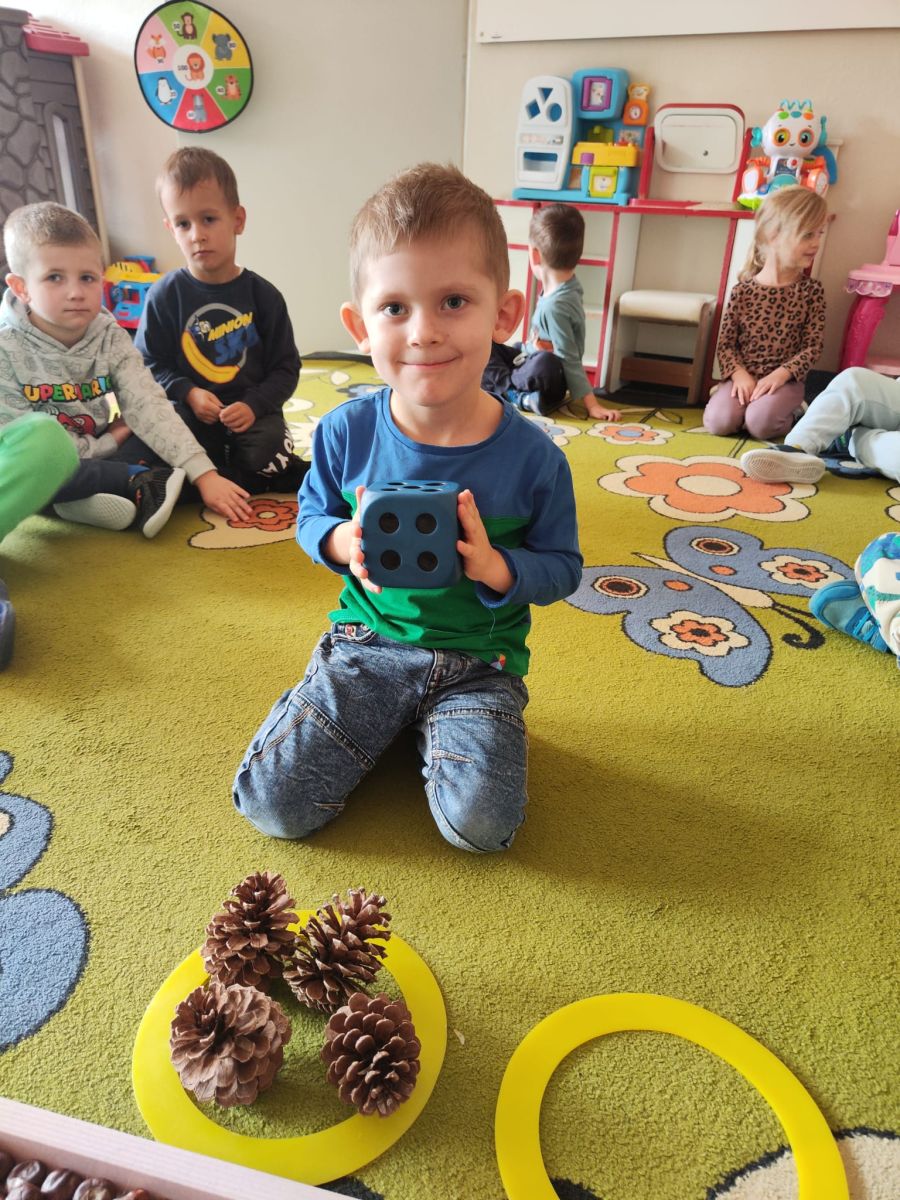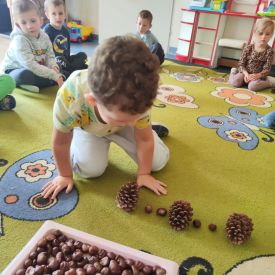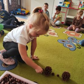 W roku szkolnym 2025/2026 dzieci z grupy Żabek biorą udział w Ogólnopolskim Projekcie Edukacyjnym "Kreatywna Matematyka". Przedszkolaki wykonały październikowe zadanie: "Matematyka w plenerze". Choć pogoda tym razem nie dopisała - nie przeszkodziło nam to w matematycznej zabawie - przenieślismy plener do naszej sali i z uśmiechem odkrywaliśmy matematyczny świat dzięki przyniesionym darom jesieni.