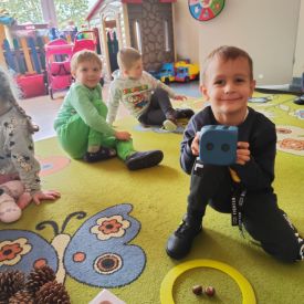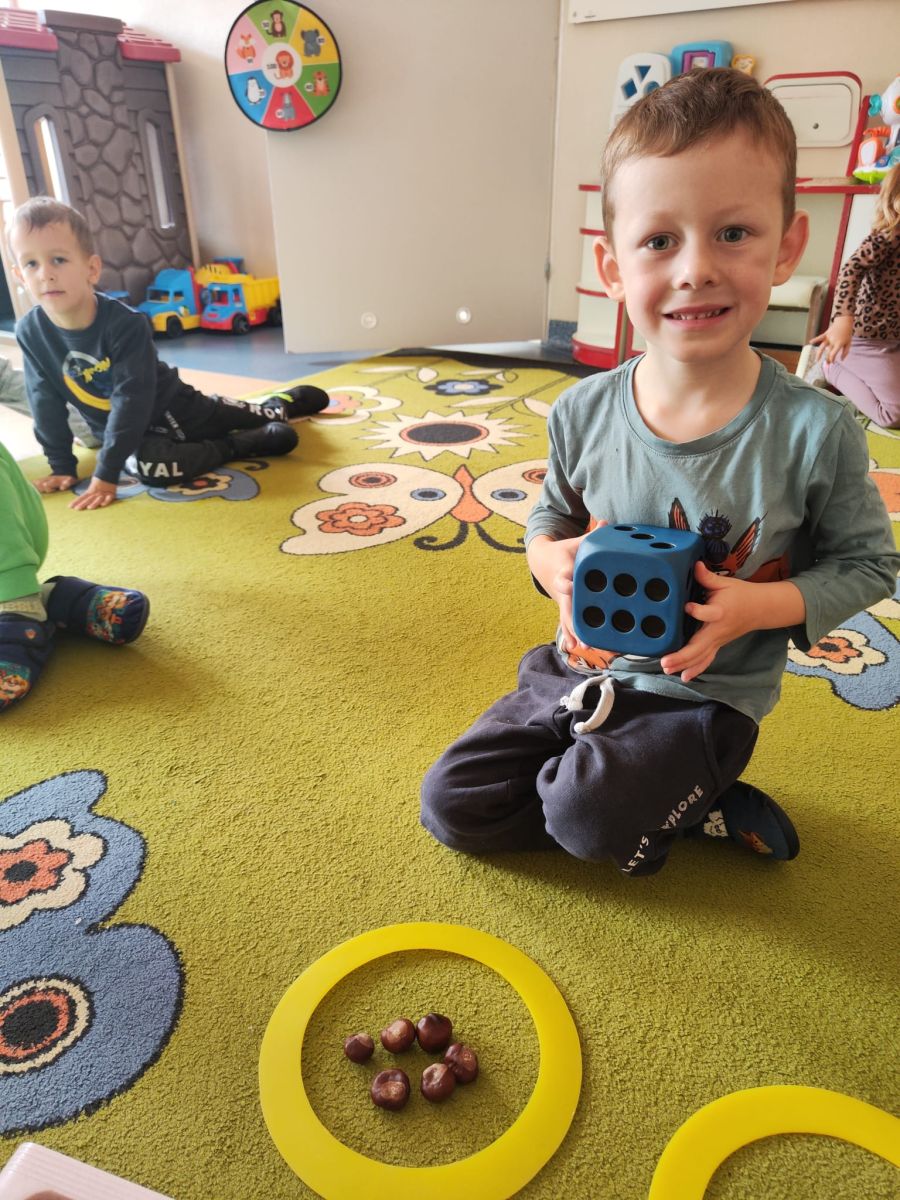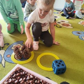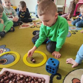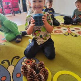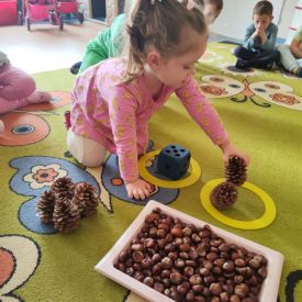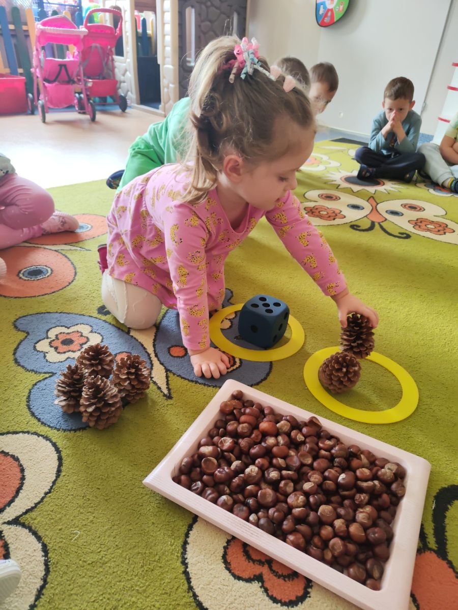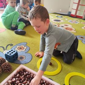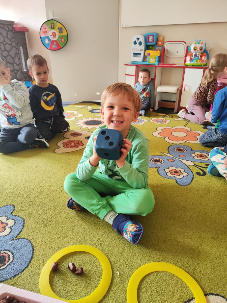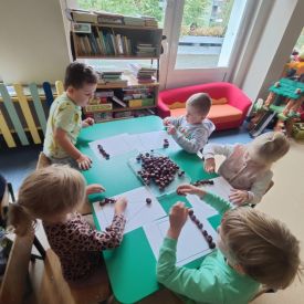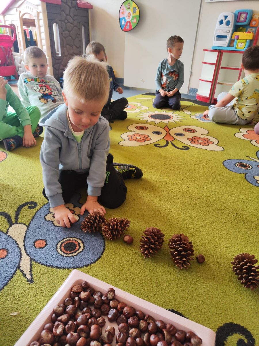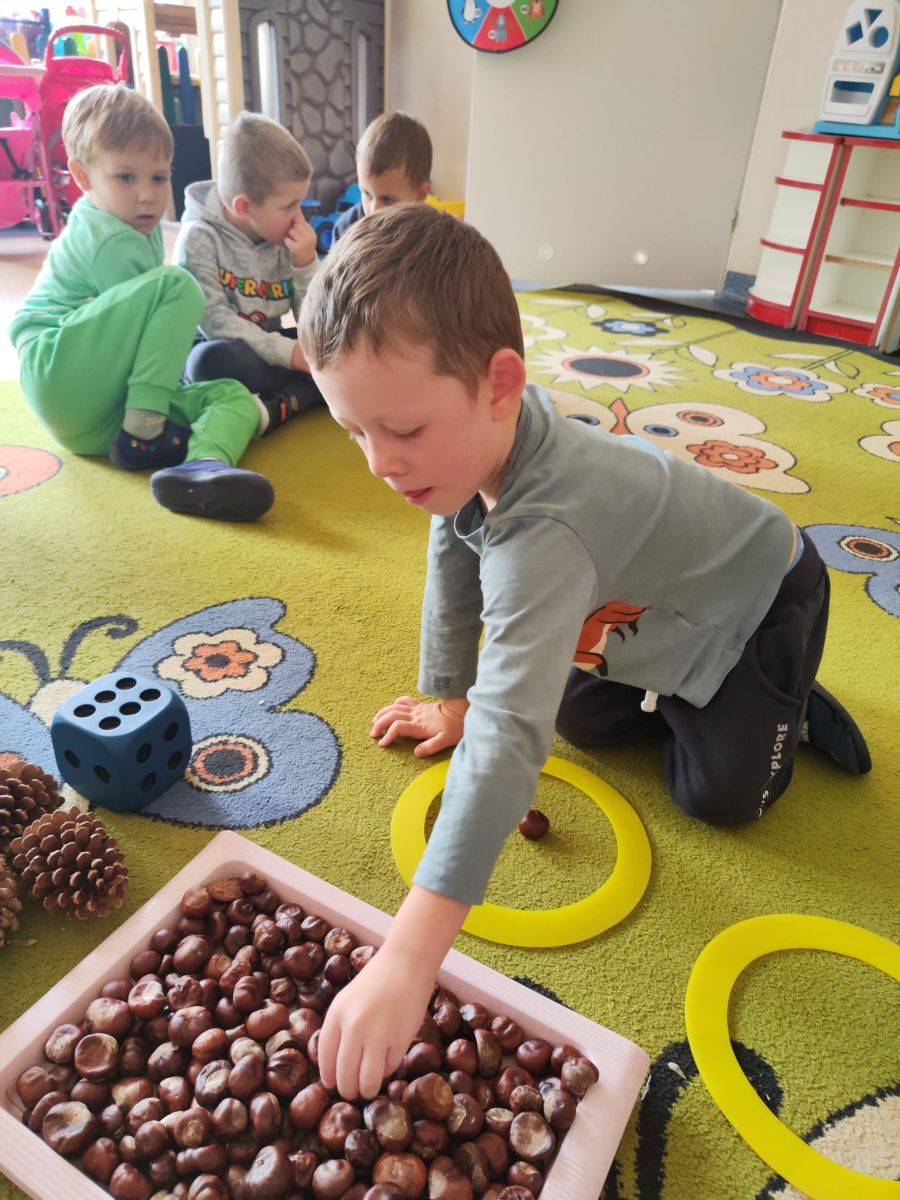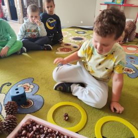 W roku szkolnym 2025/2026 dzieci z grupy Żabek biorą udział w Ogólnopolskim Projekcie Edukacyjnym "Kreatywna Matematyka". Przedszkolaki wykonały październikowe zadanie: "Matematyka w plenerze". Choć pogoda tym razem nie dopisała - nie przeszkodziło nam to w matematycznej zabawie - przenieślismy plener do naszej sali i z uśmiechem odkrywaliśmy matematyczny świat dzięki przyniesionym darom jesieni.