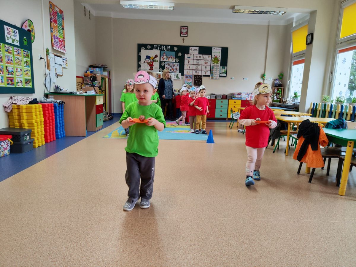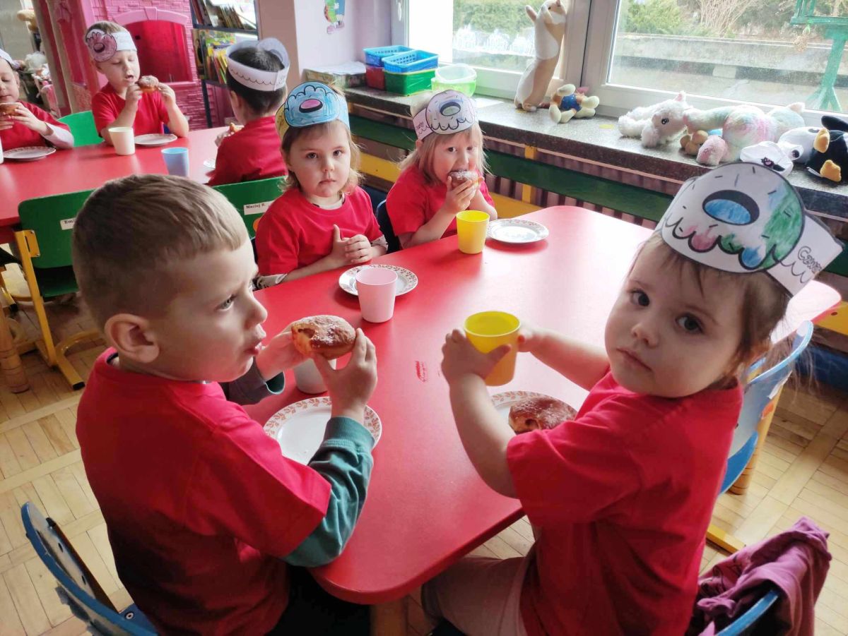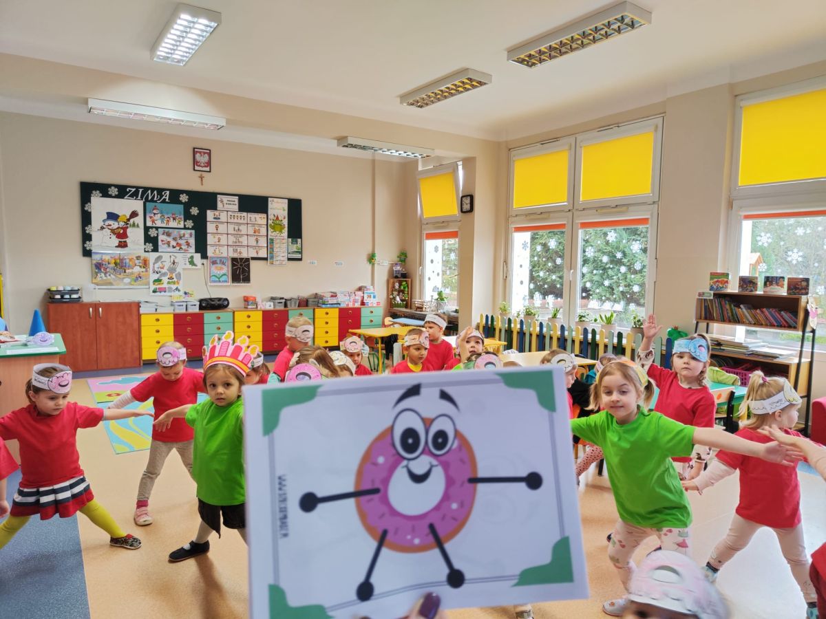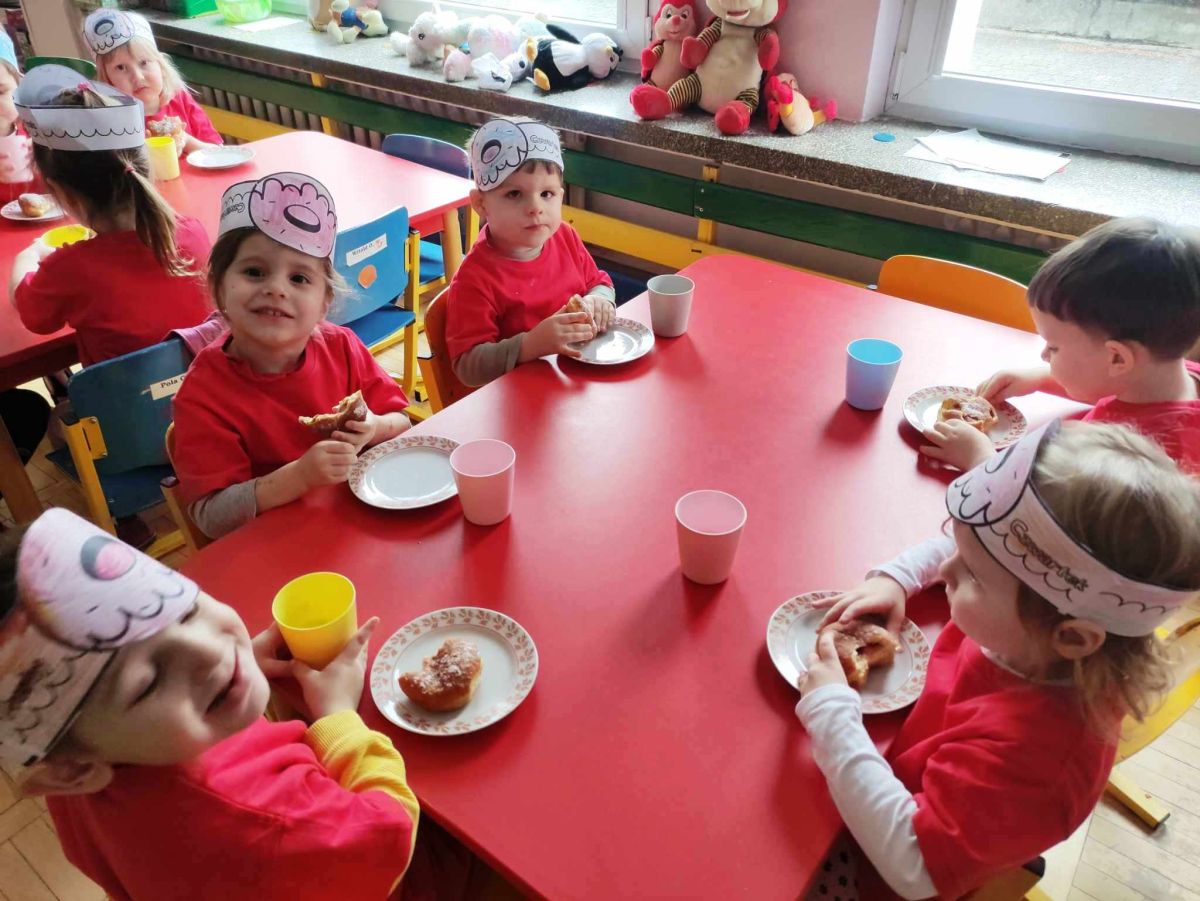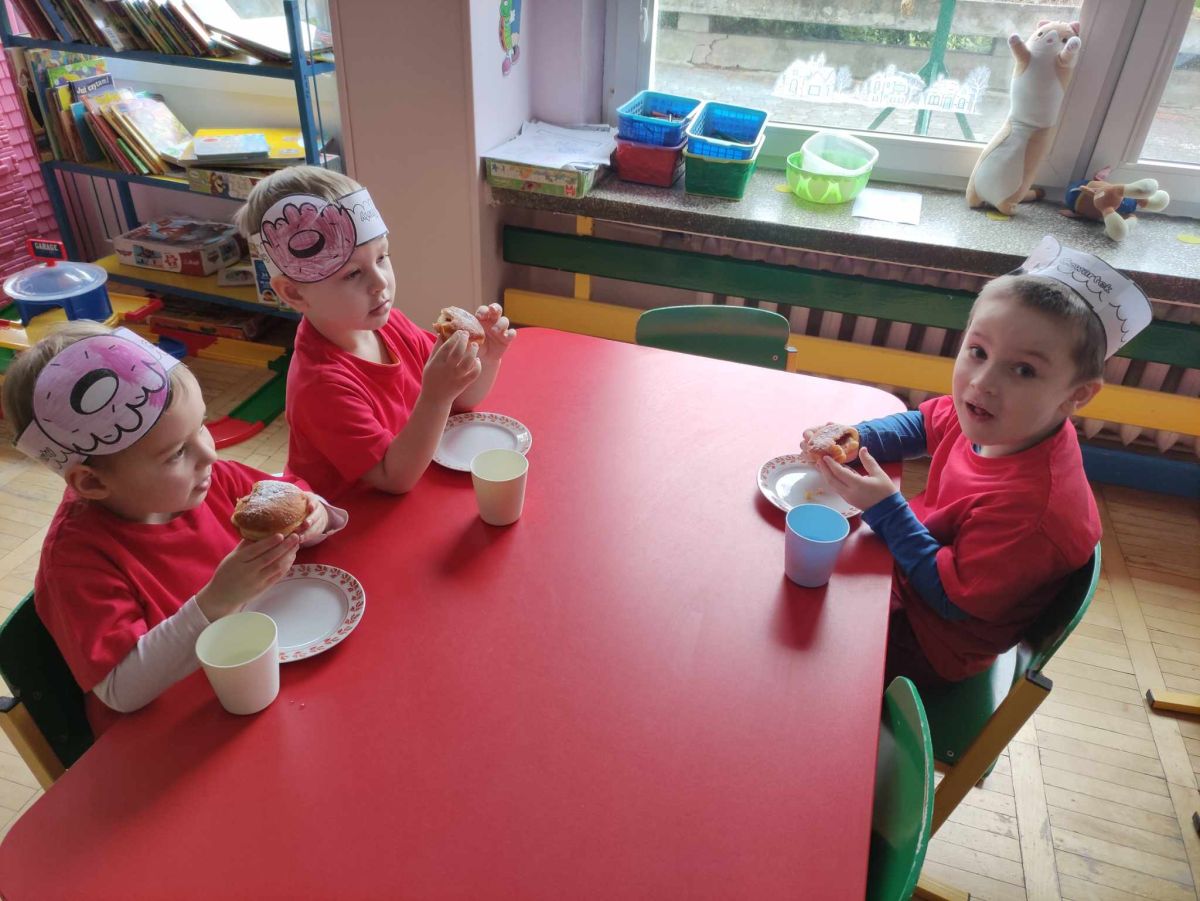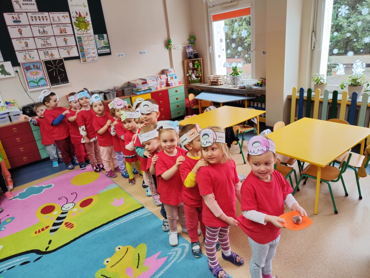 Dzieci z grupy I "Biedronki" i II "Żabki" pokolorowały papierowe opaski z pączkiem. Następnie obejrzały filmik edukacyjny "Jak powstają pączki?" Przedszkolaki wspólnie uczestniczyły w "pączkowej gimnastyce" oraz rywalizowały w "wyścigu z pączkiem". Na zakończenie zabawy dzieci zaśpiewały piosenkę "Z rączek do rączek wędruje pączek" oraz zjadły pączki.