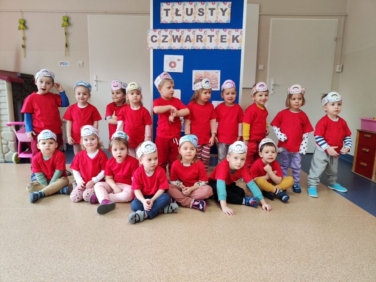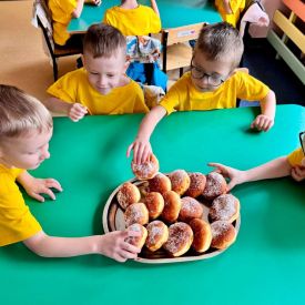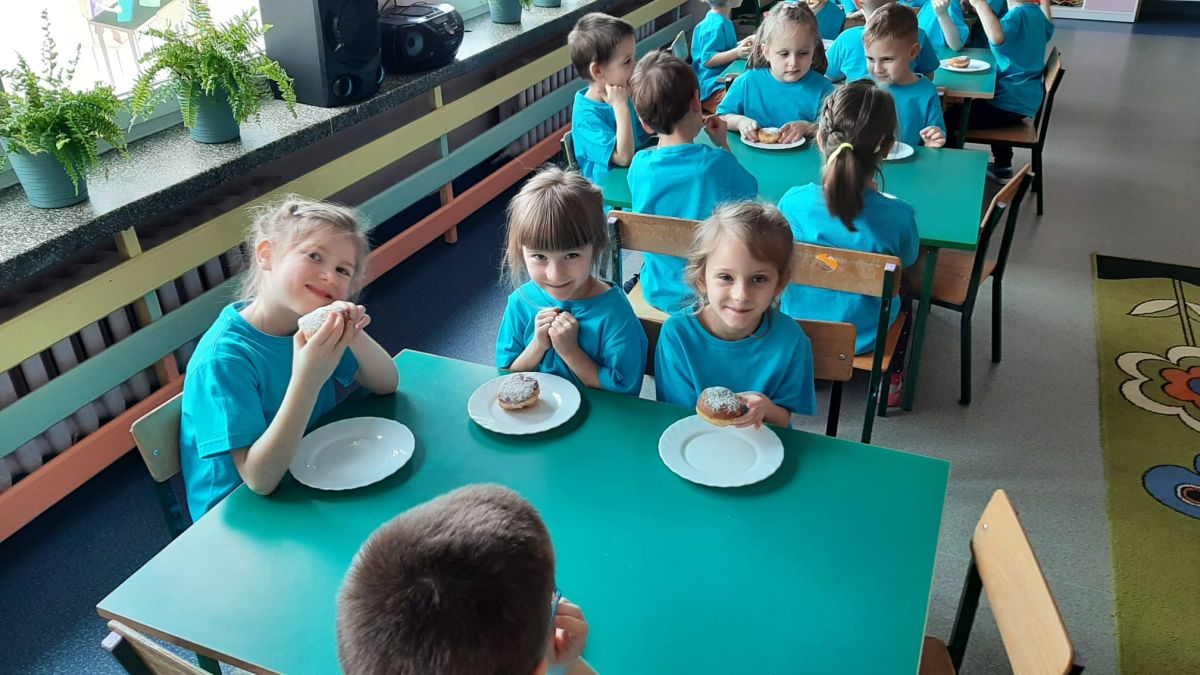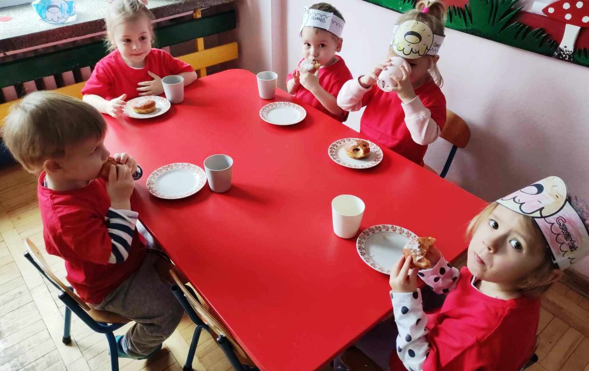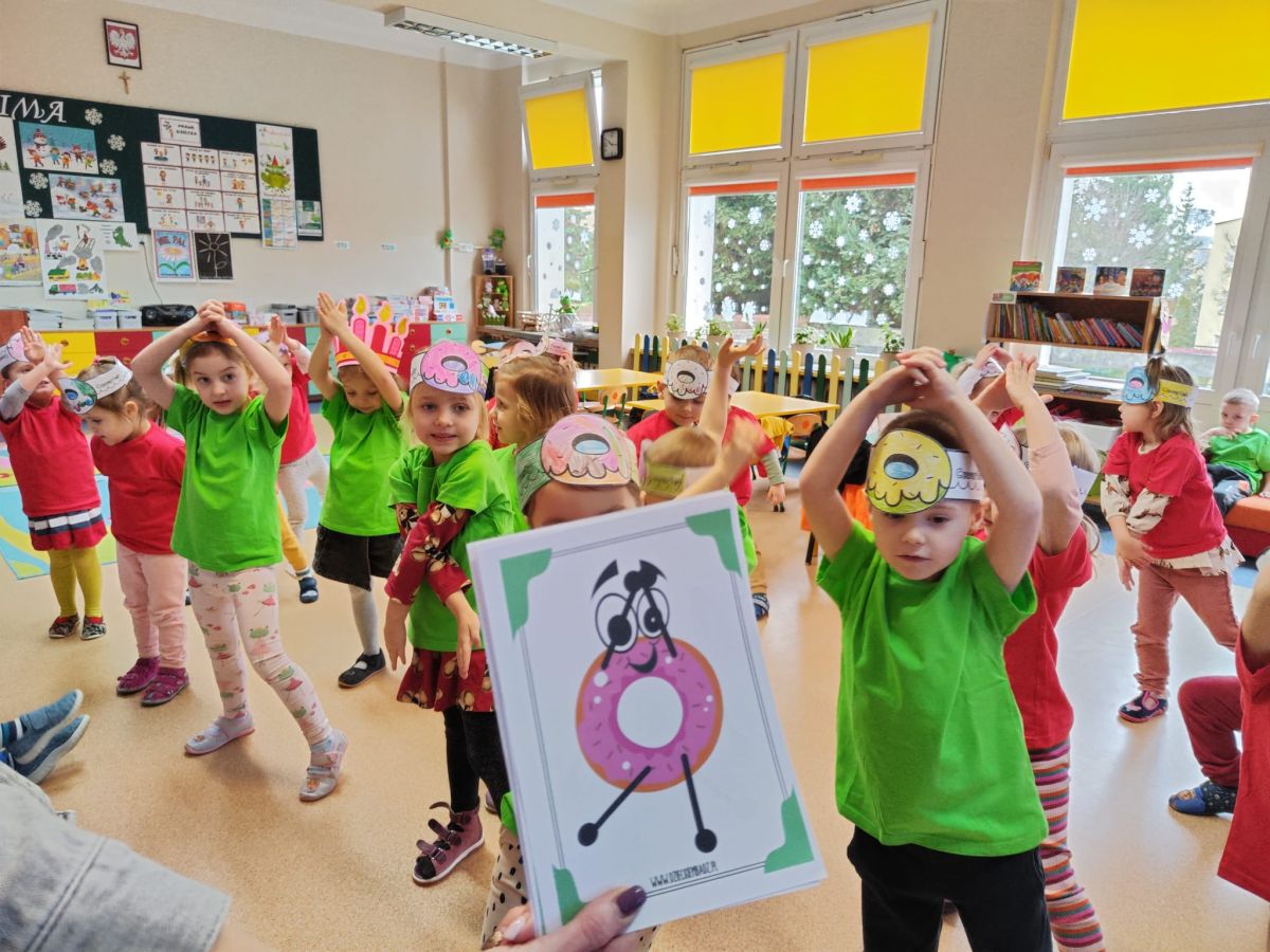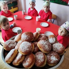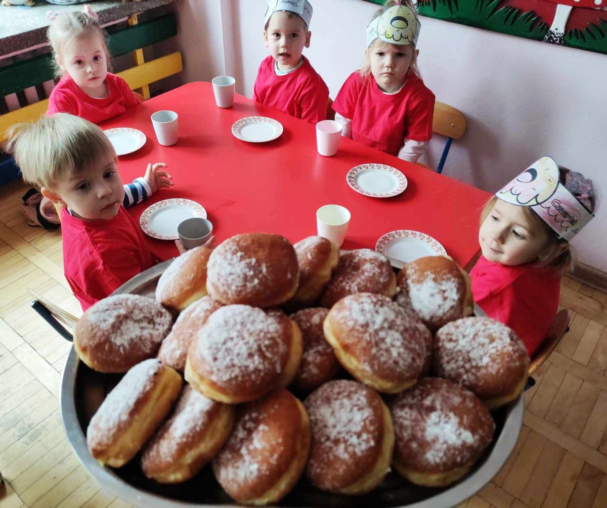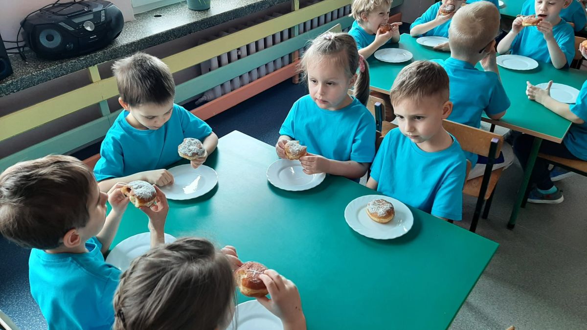 Dzieci z grupy I "Biedronki" i II "Żabki" pokolorowały papierowe opaski z pączkiem. Następnie obejrzały filmik edukacyjny "Jak powstają pączki?" Przedszkolaki wspólnie uczestniczyły w "pączkowej gimnastyce" oraz rywalizowały w "wyścigu z pączkiem". Na zakończenie zabawy dzieci zaśpiewały piosenkę "Z rączek do rączek wędruje pączek" oraz zjadły pączki.