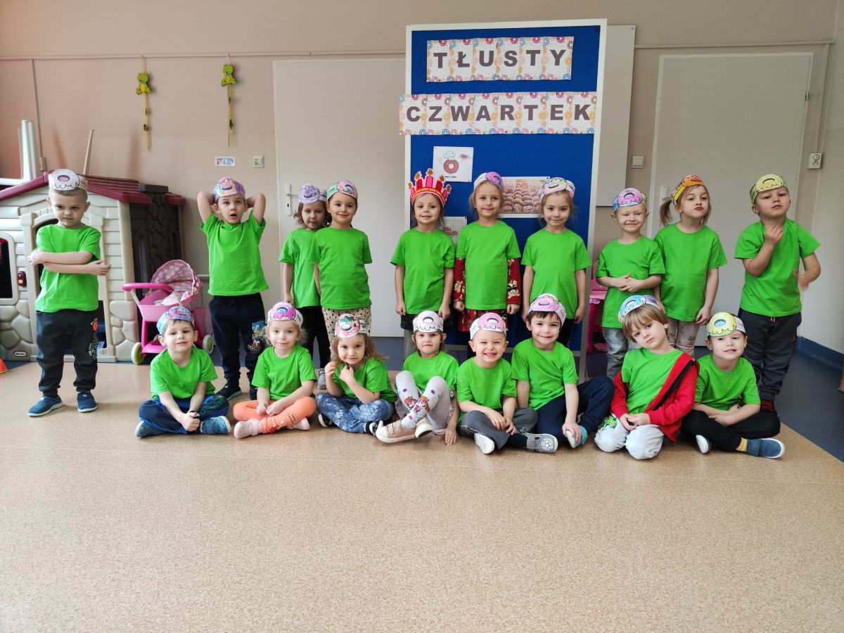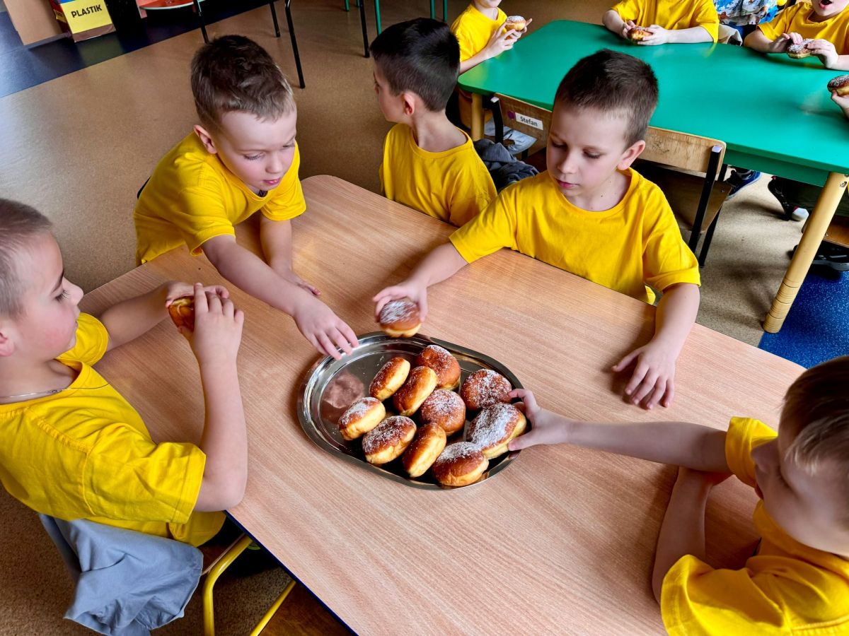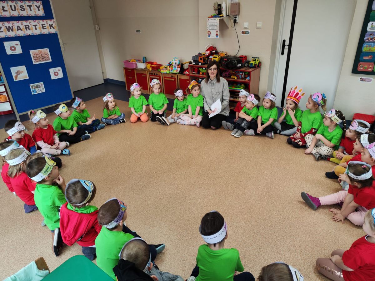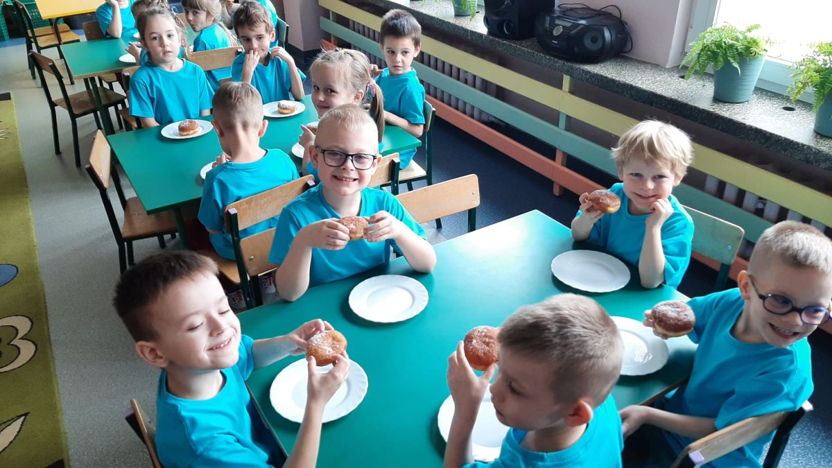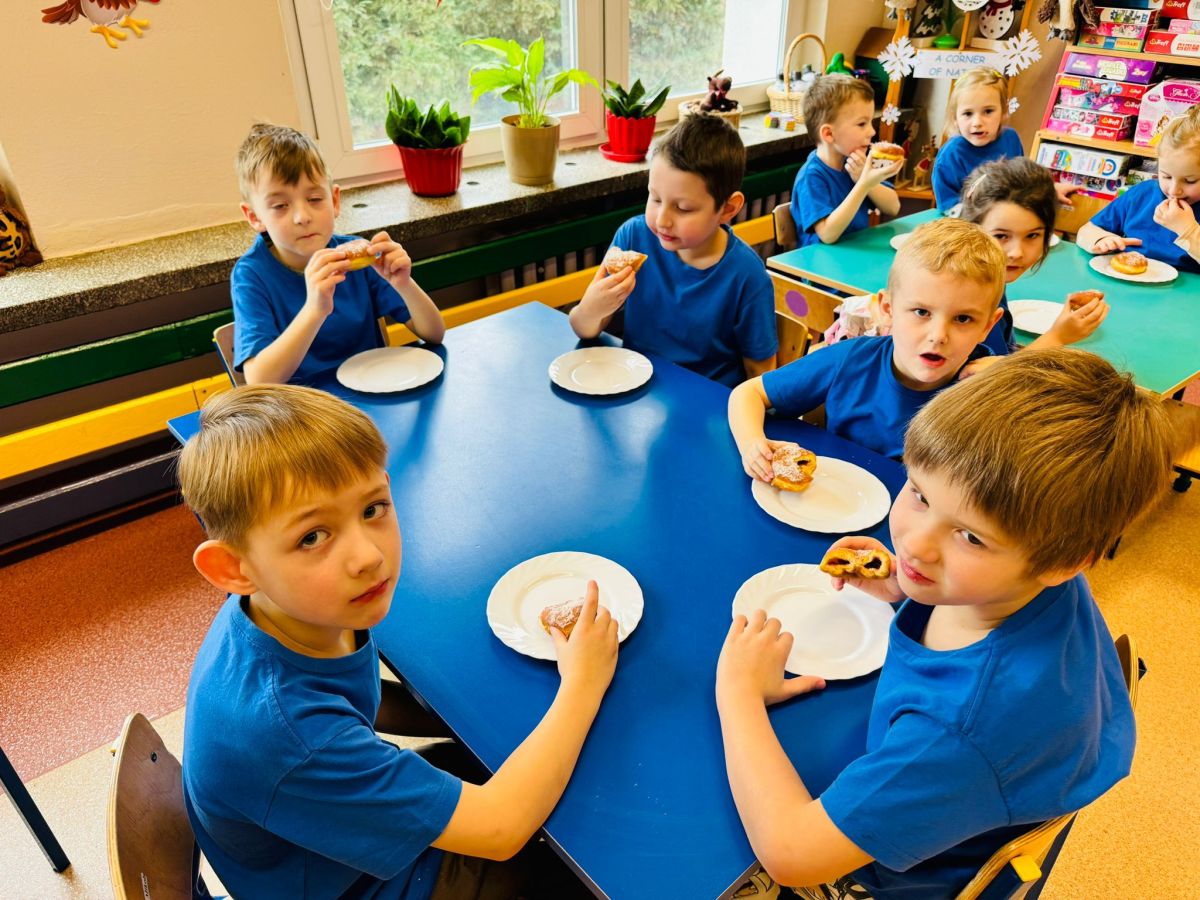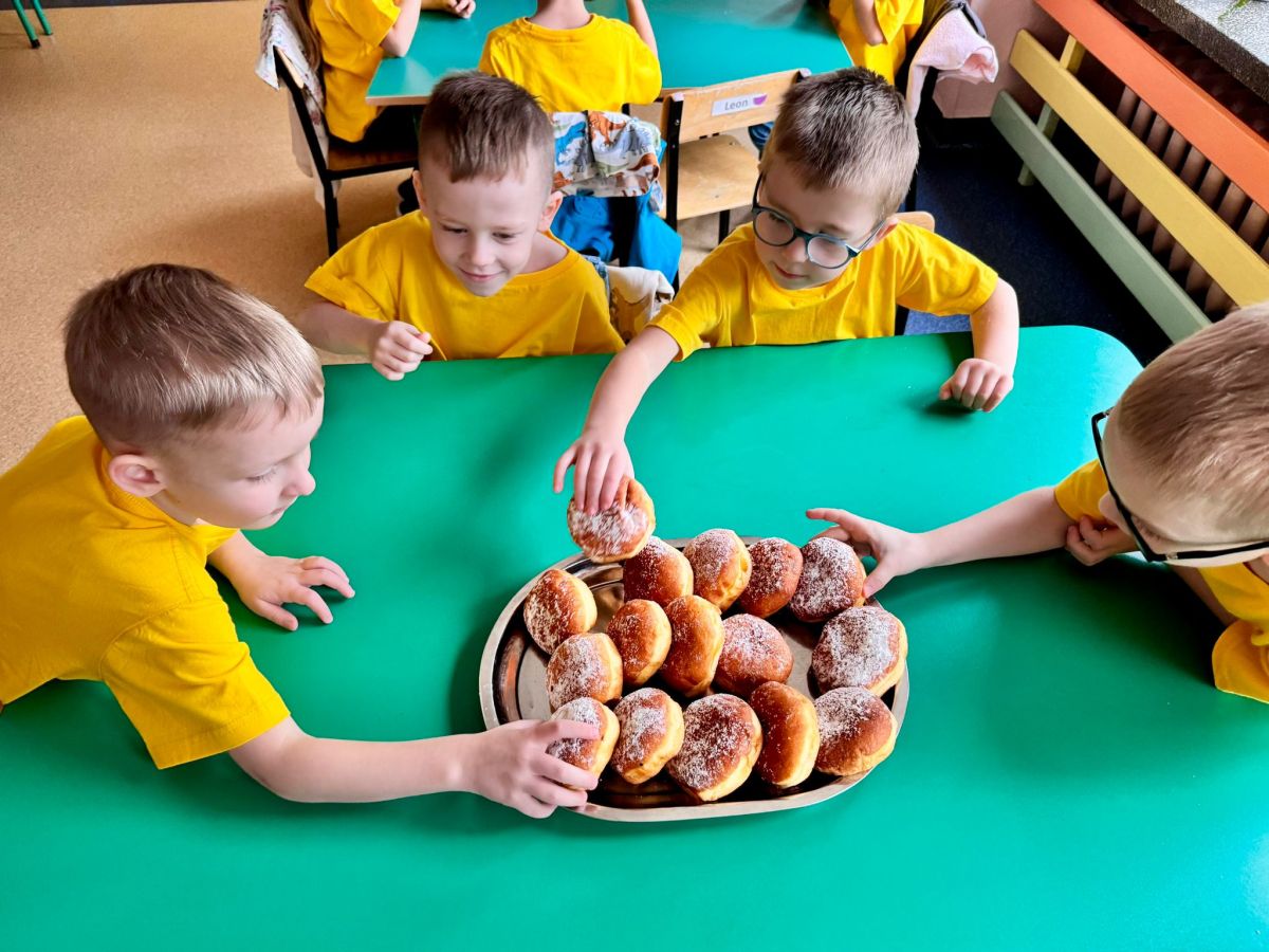 Dzieci z grupy I "Biedronki" i II "Żabki" pokolorowały papierowe opaski z pączkiem. Następnie obejrzały filmik edukacyjny "Jak powstają pączki?" Przedszkolaki wspólnie uczestniczyły w "pączkowej gimnastyce" oraz rywalizowały w "wyścigu z pączkiem". Na zakończenie zabawy dzieci zaśpiewały piosenkę "Z rączek do rączek wędruje pączek" oraz zjadły pączki.