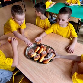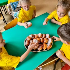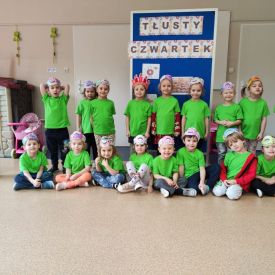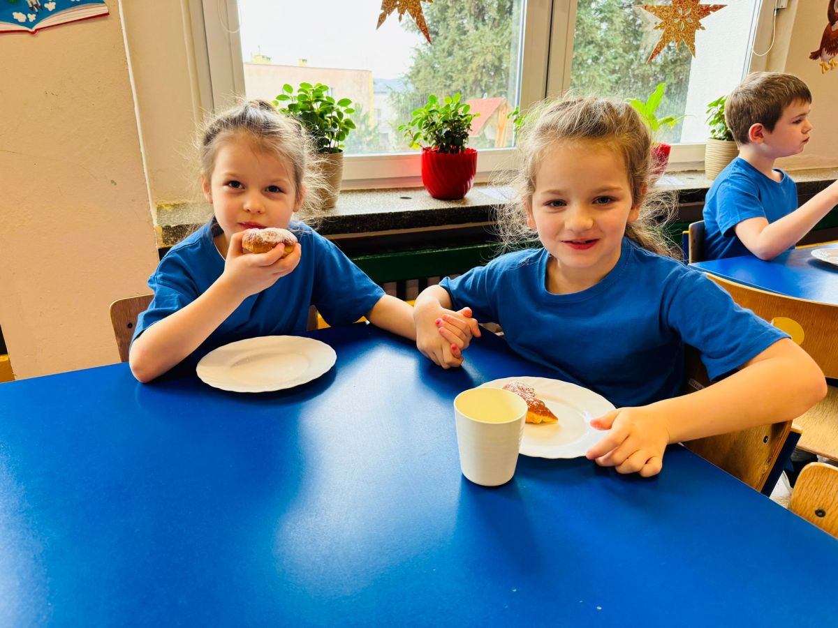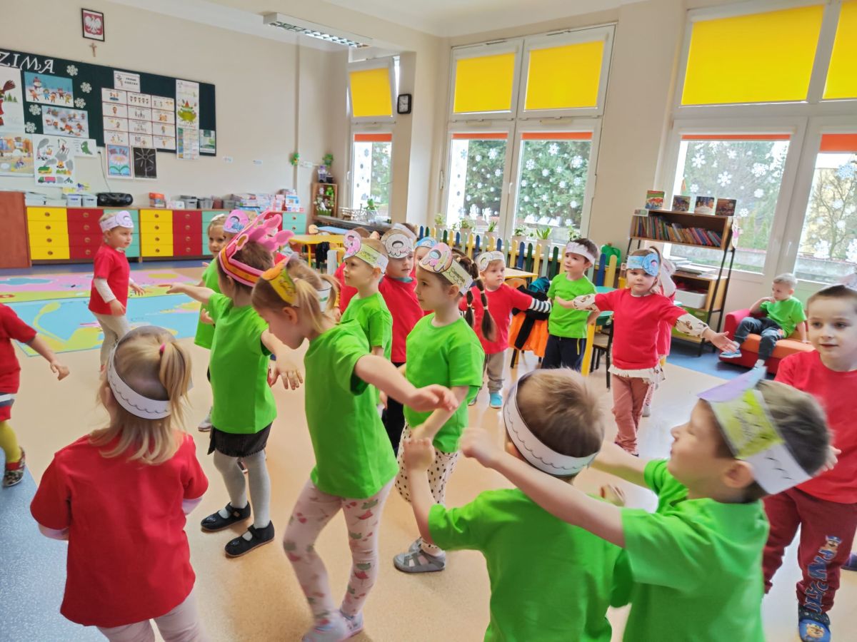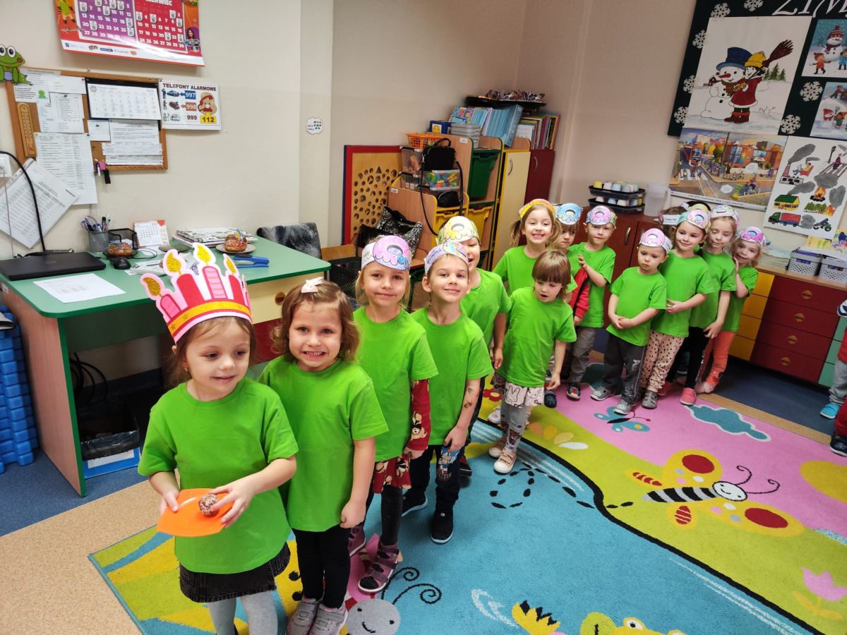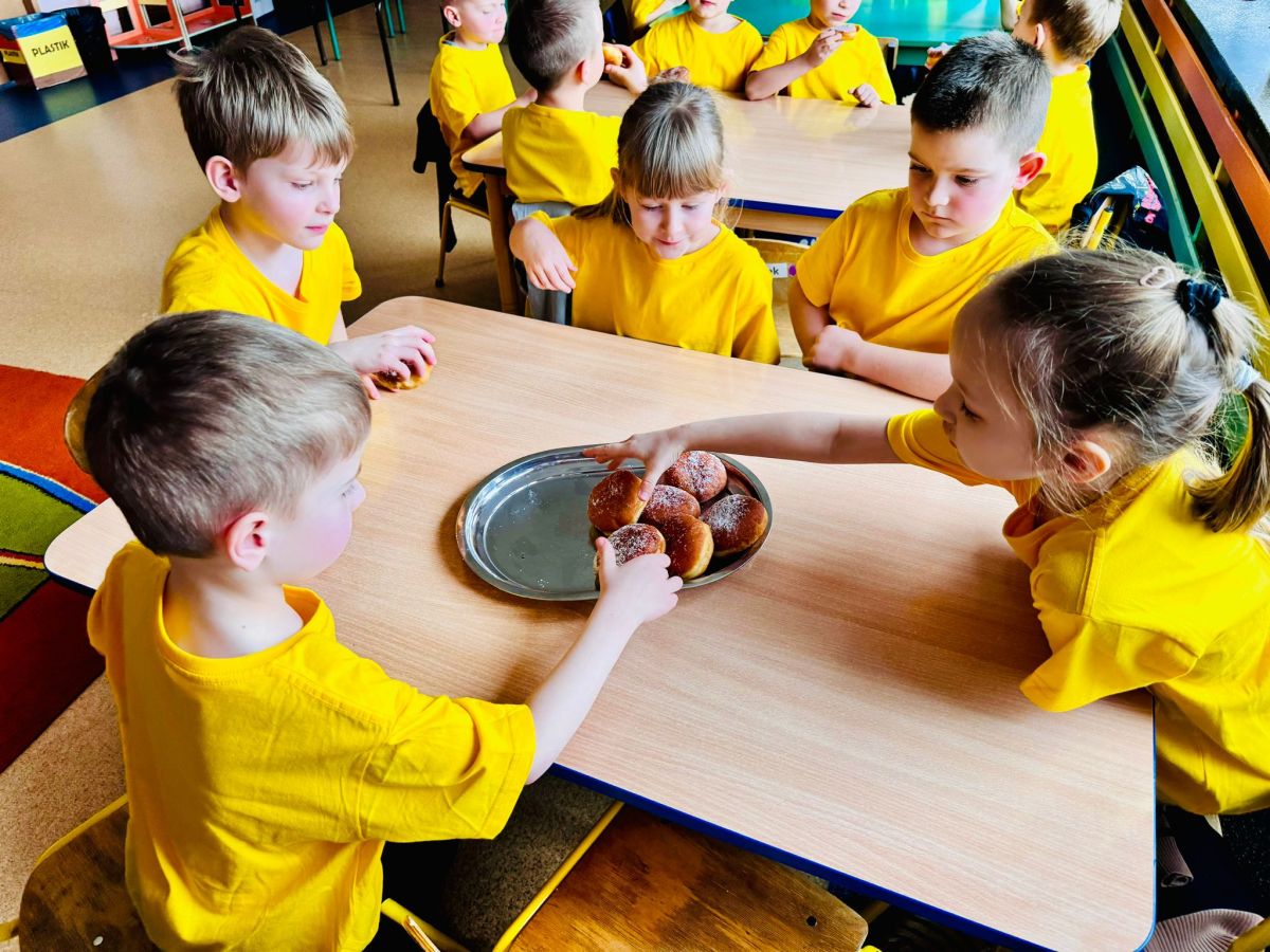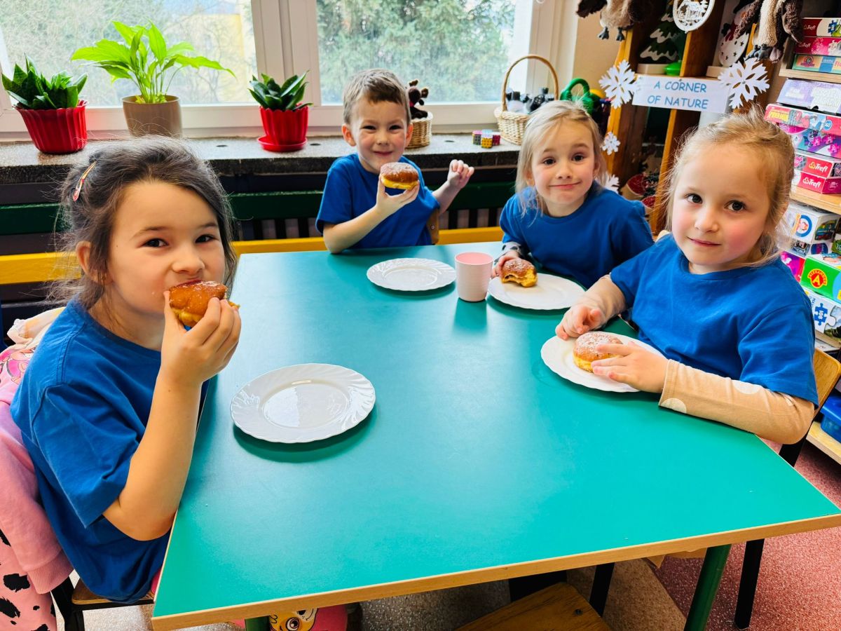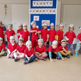 Dzieci z grupy I "Biedronki" i II "Żabki" pokolorowały papierowe opaski z pączkiem. Następnie obejrzały filmik edukacyjny "Jak powstają pączki?" Przedszkolaki wspólnie uczestniczyły w "pączkowej gimnastyce" oraz rywalizowały w "wyścigu z pączkiem". Na zakończenie zabawy dzieci zaśpiewały piosenkę "Z rączek do rączek wędruje pączek" oraz zjadły pączki.