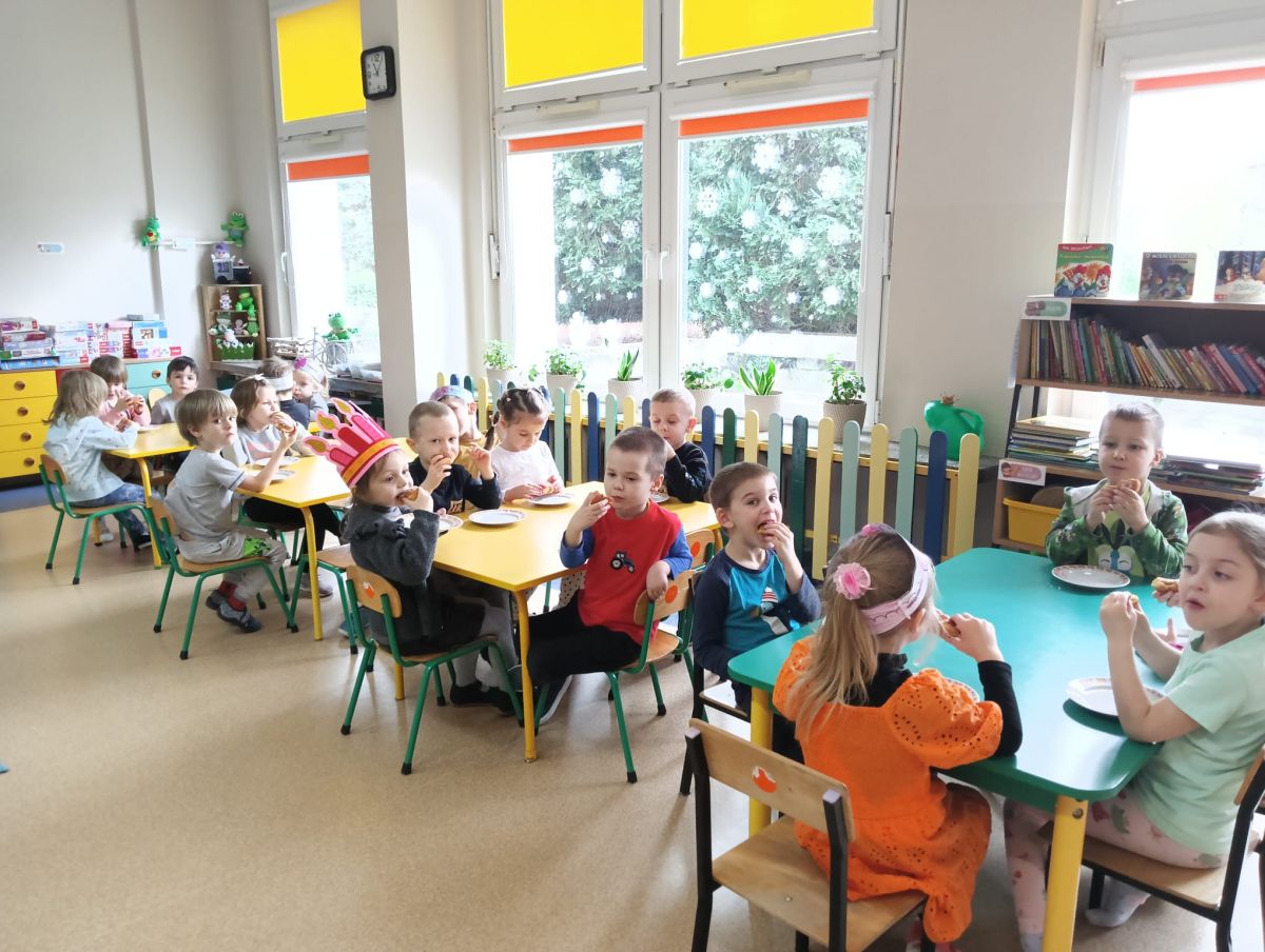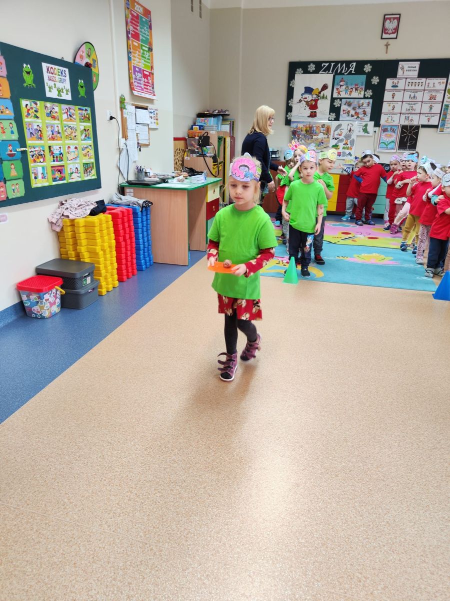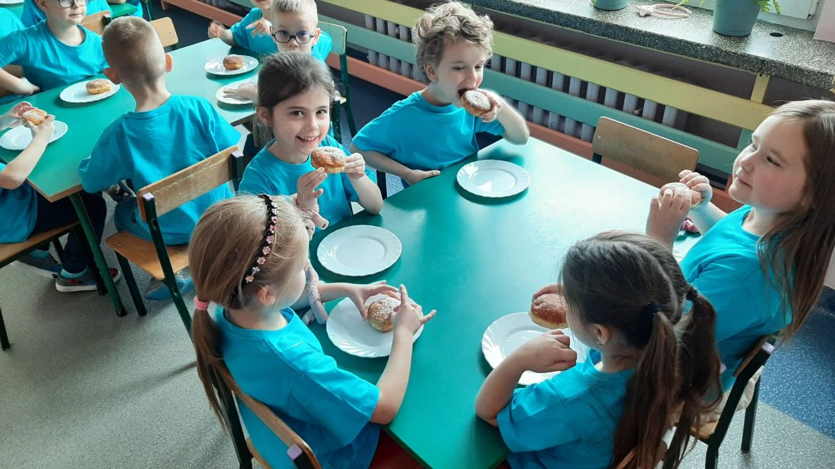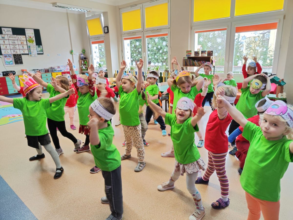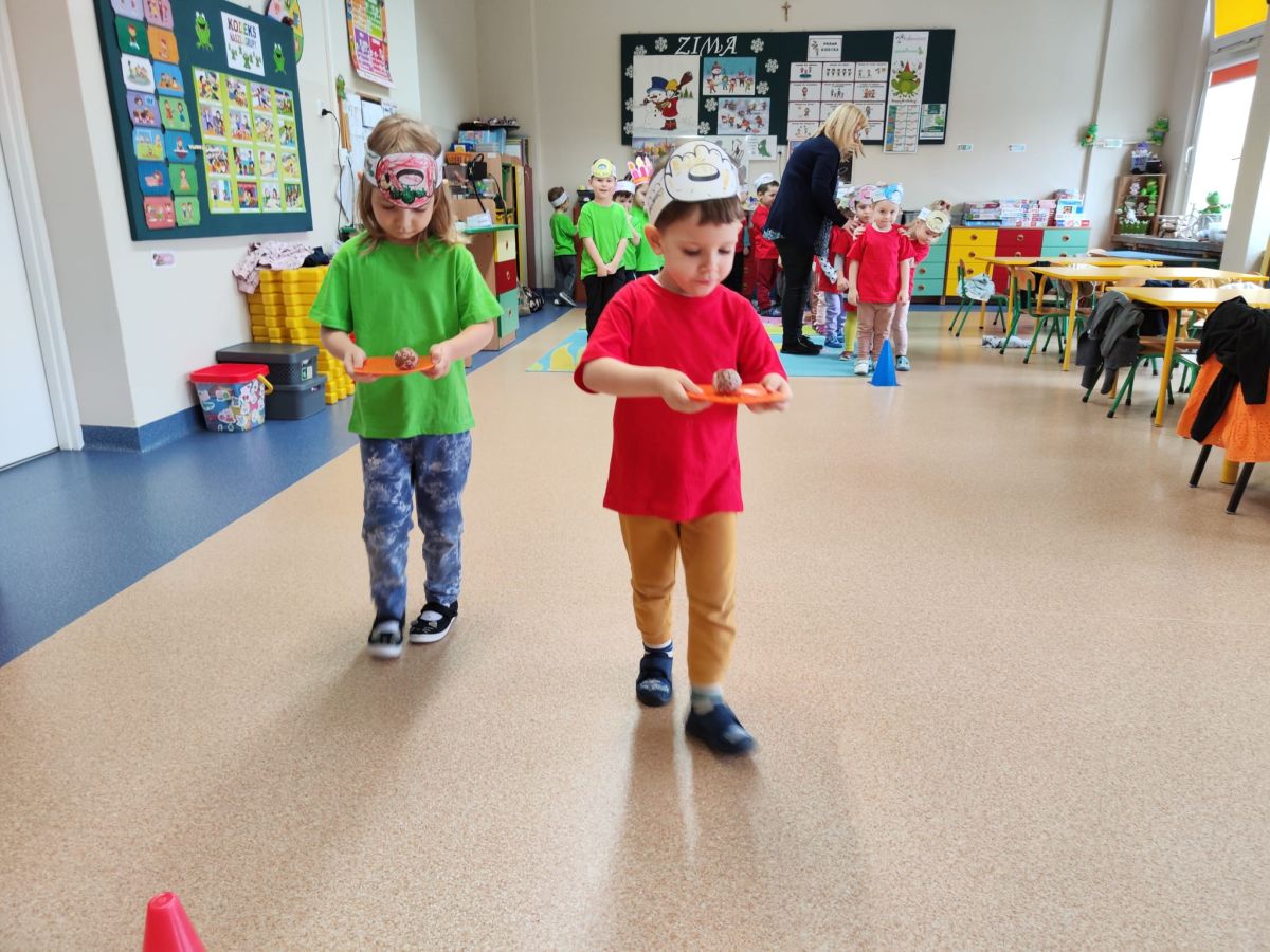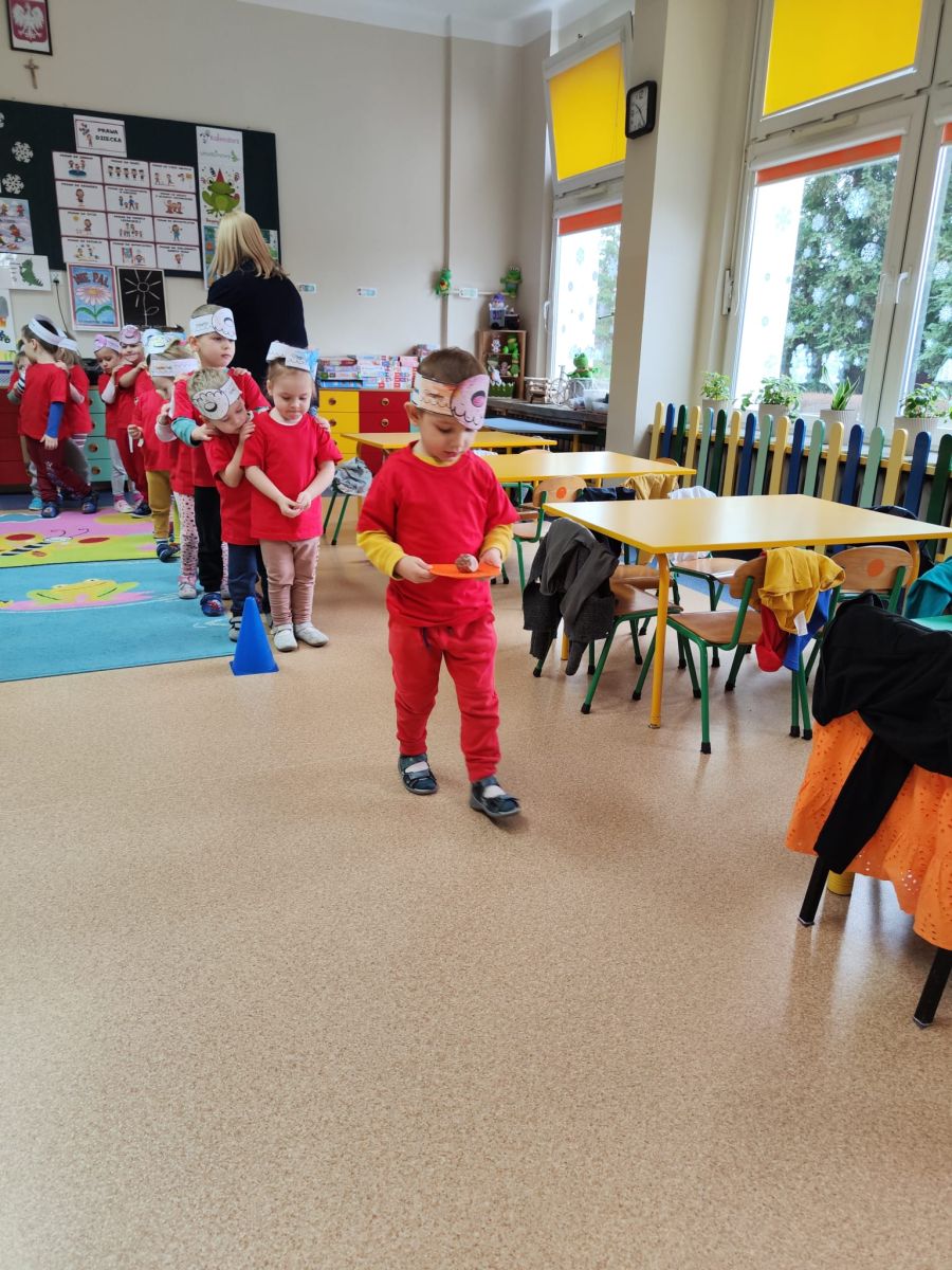 Dzieci z grupy I "Biedronki" i II "Żabki" pokolorowały papierowe opaski z pączkiem. Następnie obejrzały filmik edukacyjny "Jak powstają pączki?" Przedszkolaki wspólnie uczestniczyły w "pączkowej gimnastyce" oraz rywalizowały w "wyścigu z pączkiem". Na zakończenie zabawy dzieci zaśpiewały piosenkę "Z rączek do rączek wędruje pączek" oraz zjadły pączki.