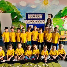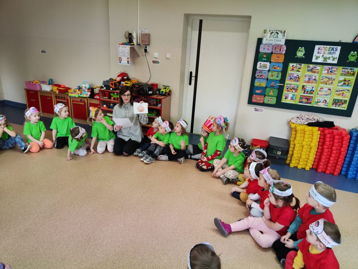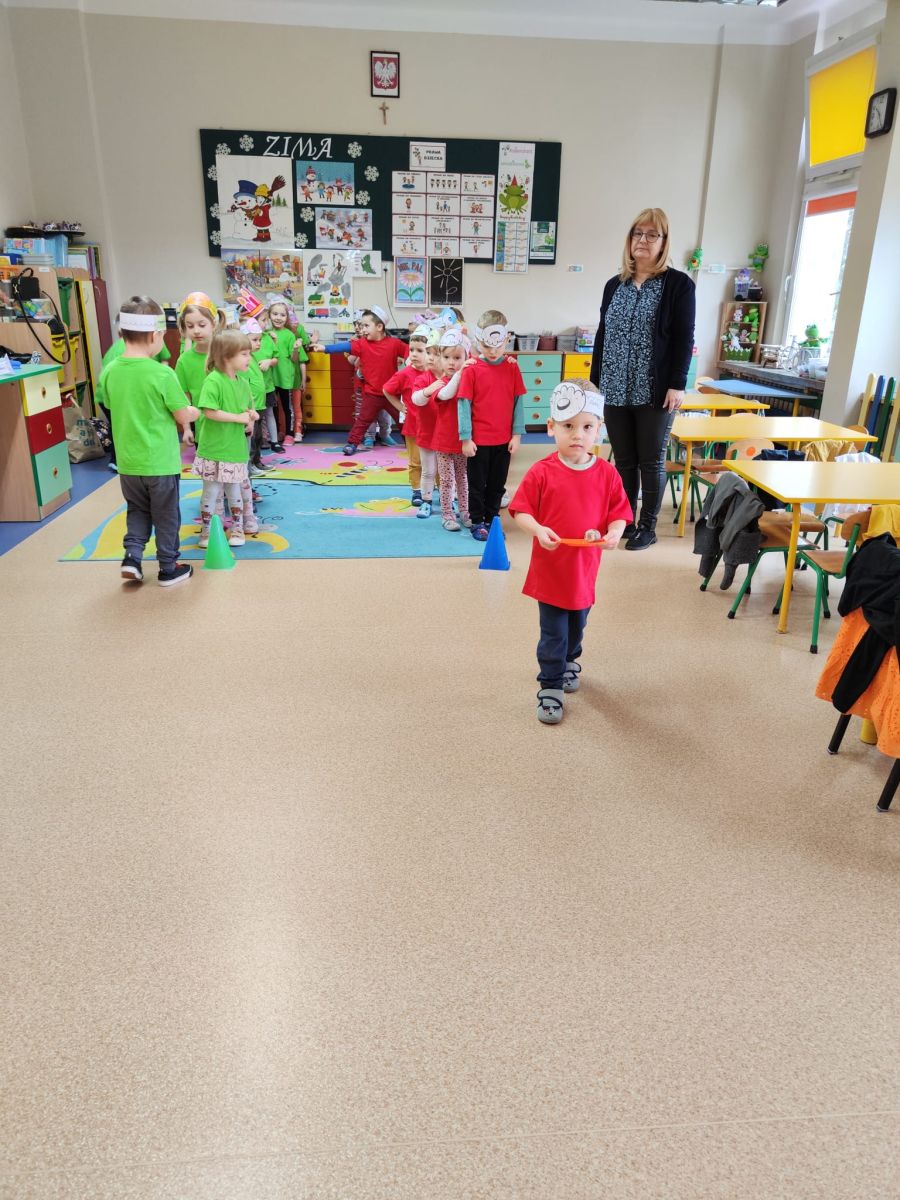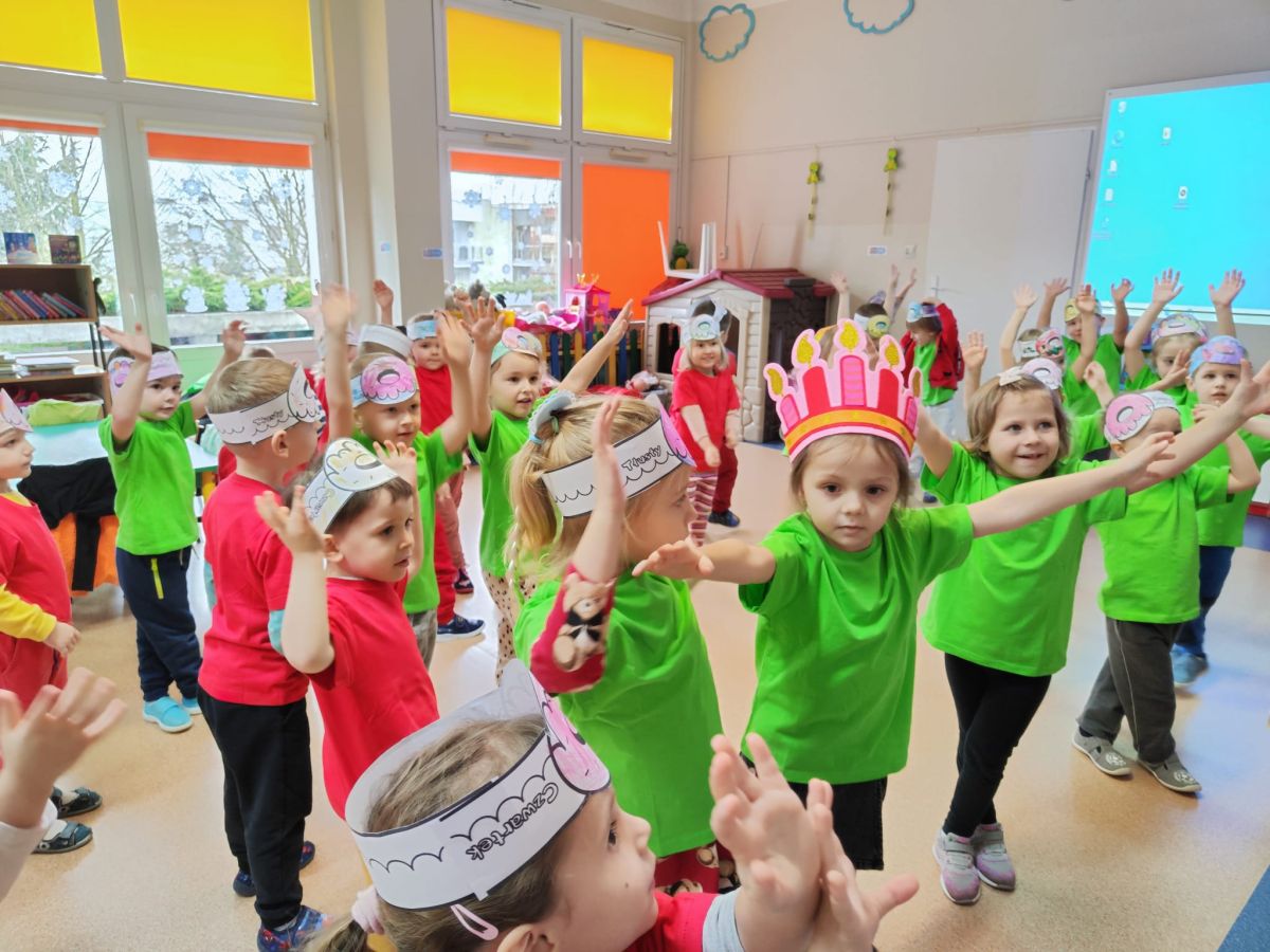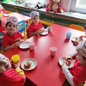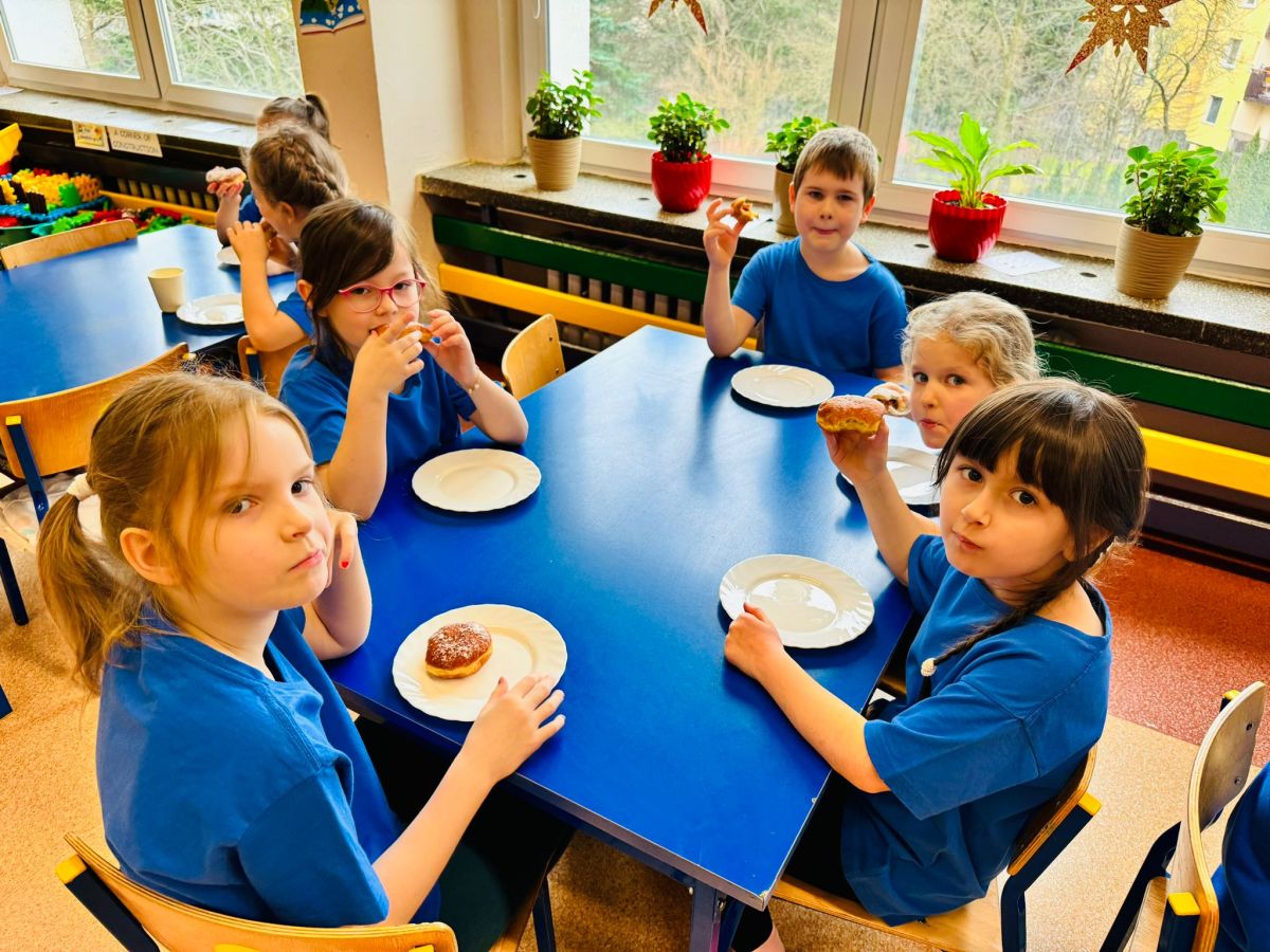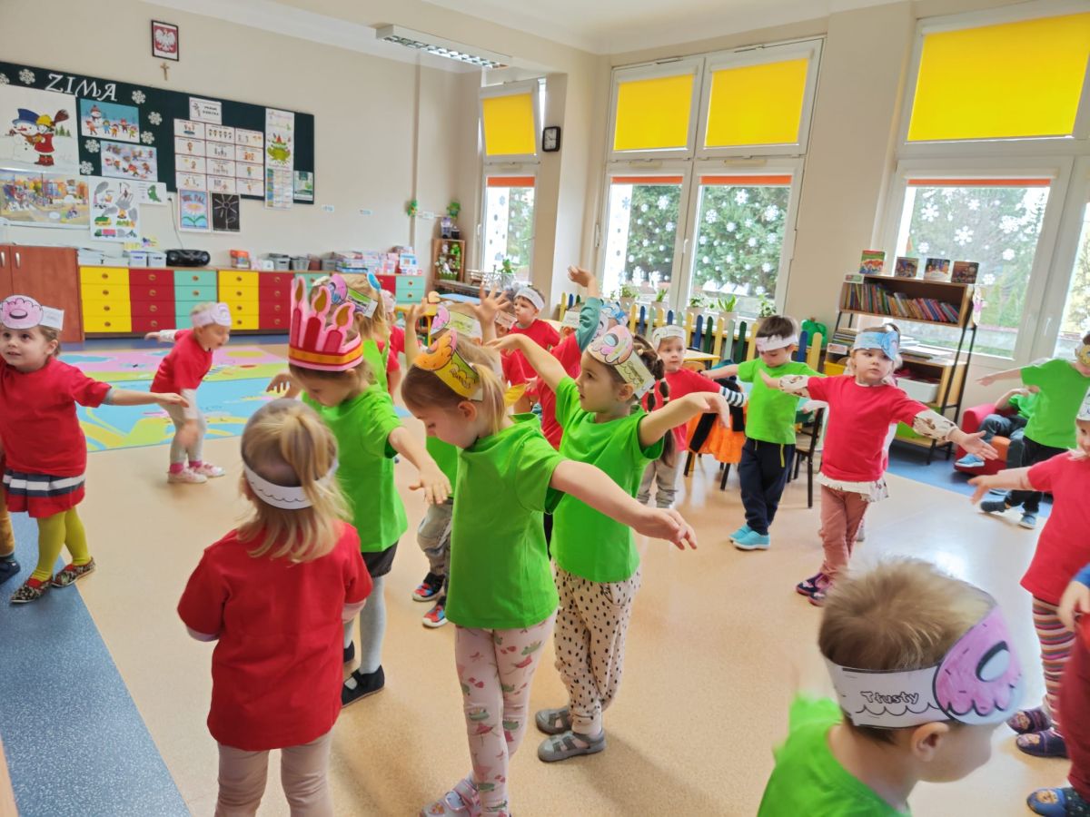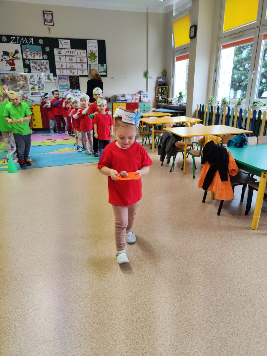 Dzieci z grupy I "Biedronki" i II "Żabki" pokolorowały papierowe opaski z pączkiem. Następnie obejrzały filmik edukacyjny "Jak powstają pączki?" Przedszkolaki wspólnie uczestniczyły w "pączkowej gimnastyce" oraz rywalizowały w "wyścigu z pączkiem". Na zakończenie zabawy dzieci zaśpiewały piosenkę "Z rączek do rączek wędruje pączek" oraz zjadły pączki.