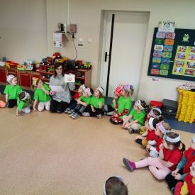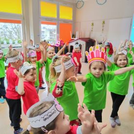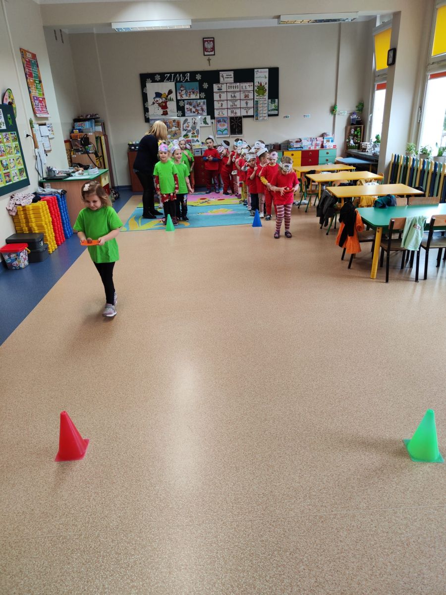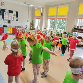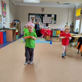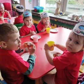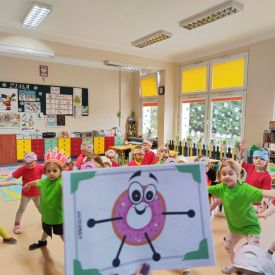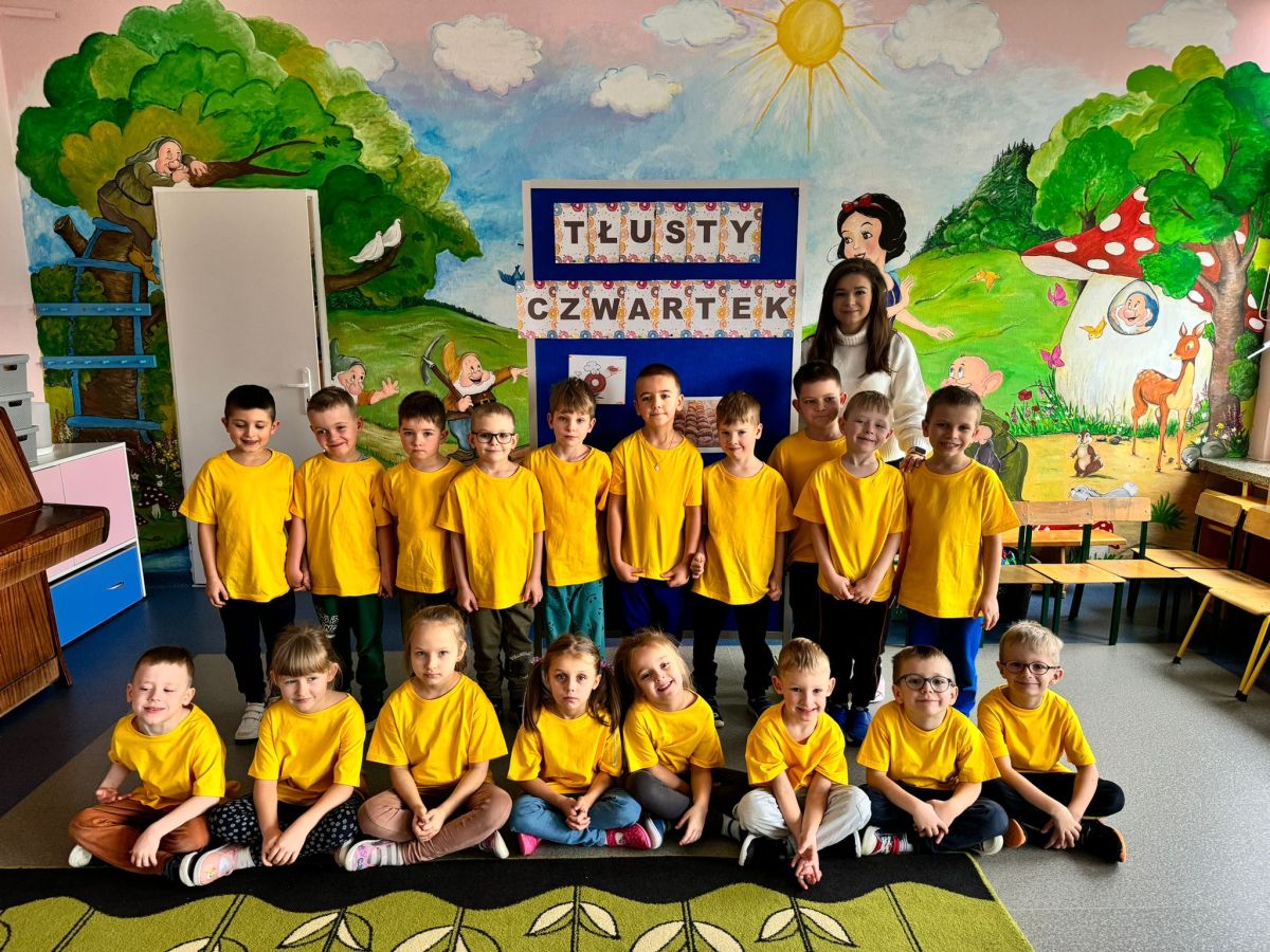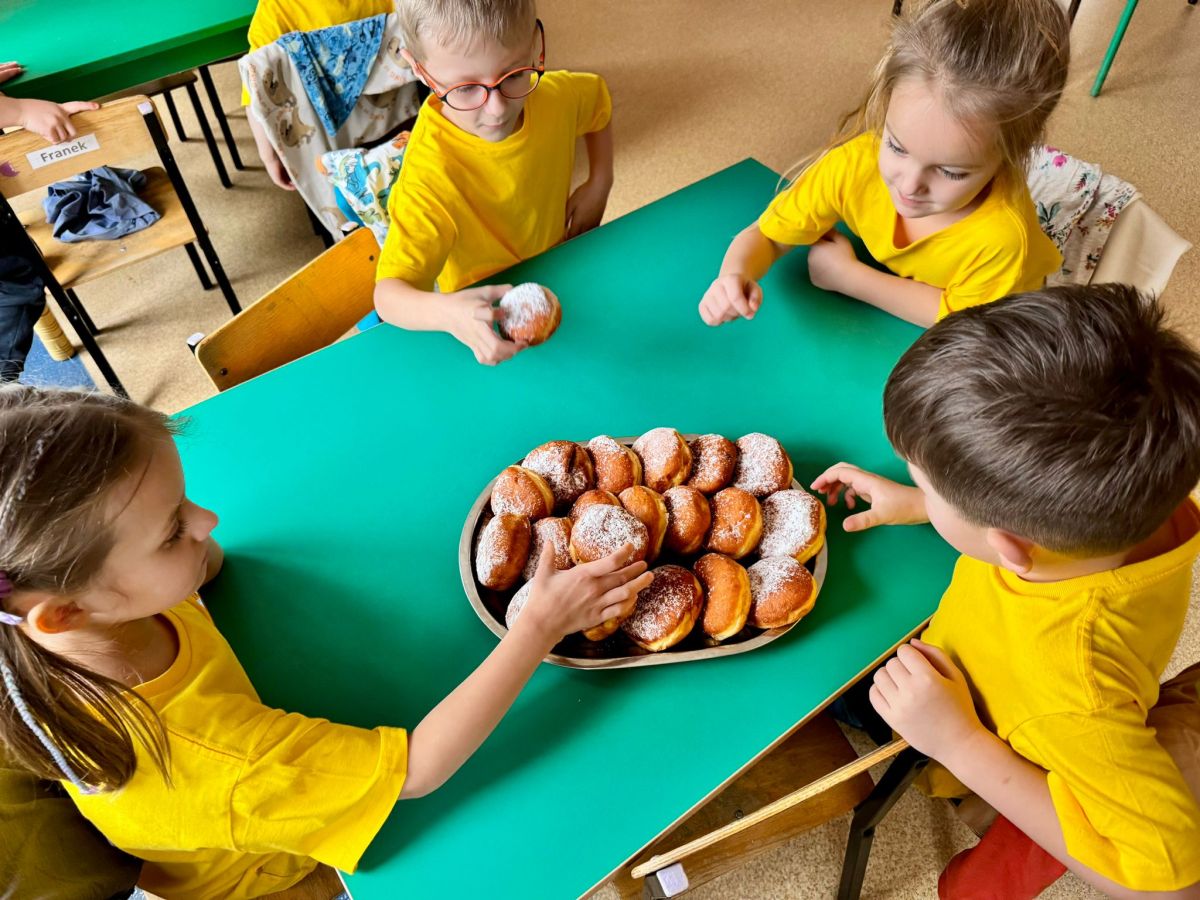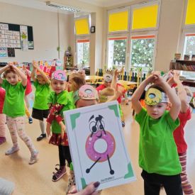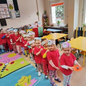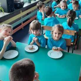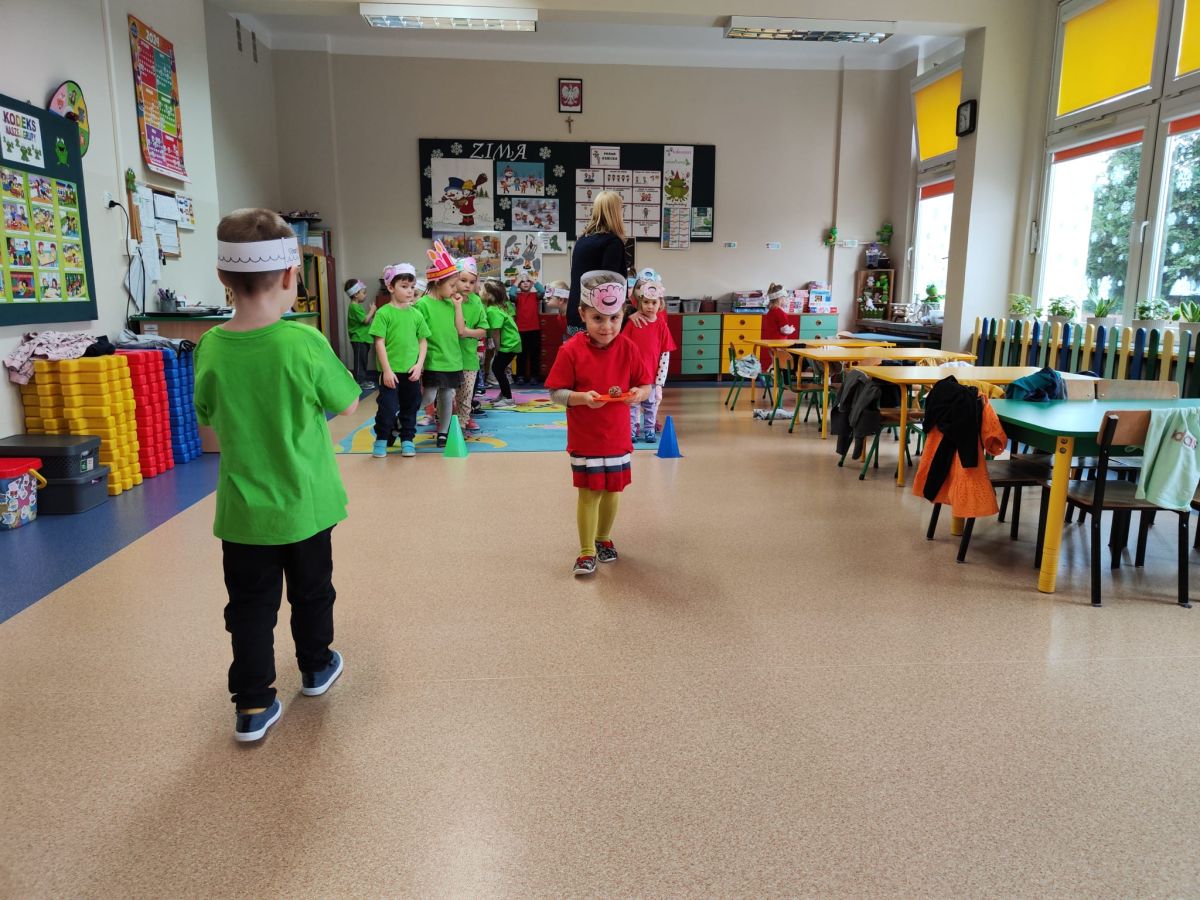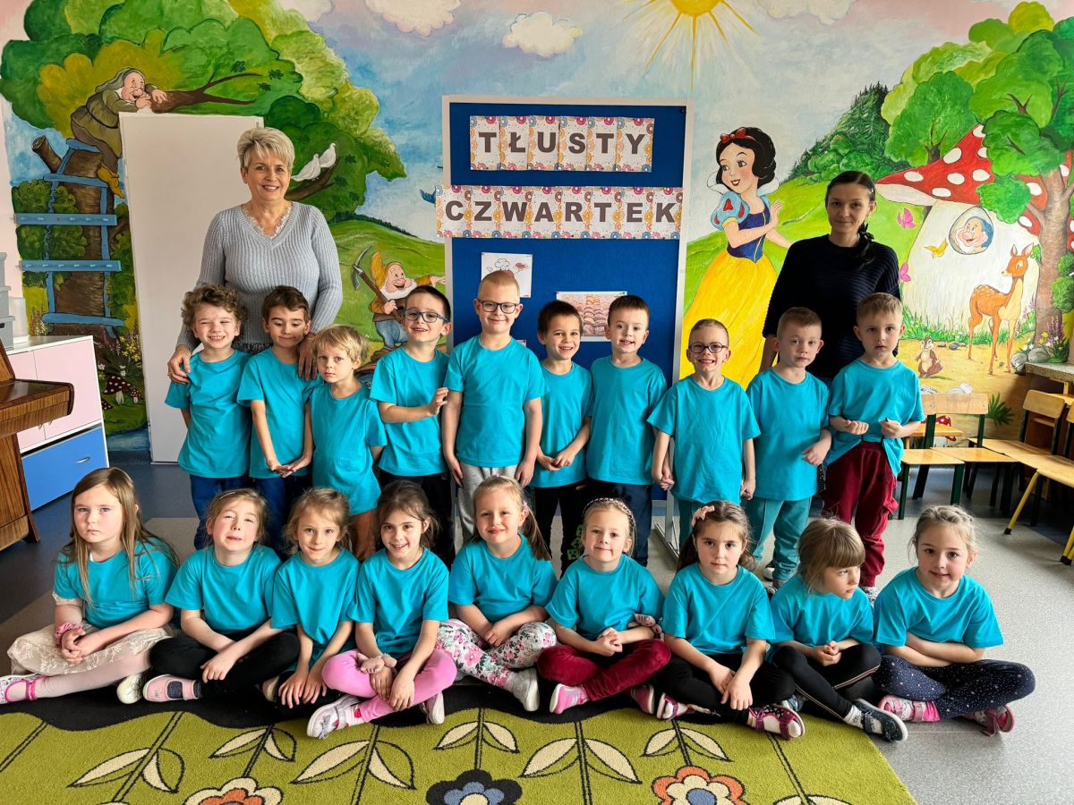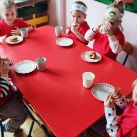Dzieci z grupy I "Biedronki" i II "Żabki" pokolorowały papierowe opaski z pączkiem. Następnie obejrzały filmik edukacyjny "Jak powstają pączki?" Przedszkolaki wspólnie uczestniczyły w "pączkowej gimnastyce" oraz rywalizowały w "wyścigu z pączkiem". Na zakończenie zabawy dzieci zaśpiewały piosenkę "Z rączek do rączek wędruje pączek" oraz zjadły pączki.