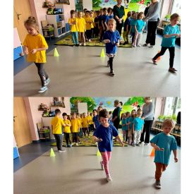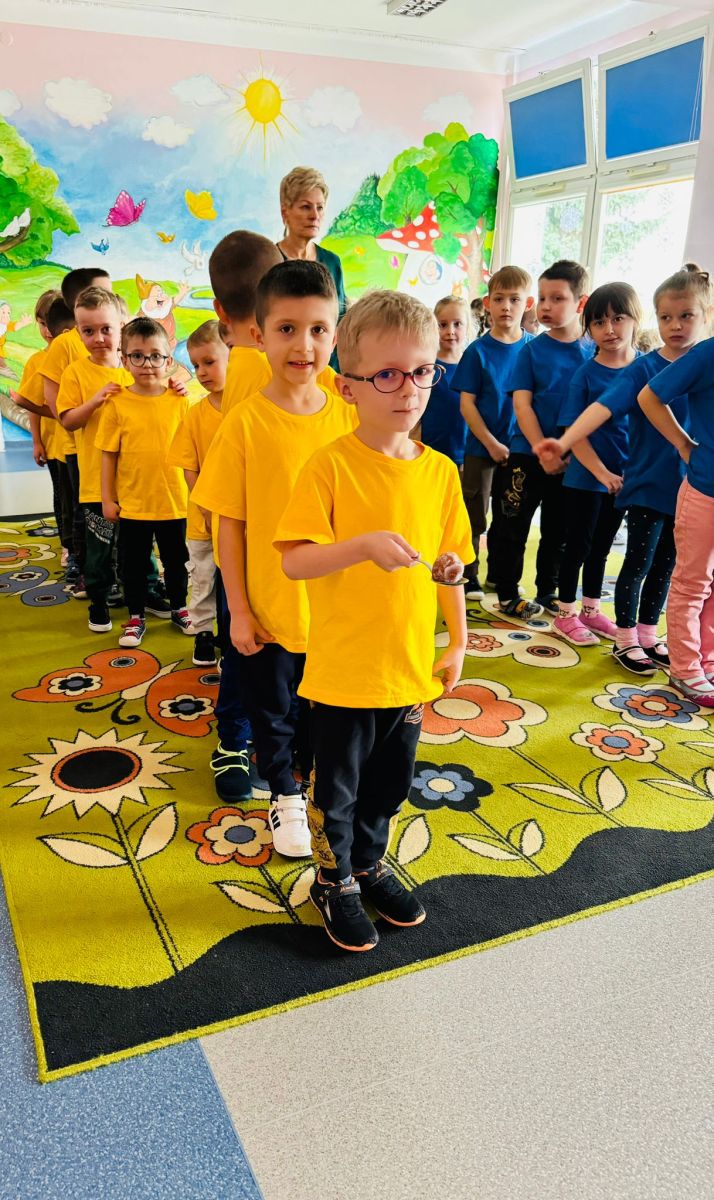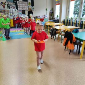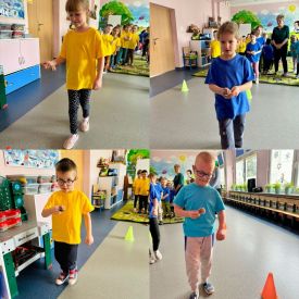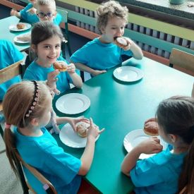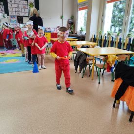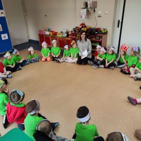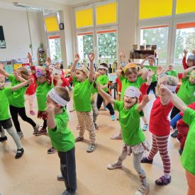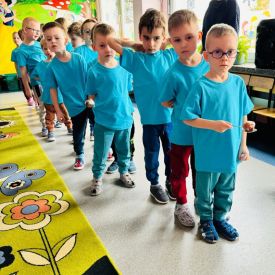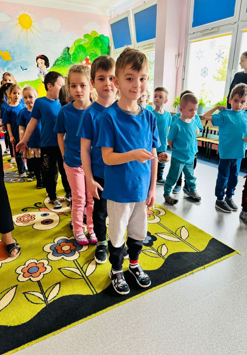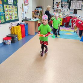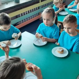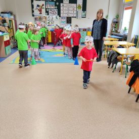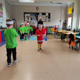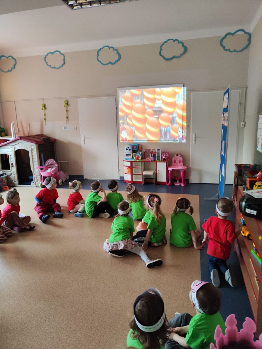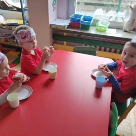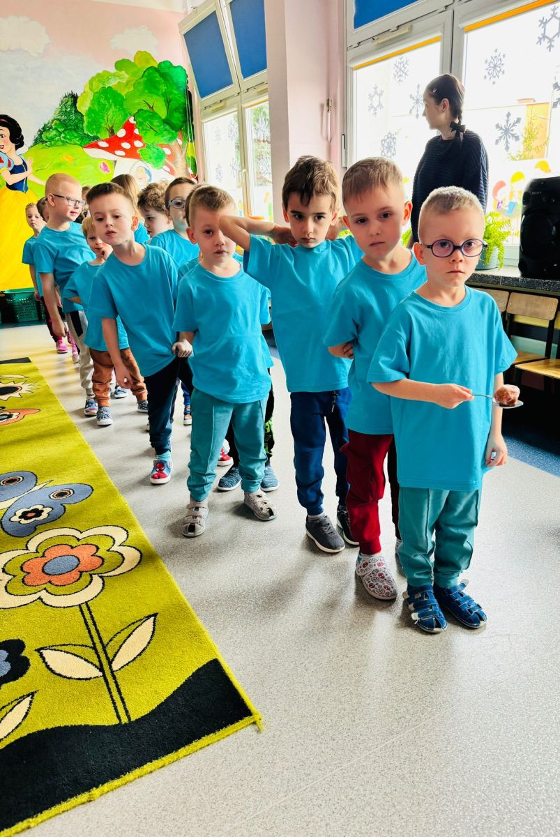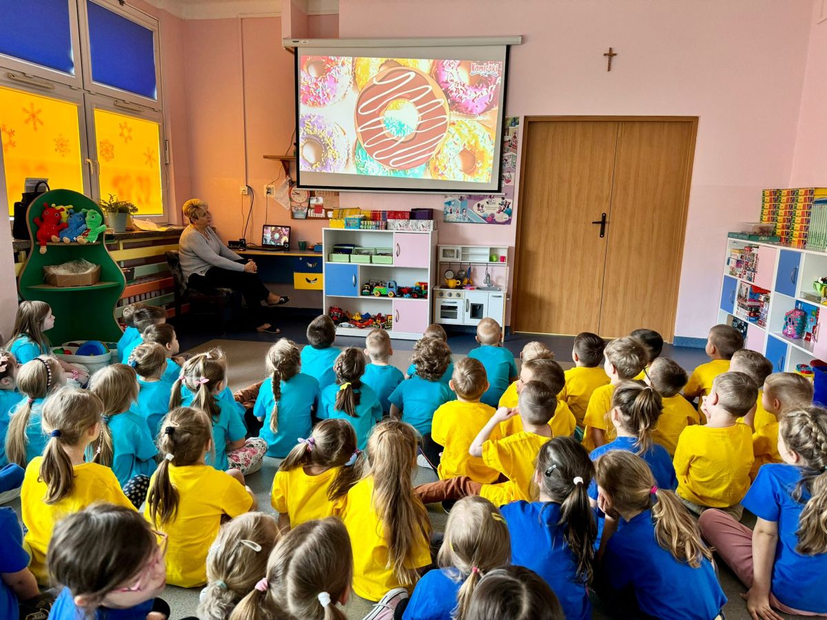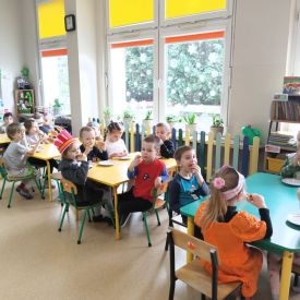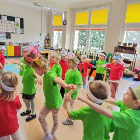 Dzieci z grupy I "Biedronki" i II "Żabki" pokolorowały papierowe opaski z pączkiem. Następnie obejrzały filmik edukacyjny "Jak powstają pączki?" Przedszkolaki wspólnie uczestniczyły w "pączkowej gimnastyce" oraz rywalizowały w "wyścigu z pączkiem". Na zakończenie zabawy dzieci zaśpiewały piosenkę "Z rączek do rączek wędruje pączek" oraz zjadły pączki.