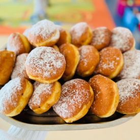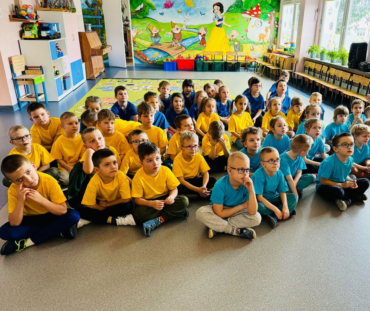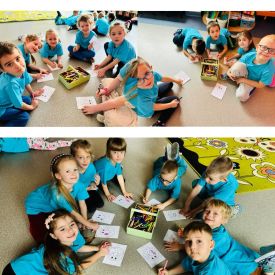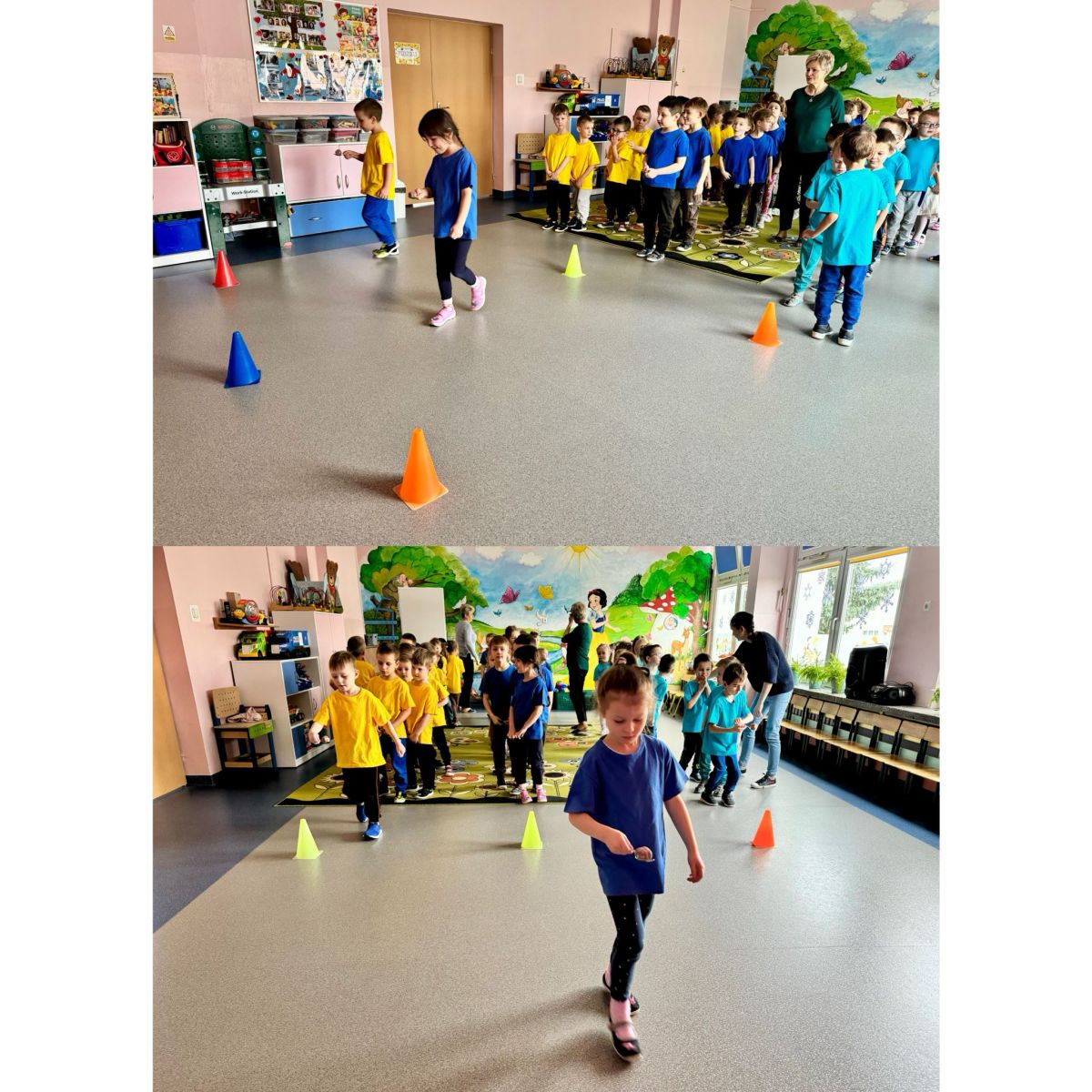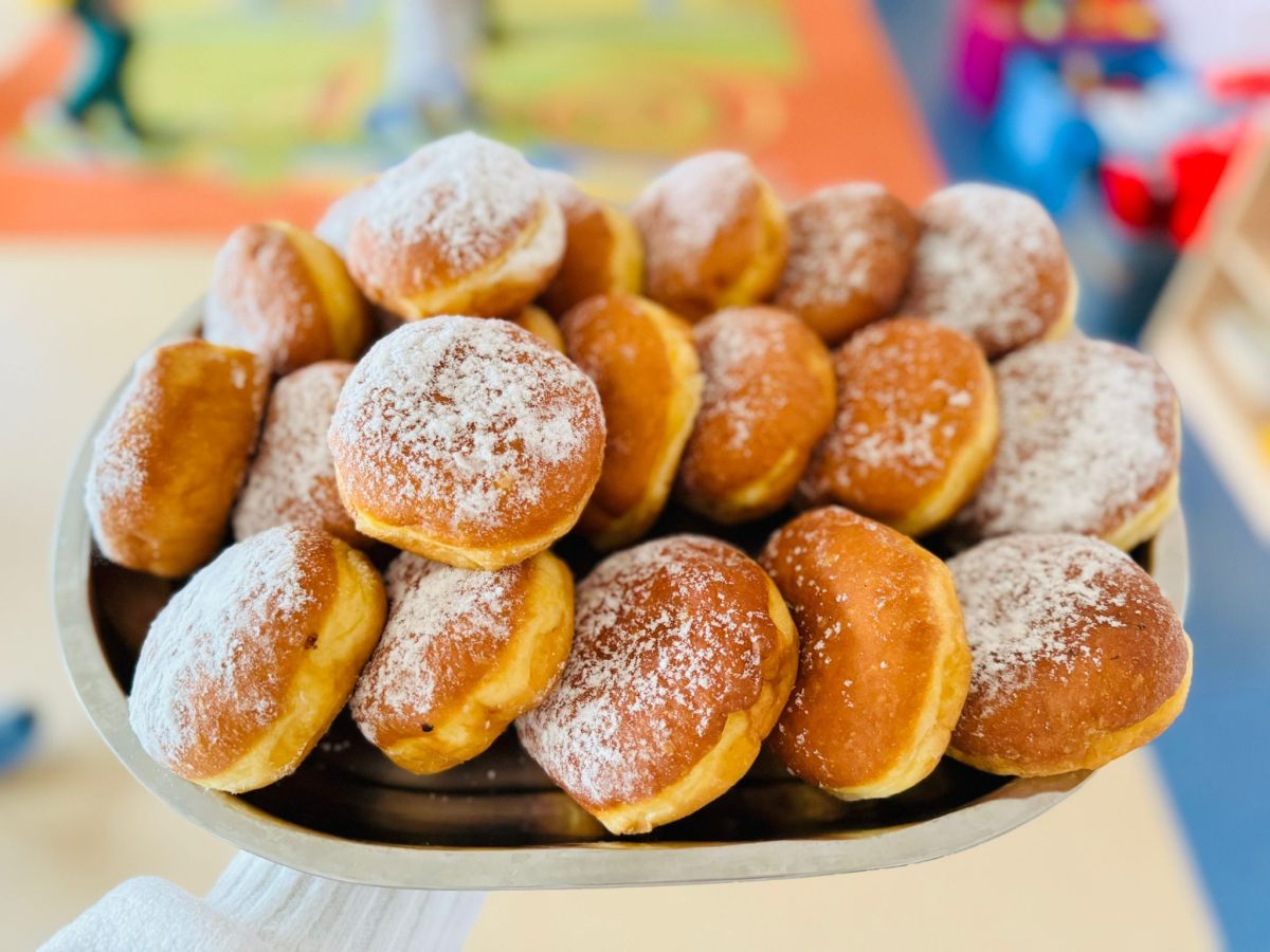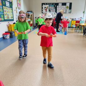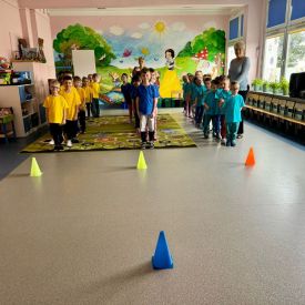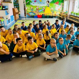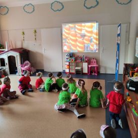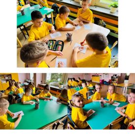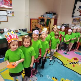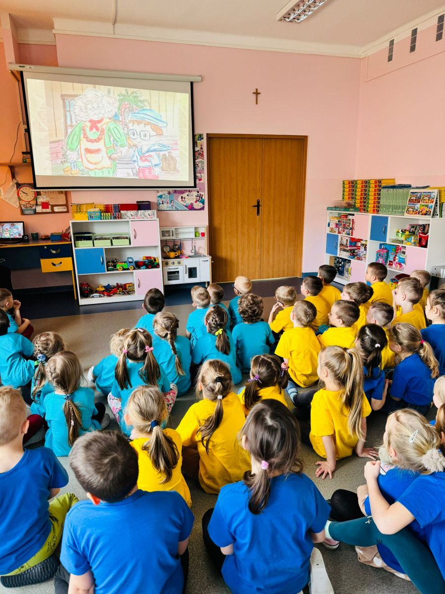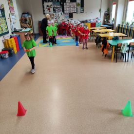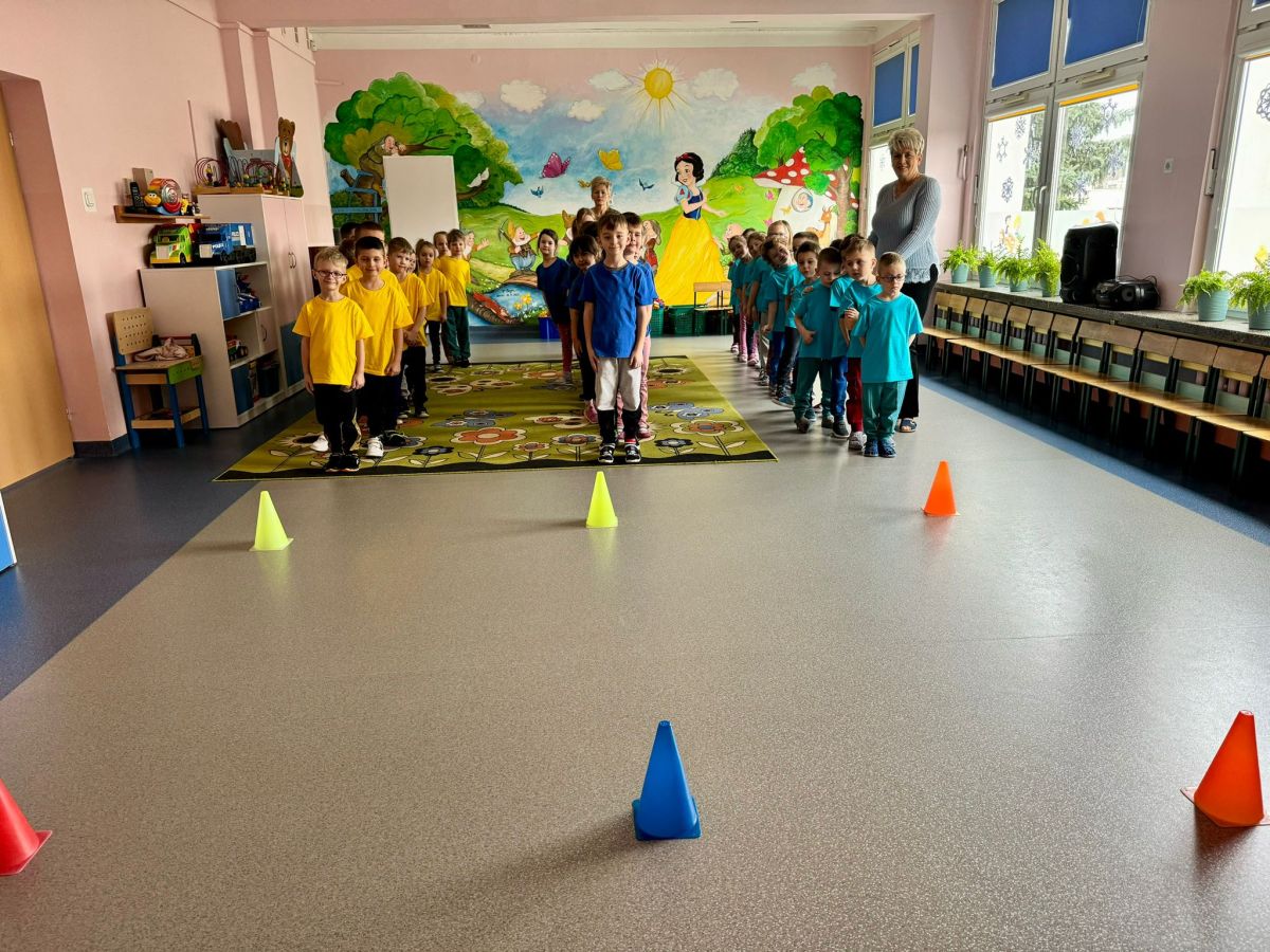 Dzieci z grupy I "Biedronki" i II "Żabki" pokolorowały papierowe opaski z pączkiem. Następnie obejrzały filmik edukacyjny "Jak powstają pączki?" Przedszkolaki wspólnie uczestniczyły w "pączkowej gimnastyce" oraz rywalizowały w "wyścigu z pączkiem". Na zakończenie zabawy dzieci zaśpiewały piosenkę "Z rączek do rączek wędruje pączek" oraz zjadły pączki.