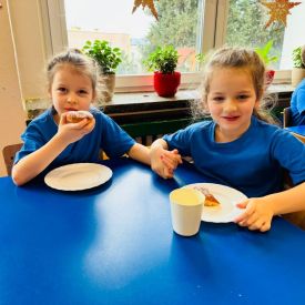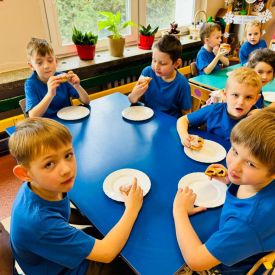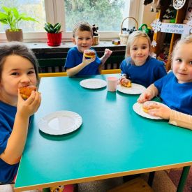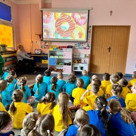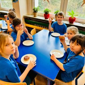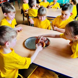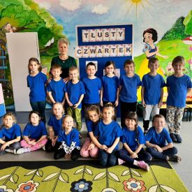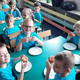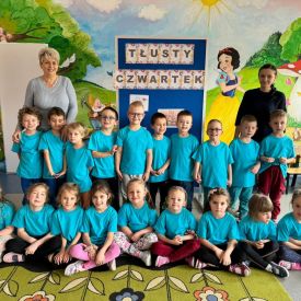 8 lutego świętowaliśmy Tłusty Czwartek w naszym przedszkolu. Najważniejszym akcentem tego dnia były pączki. Dzieci z grupy III, IV i V na zajęciach dowiedziały się o zwyczajach, jakimi od lat żegnamy karnawał, oglądały zdjęcia faworków, pączków oraz innych smakołyków, związanych z tym wydarzeniem. Przedszkolaki obejrzały krótką inscenizację teatrzyku kukiełkowego znalezioną w zasobach internetowych pt: „Pączki i faworki u babci Honorki” M.Kownackiej. Dzieci także wzięły udział w konkurencji z pączkiem. Ich zadaniem było okrążyć pachołki tak, aby pączuś nie spał im z łyżki. Przedszkolaki z grupy Motylków, Pszczółek i Sówek wykonały słodką kolorowankę i na koniec aby tradycji stało się zadość zajadały się pysznymi pączusiami.