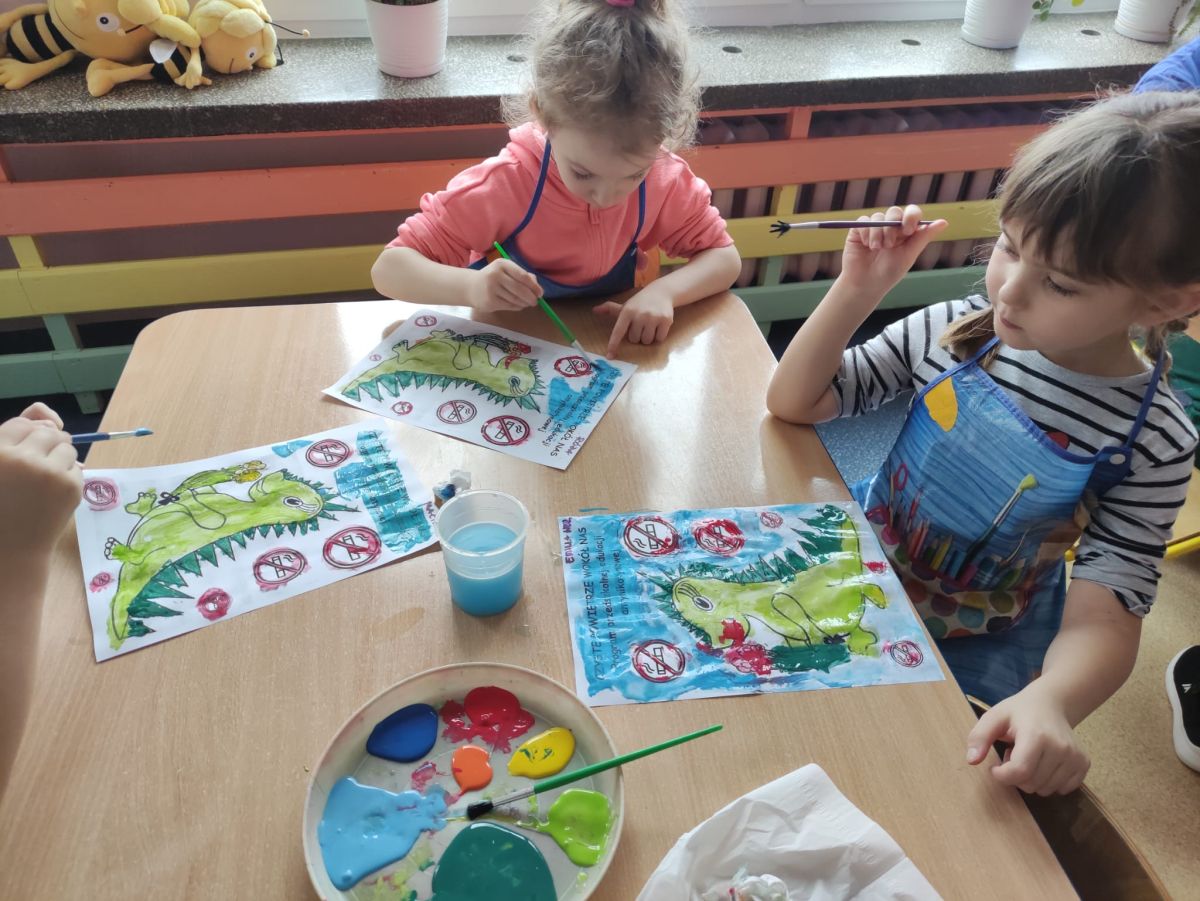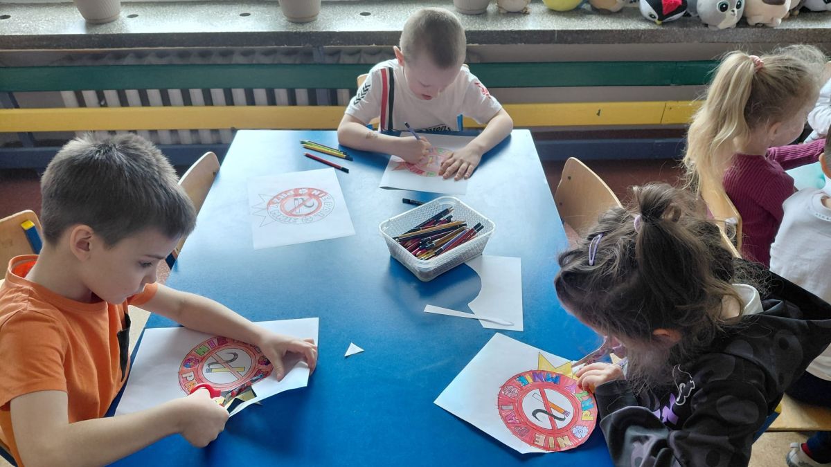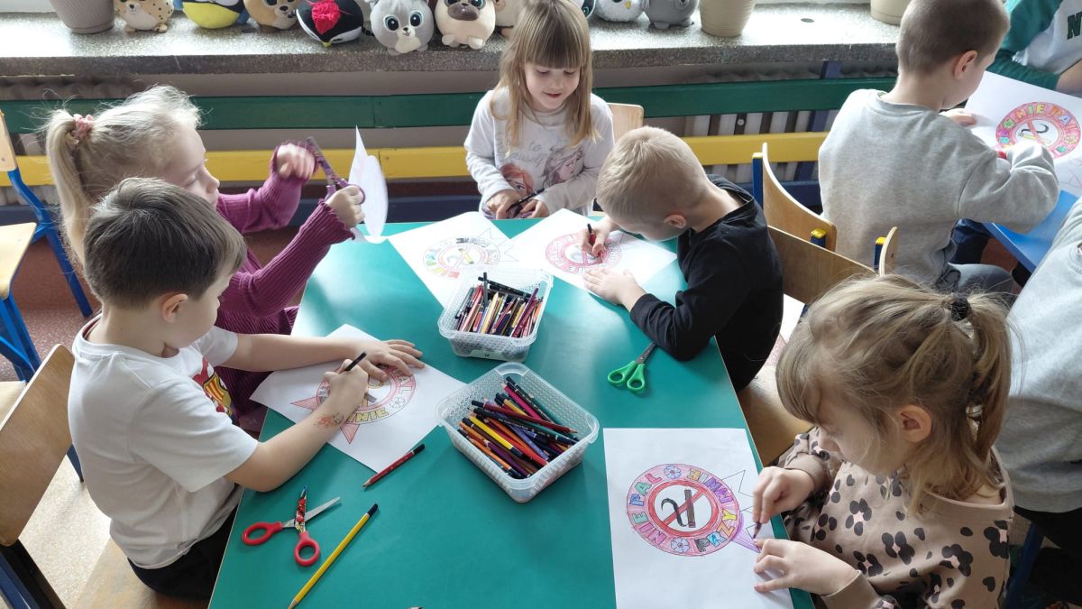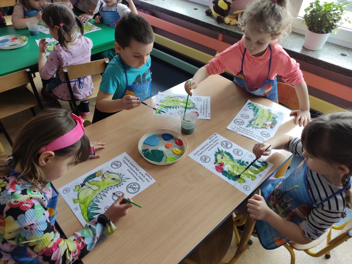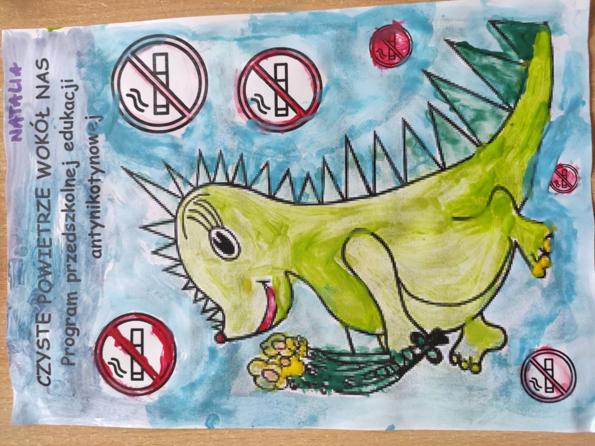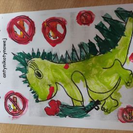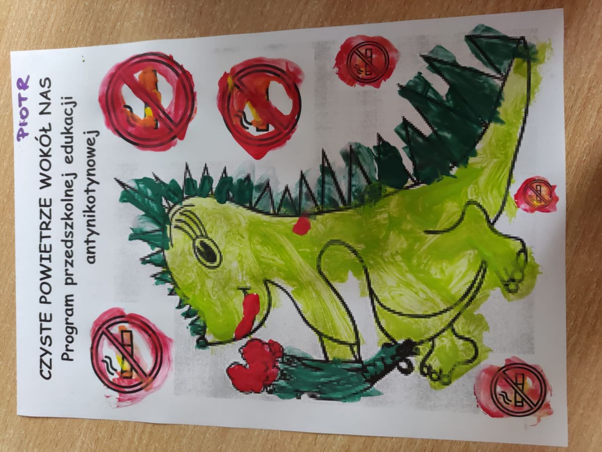 W dniach od 2.02.2026 r. do 6.02.2026 r. przedszkolaki z grupy III „Pszczółki” i grupy IV „Sowy” realizowały Ogólnopolski Program Edukacji Antytytoniowej pt. ,,Czyste powietrze wokół nas”. Celem programu było uczenie dzieci szacunku do otaczającego świata, zwiększenie wrażliwości dzieci na szkodliwość dymu papierosowego, wykształcenie umiejętności rozpoznawania różnych źródeł dymu, zwiększenie wiedzy na temat skutków palenia papierosów, zwiększenie wrażliwości dzieci na miejsca, w których mogą być narażane na dym. Dzieci obejrzały filmy edukacyjne: Książę i Smog, Zanieczyszczone powietrze, Czym jest smog? Podczas spaceru obserwowały różne źródła dymu, malowały farbami postać Smoka Dinka, kolorowały i ozdabiały kwiaty, projektowały własny znaczek „Nie pal przy mnie”, śpiewały piosenkę o zielonym Dinku, który nie lubi palaczy i ucieka przed dymem,