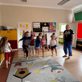 Dzieci z grupy V „Sówki” co tydzień biorą udział w zajęciach sportowych prowadzonych przez nauczyciela wychowania fizycznego.