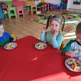 Na koniec przedszkolaki wzięły udział w witaminowym przyjęciu przygotowanym przez rodziców Marianki z okazji urodzin. Dzieci z uśmiechem zjadły sałatkę owocową.