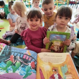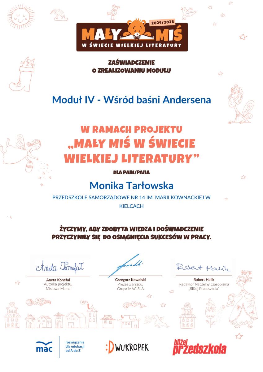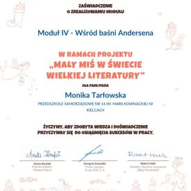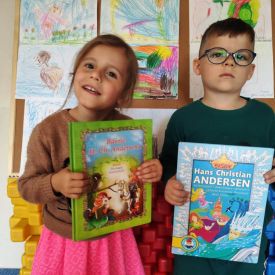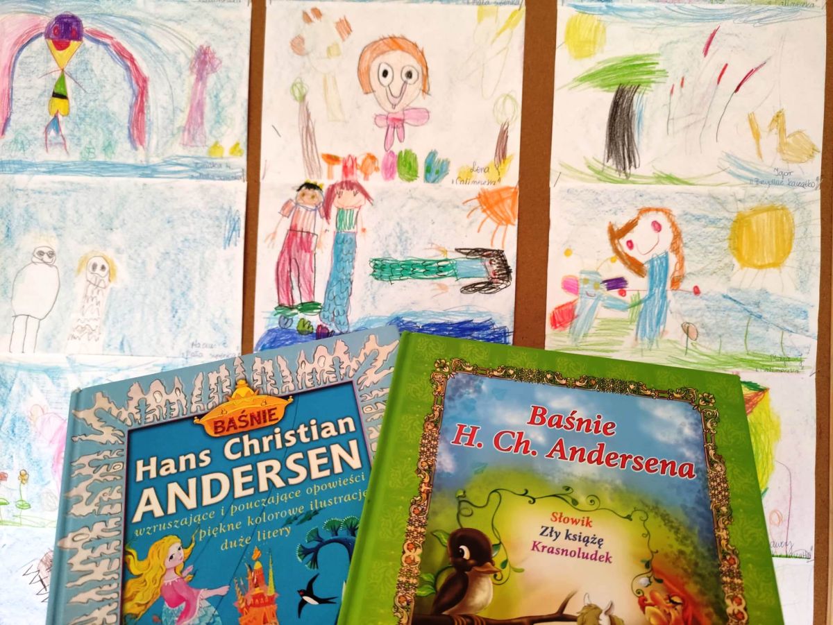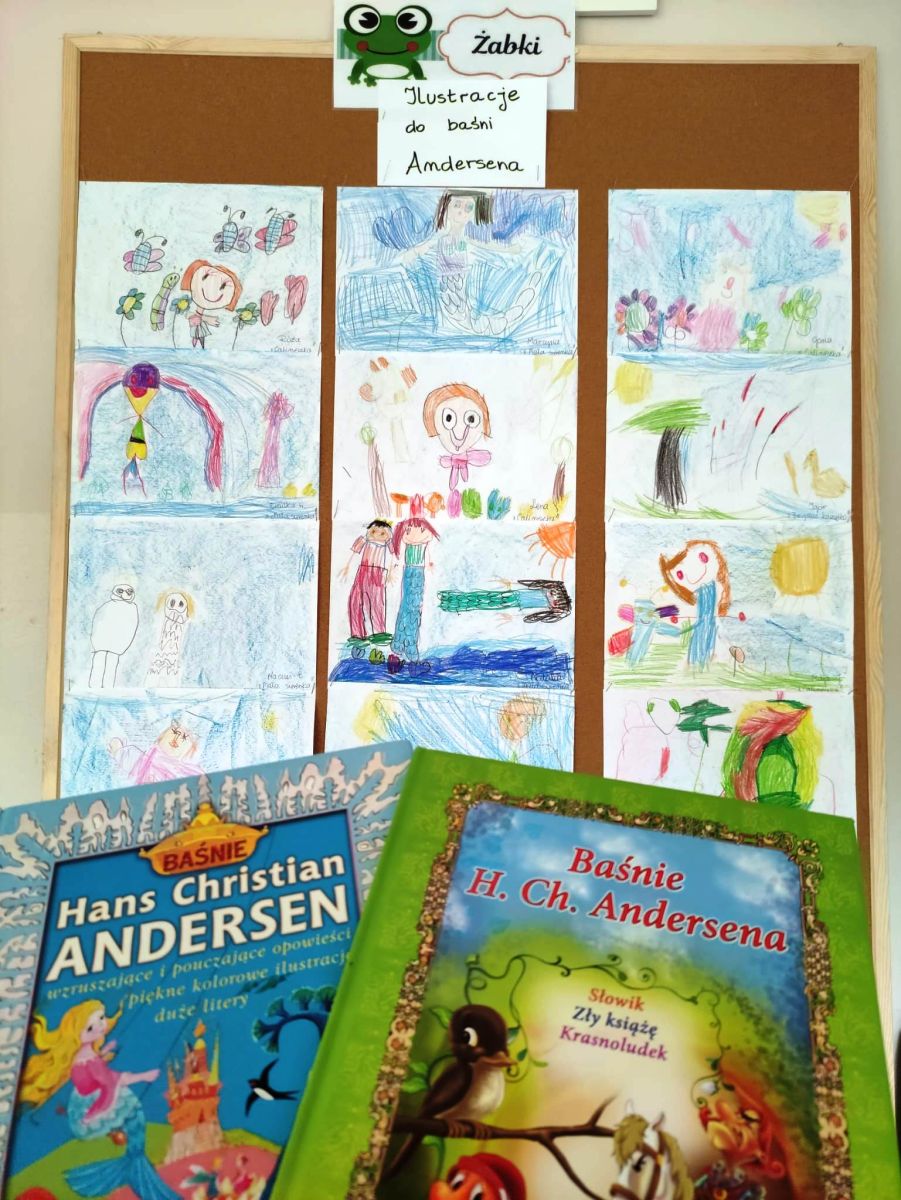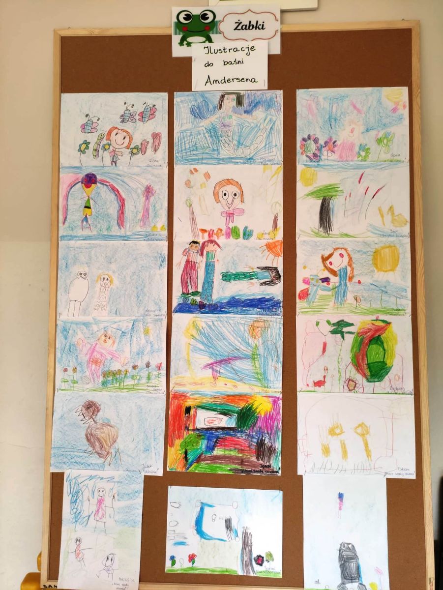 Dzieci z grupy Żabek zrealizowały przedostatni - czwarty moduł projektu Mały Miś w Świecie Wielkiej Literatury - Wśród Baśni Andersena. Przedszkolaki poznały postać H. CH. Andersena oraz wybrane baśnie. Dzieci z wielkim zaciekawieniem słuchały przygód Calineczki, Małej Syrenki, Brzydkiego Kaczątka, Gerdy i Kaja oraz Króla, który marzył o nowych szatach. Finałowym zadaniem realizacji modułu było wykonanie przez dzieci ilustracji do wybranej baśni. Przedszkolaki doskonale poradziły sobie z wykonaniem ilustracji, z których wspólnie stworzyły wystawę.