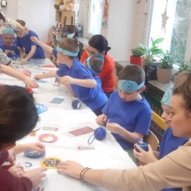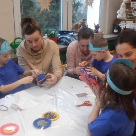 Po muzycznych zajęciach odbyły się warsztaty plastyczne. Spotkanie z rodzicami było okazją do stworzenia własnych, niepowtarzalnych ozdób świątecznych. Mali artyści z dumą prezentowali ozdobione cekinami i koralikami dzwoneczki i bombki.