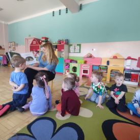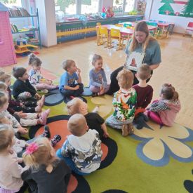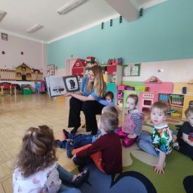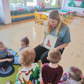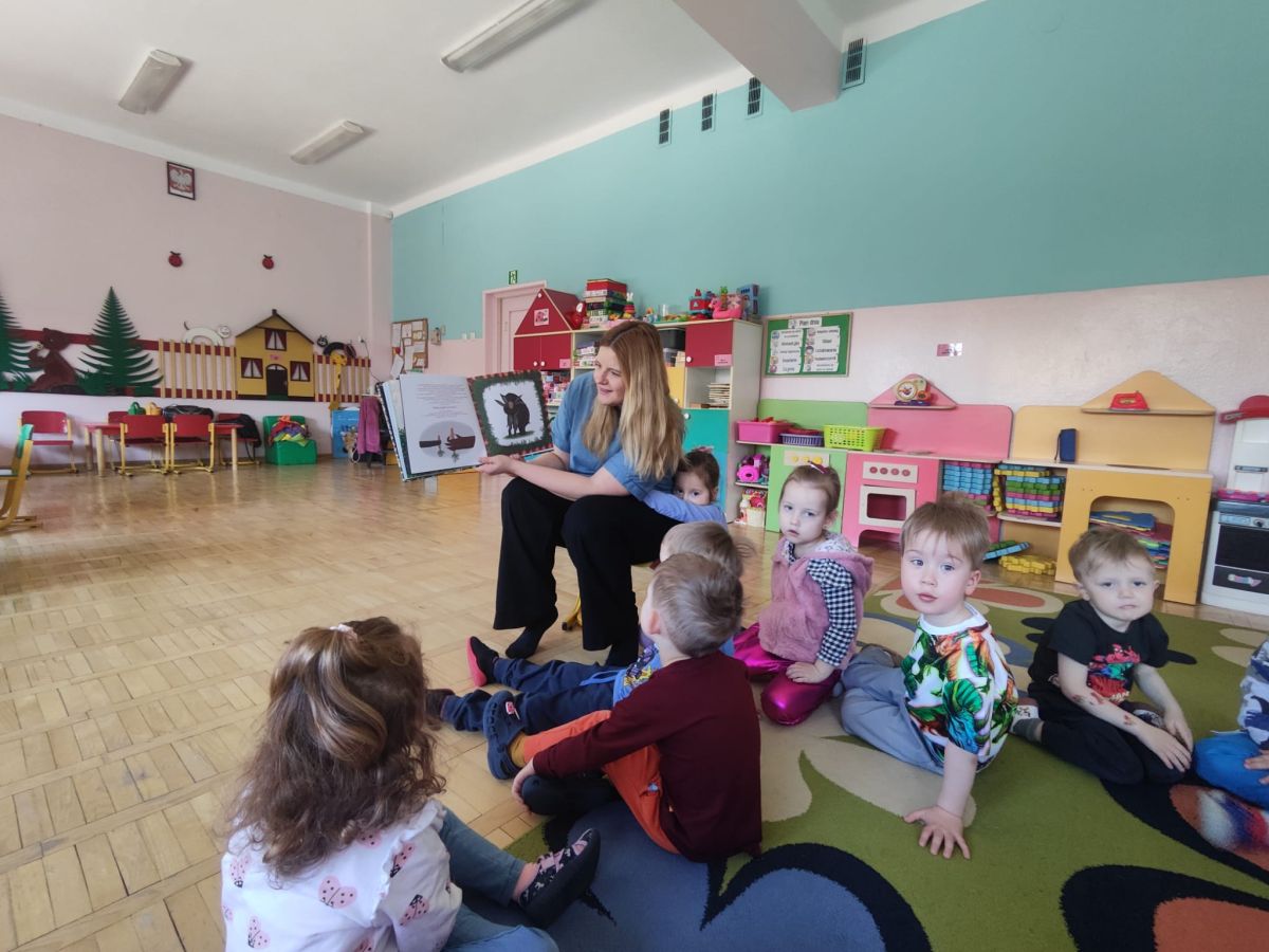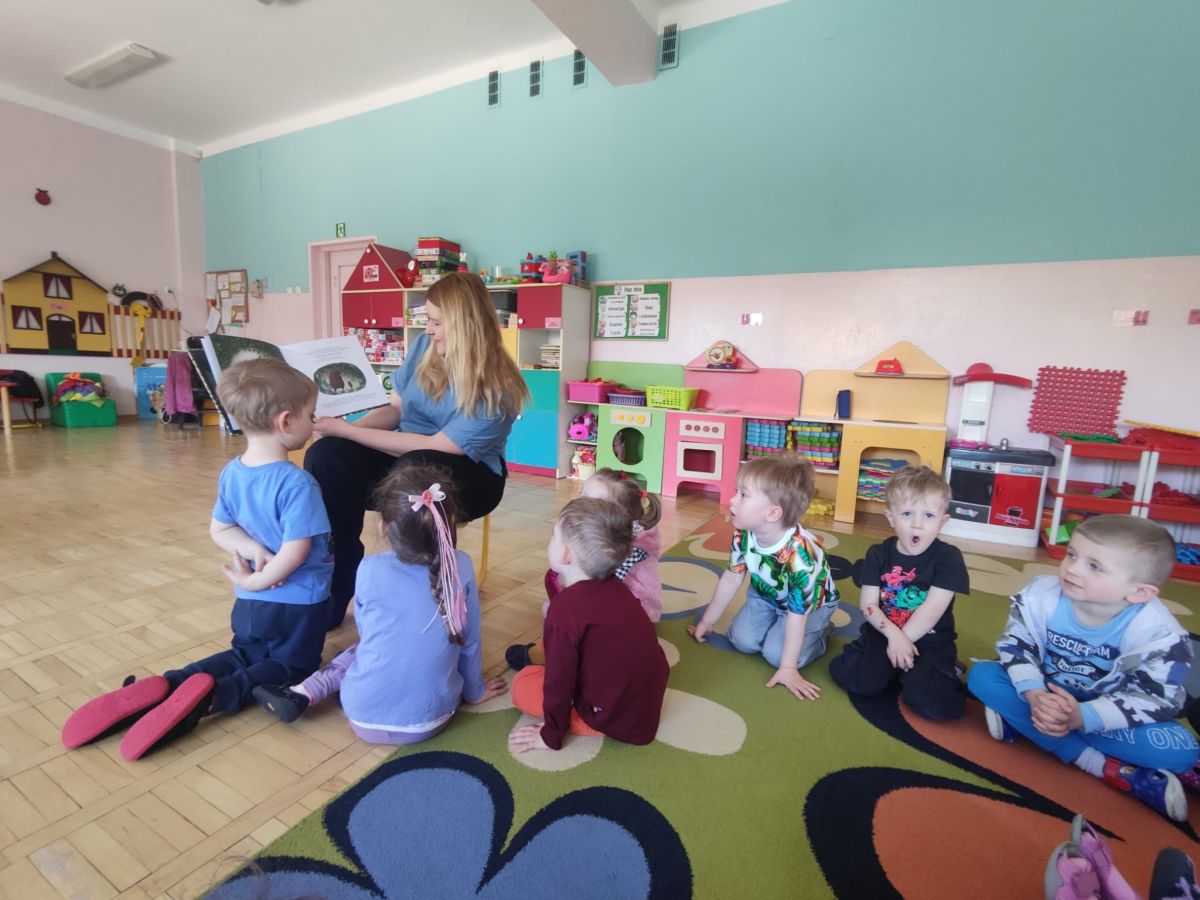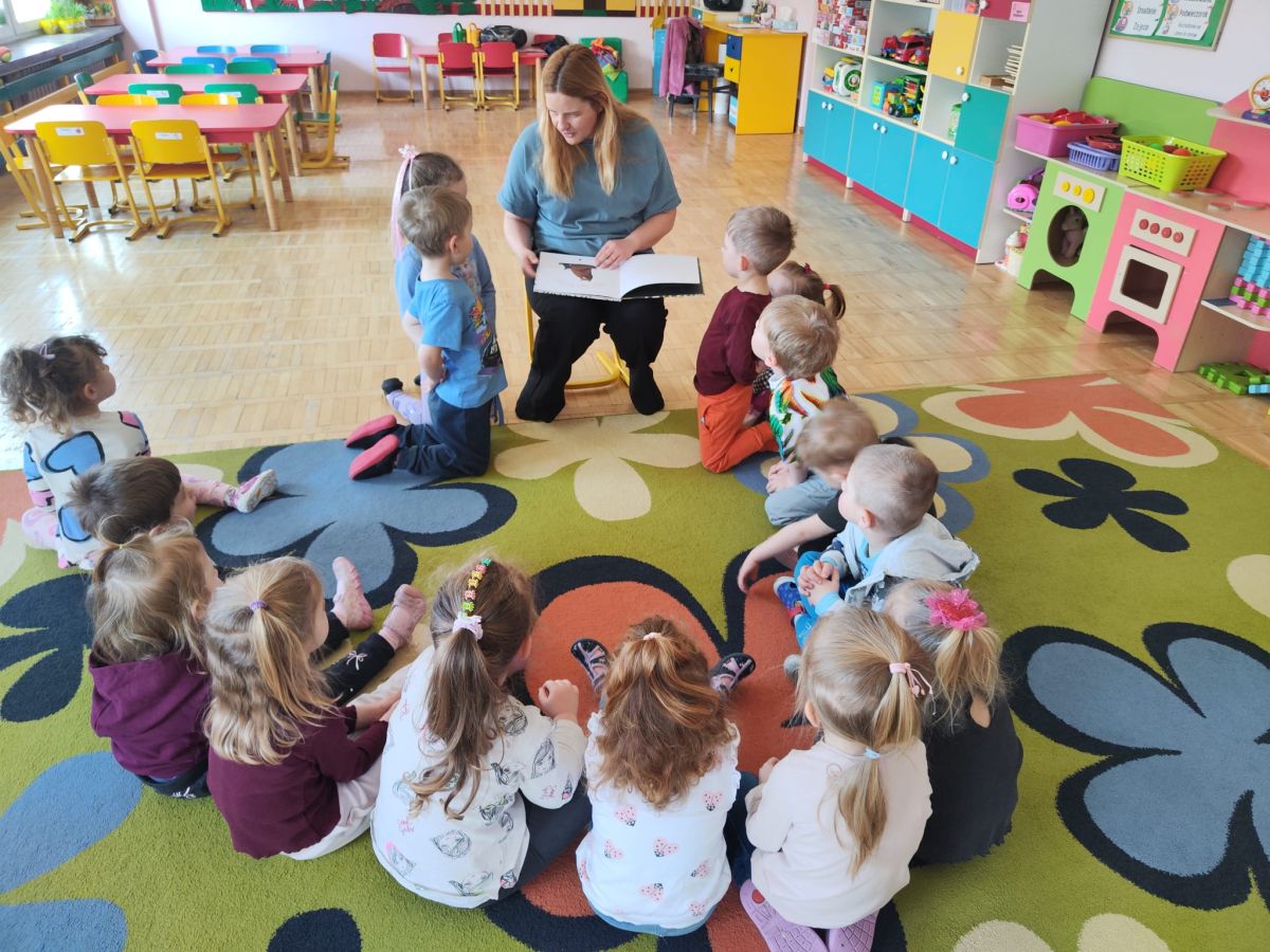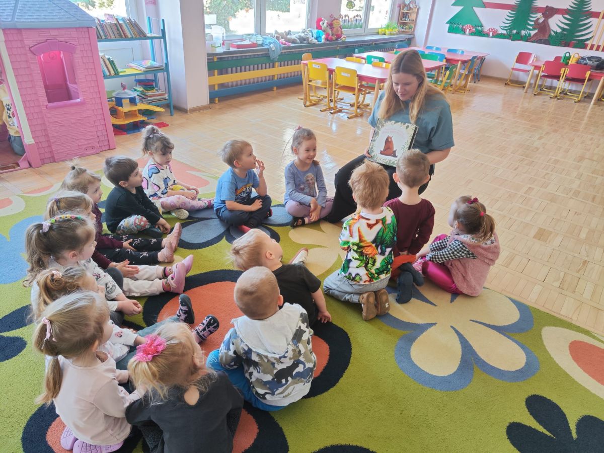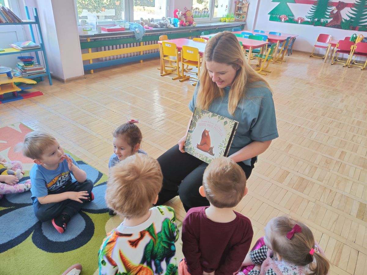 Dnia 9 kwietnia 2025r. dzieci z grupy Biedronek odwiedziła mama Elenki - pani Ewelina, która włączyła się w akcję "Cała Polska czyta dzieciom". Mama Elenki przeczytała bajkę "Proszę mnie przytulić ". Dzieci z uwagą i zainteresowaniem wysłuchały bajki o niedźwiadku a na koniec pokolorowały tematyczną kolorowankę. Czas upłynął w miłej i przyjaznej atmosferze. Czekamy na dalszych ochotników a mamie Elenki bardzo dziękujemy.