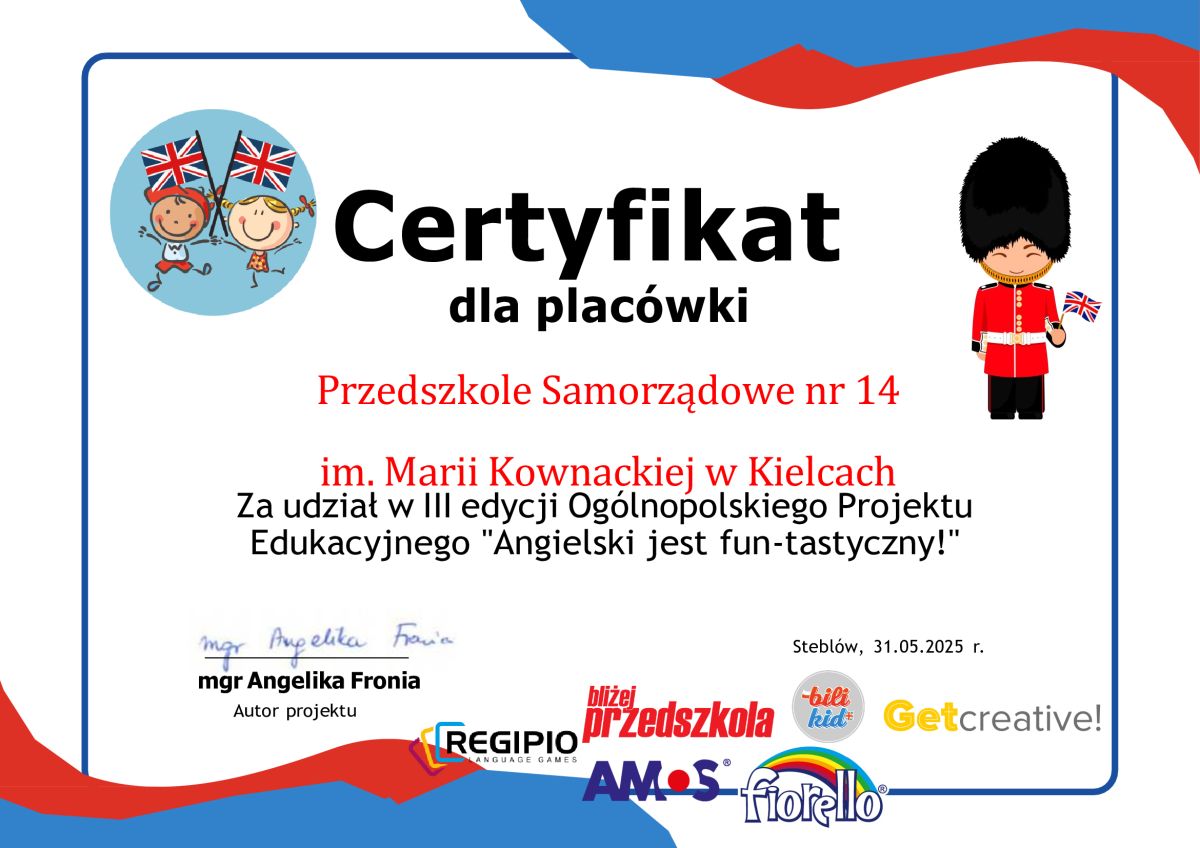 W roku szkolnym 2024/2025 dzieci z grup Pszczółek i Sówek brały udział w Ogólnopolskim Projekcie Edukacyjnym "Angielski jest fun-tastyczny". Głównym celem projektu było pokazanie przedszkolakom jak ważna w naszych czasach jest znajomość języka angielskiego, rozbudzenie zainteresowania krajami anglojęzycznymi oraz zapoznanie dzieci z ideą dwujęzycznego nauczania. Każda grupa wykonała 6 zadań projektowych.