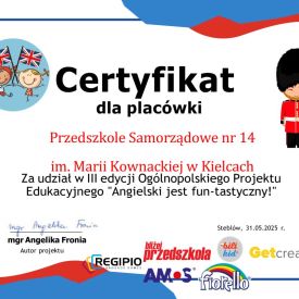 Za udział w projekcie i wykonanie zadań otrzymaliśmy certyfikat dla przedszkola.