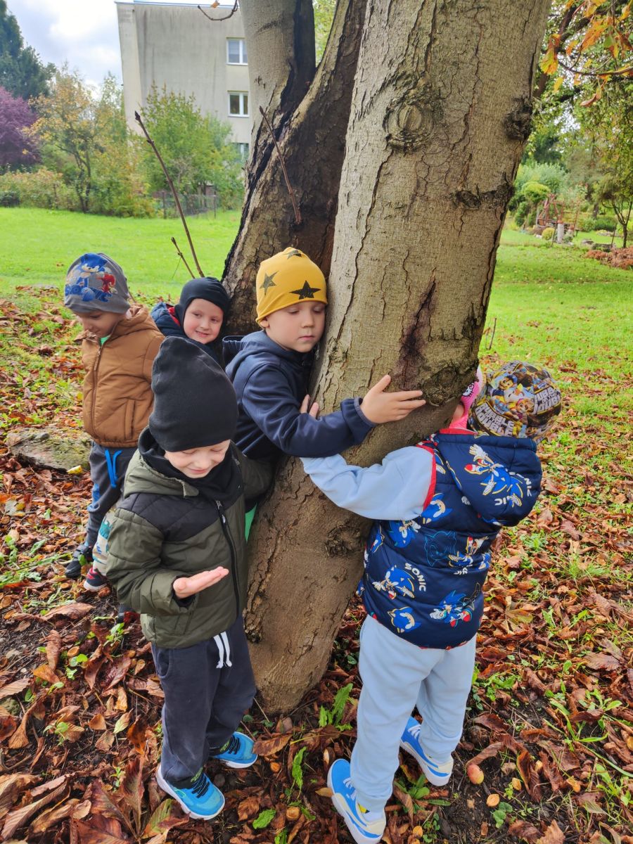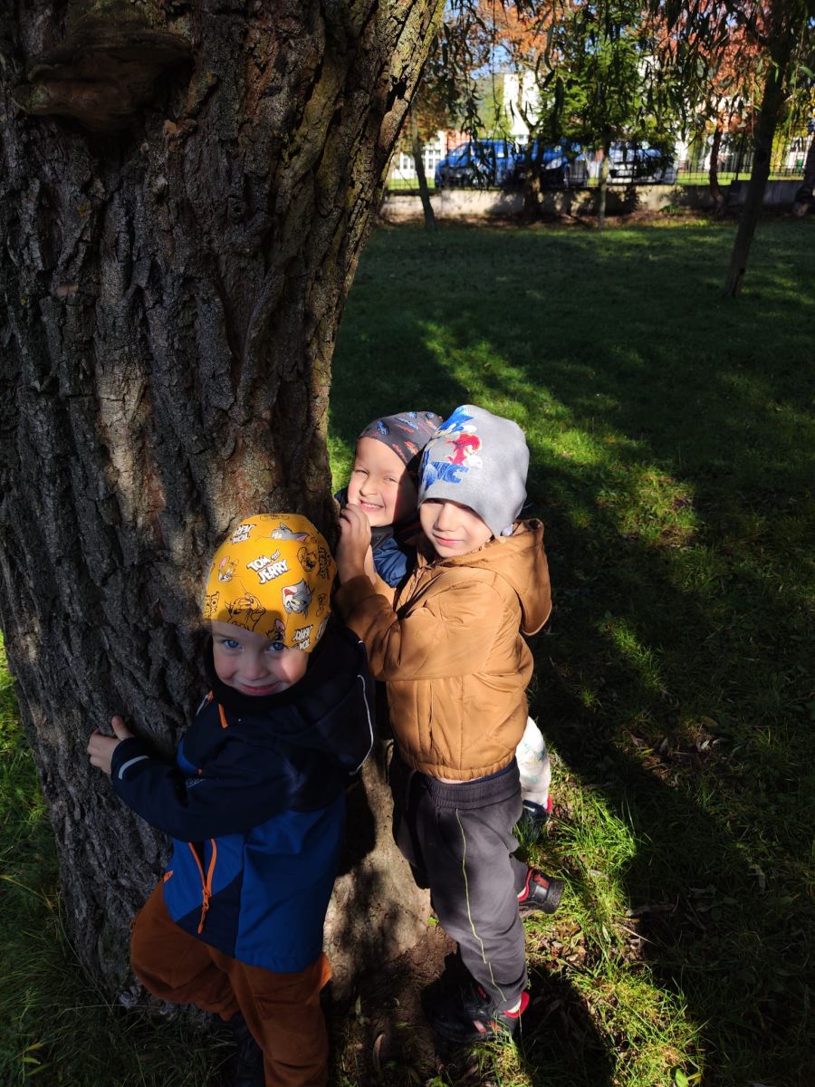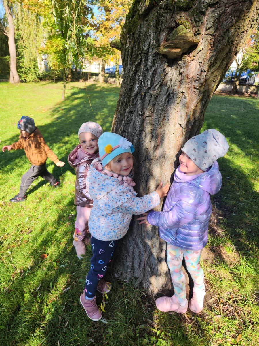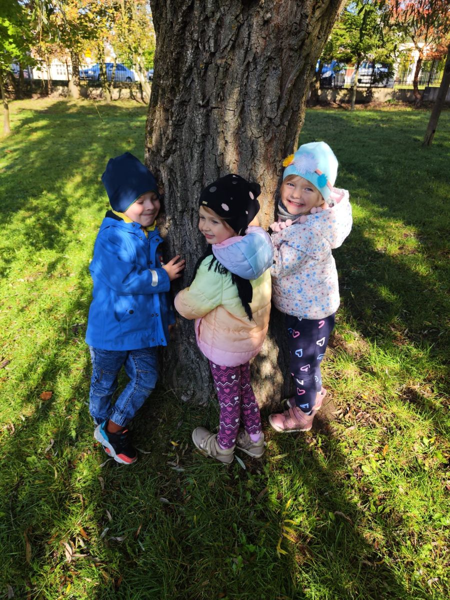 Wspólne zabawy w grupach, wykonanie prac plastycznych, przytulanie sie do drzew były świetną okazją do integracji przedszkolaków oraz wspaniałą lekcją przyrody.