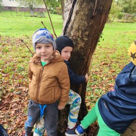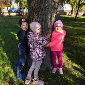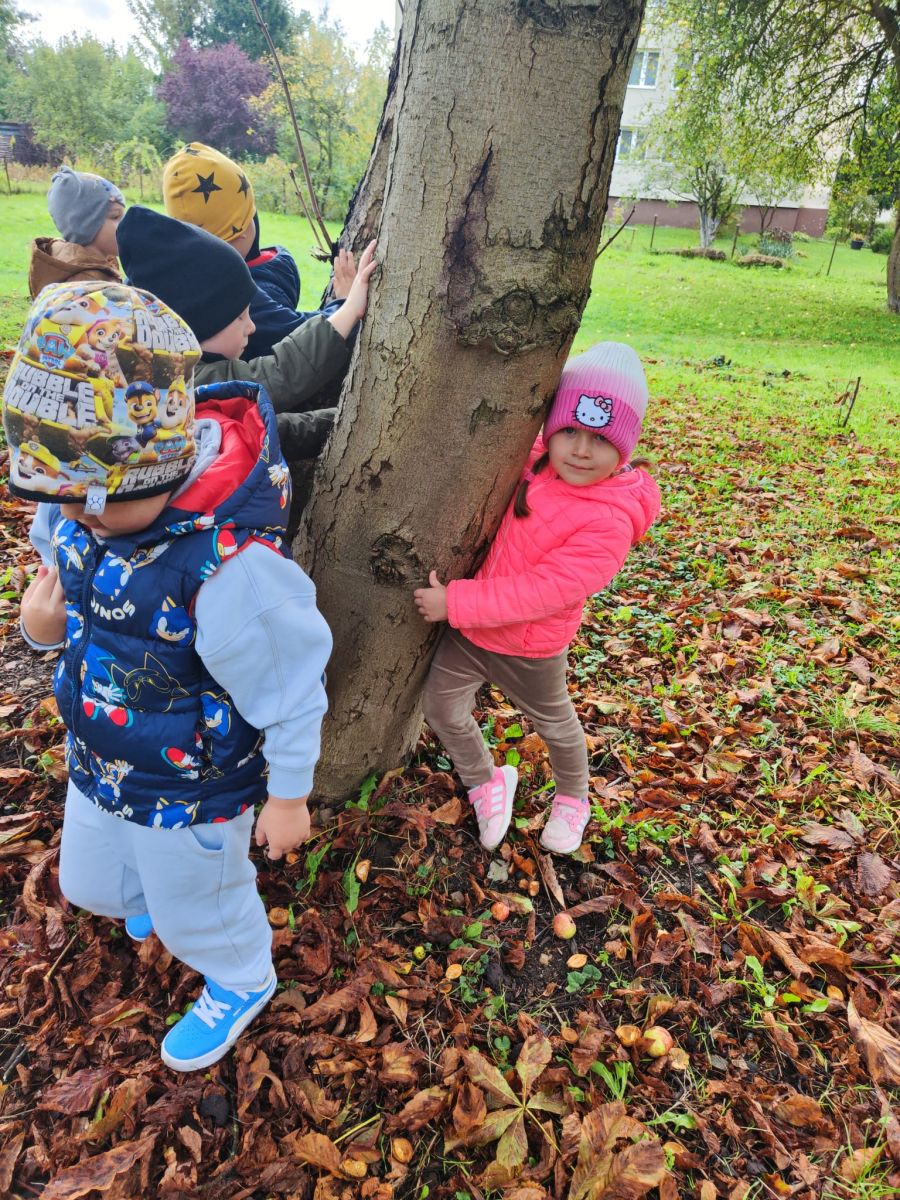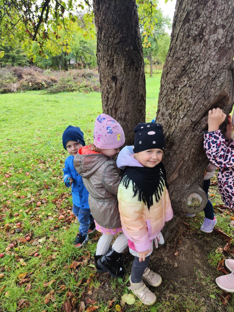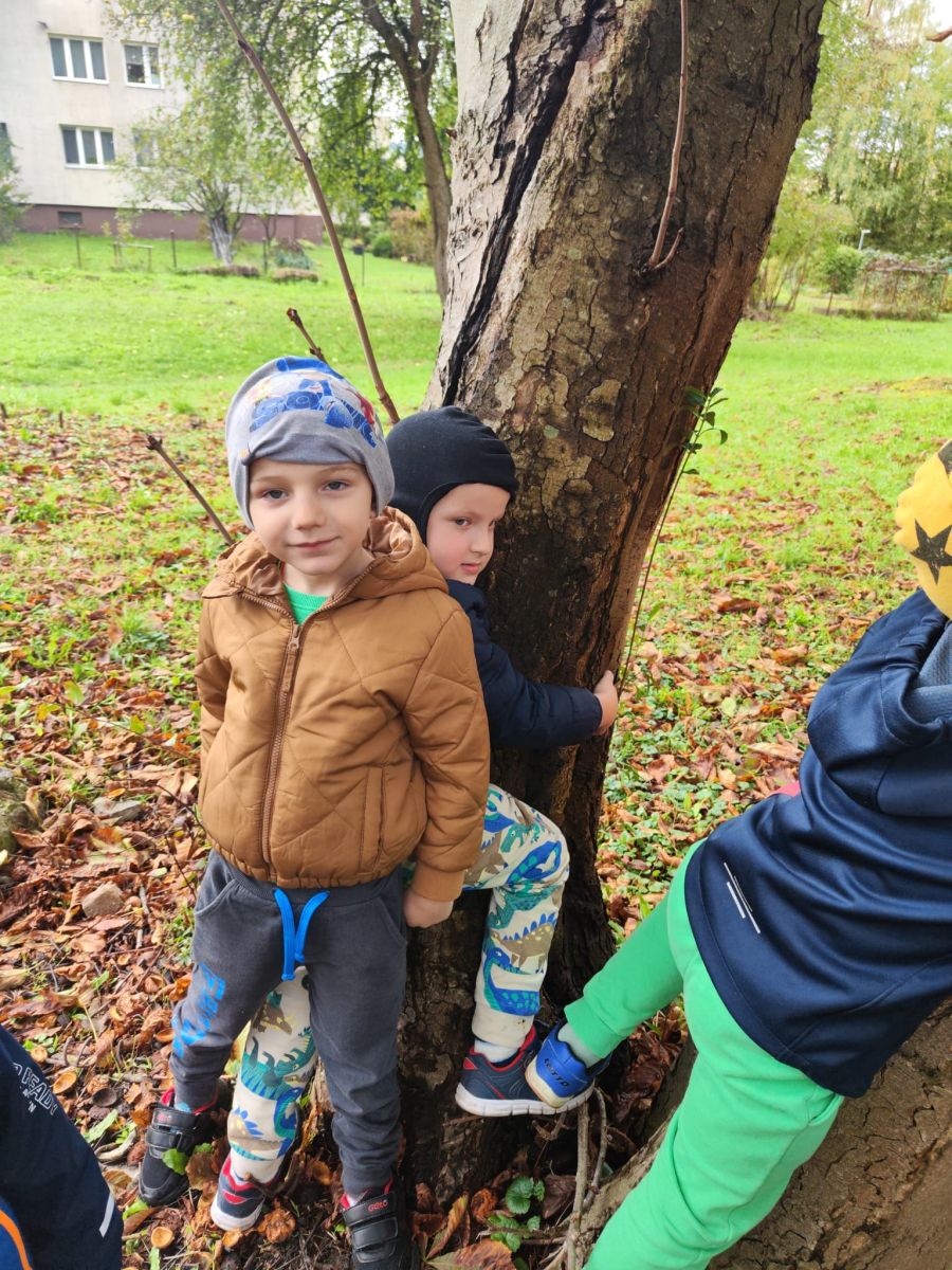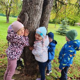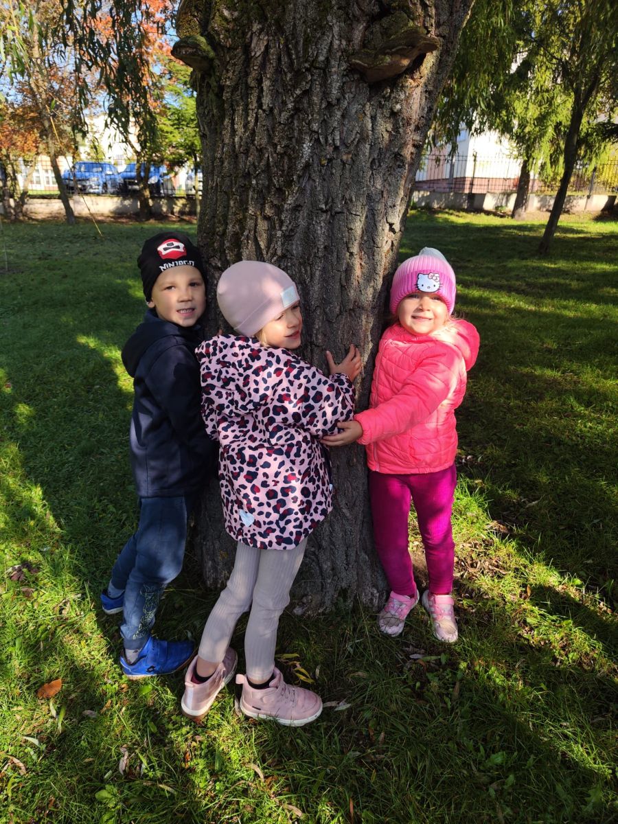 Wspólne zabawy w grupach, wykonanie prac plastycznych, przytulanie sie do drzew były świetną okazją do integracji przedszkolaków oraz wspaniałą lekcją przyrody.