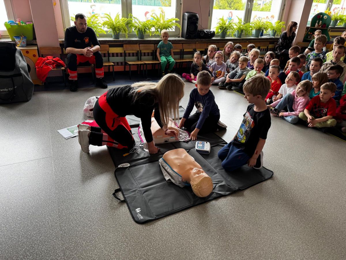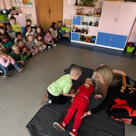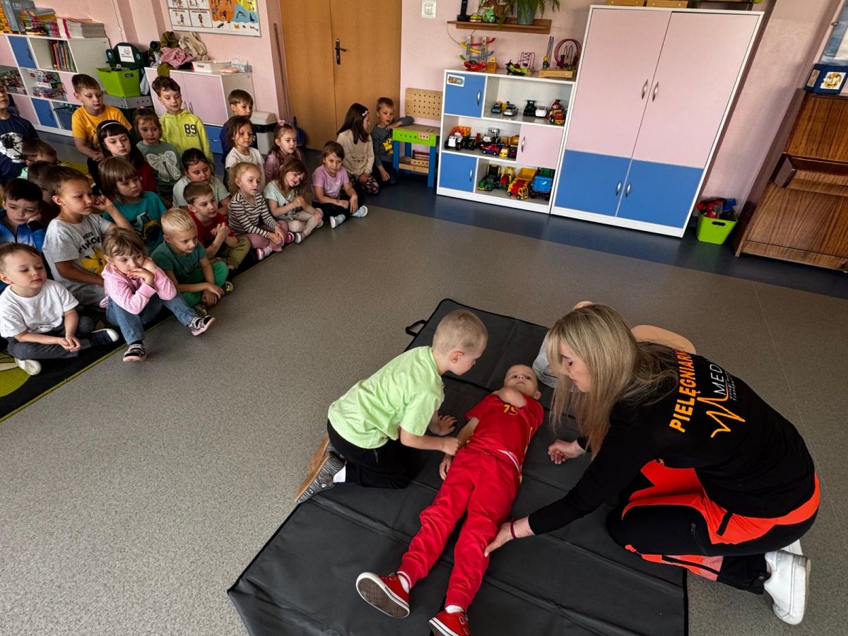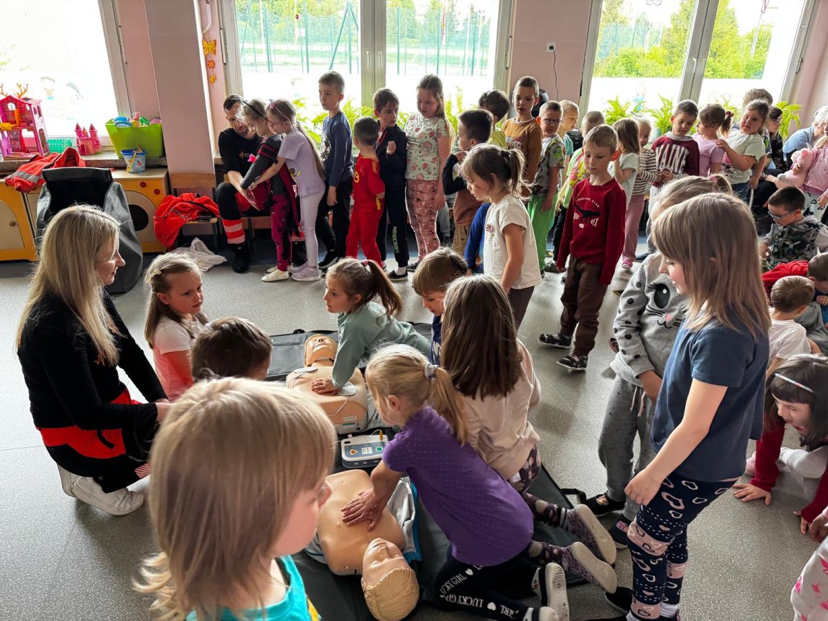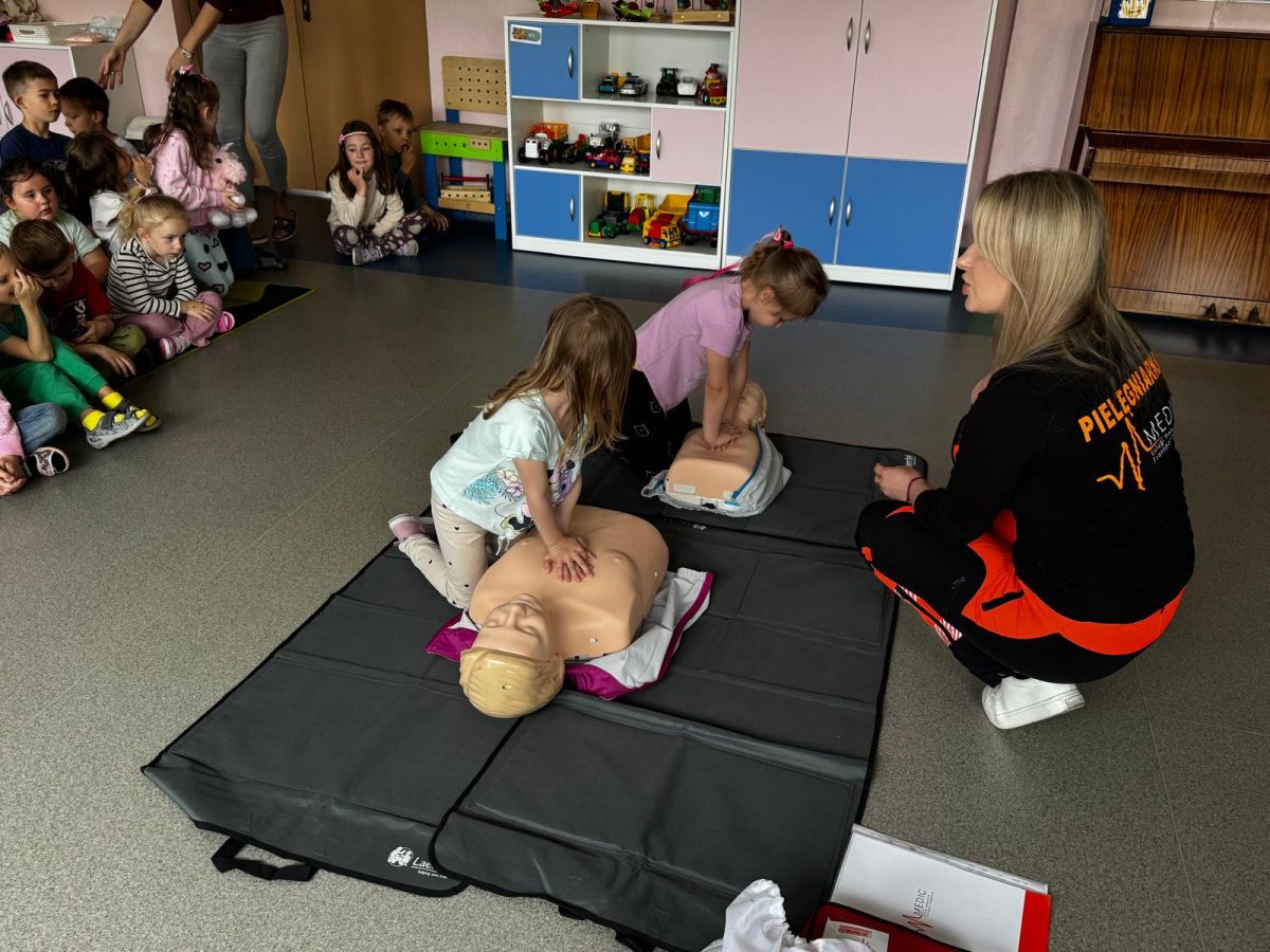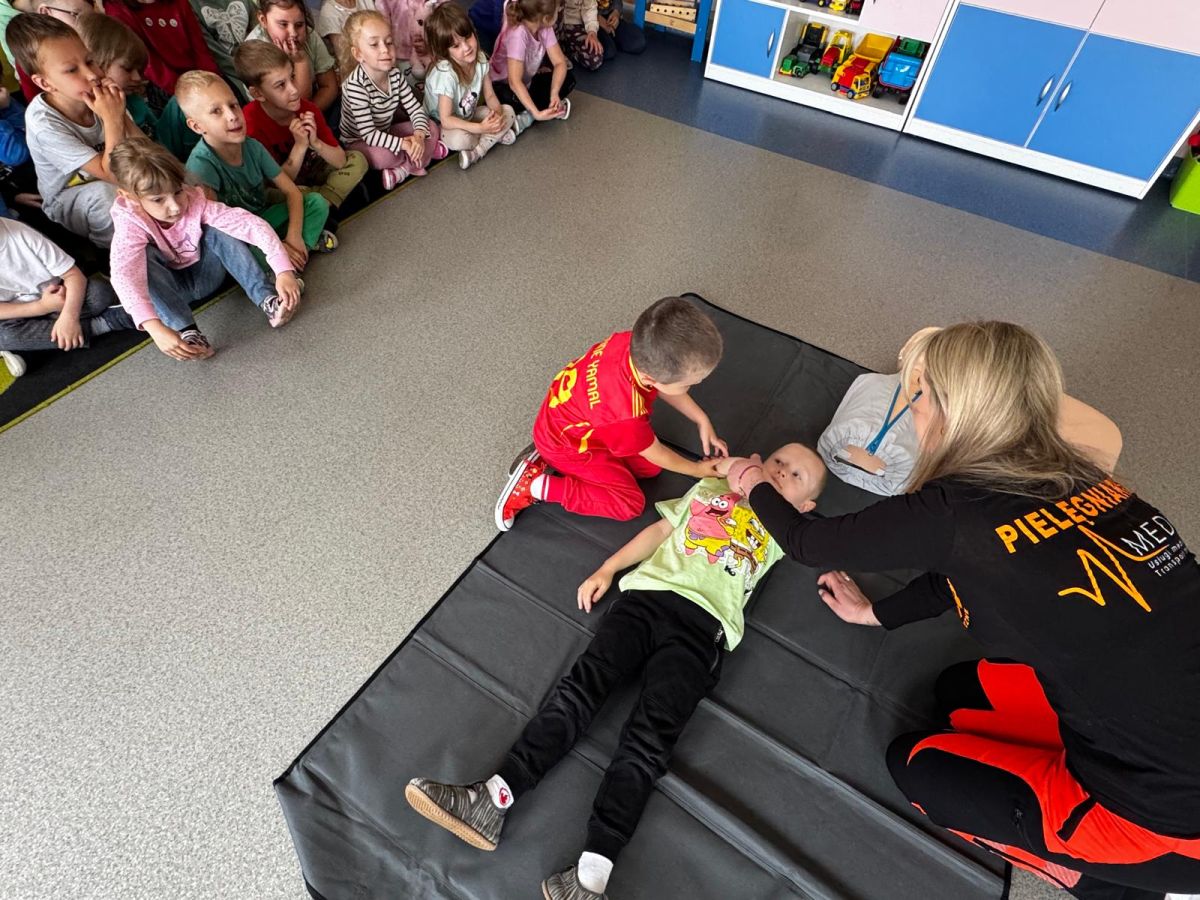 15 maja 2025 r. dzieci wzięły udział w lekcji: Czym jest pierwsza pomoc i kiedy należy jej udzielić. Gośćmi w naszym przedszkolu był zespół medyczny z MMedic, Pani Magdalena i Pan Paweł. Przedszkolaki dowiedziały się czym jest pierwsza pomoc. jakie są cele pierwszej pomocy. Dzieci utrwaliły numery alarmowe, oraz sytuacje w jakich powinny być używane a także jakie informacje należy podać podczas wzywania pomocy. Przedszkolaki ćwiczyły układanie osoby w pozycji bocznej bezpiecznej, uciskanie klatki piersiowej a także dowiedziały się co to jest AED czyli przenośny defibrylator i kiedy się go używa.
