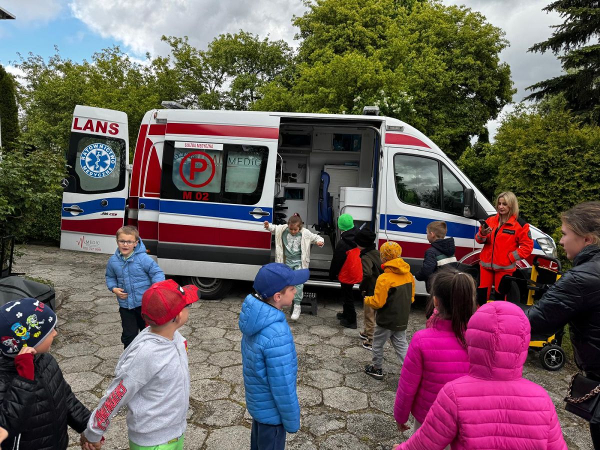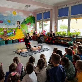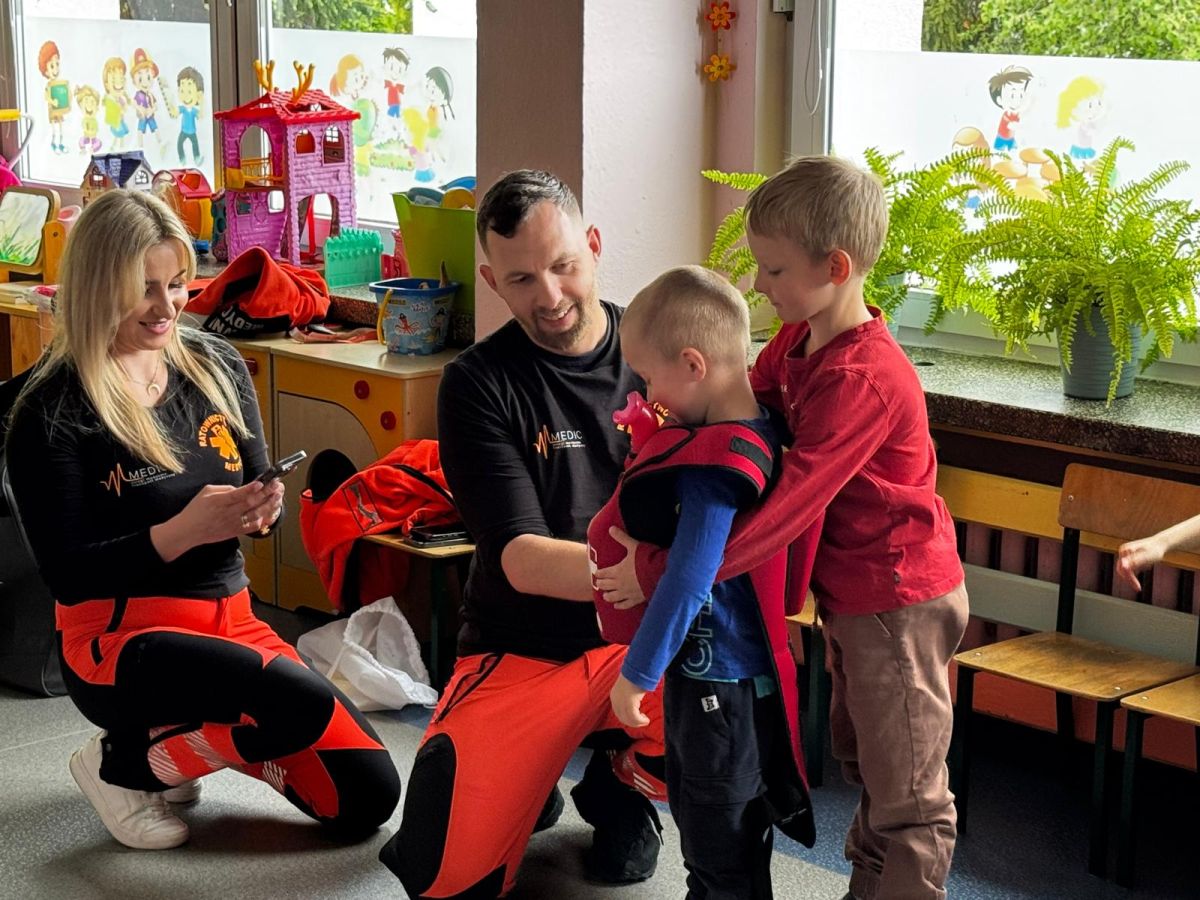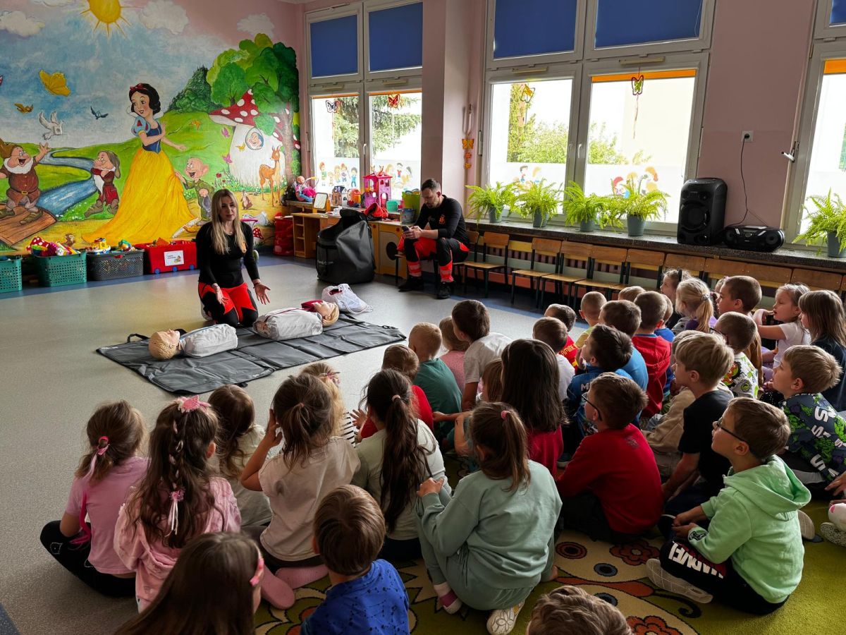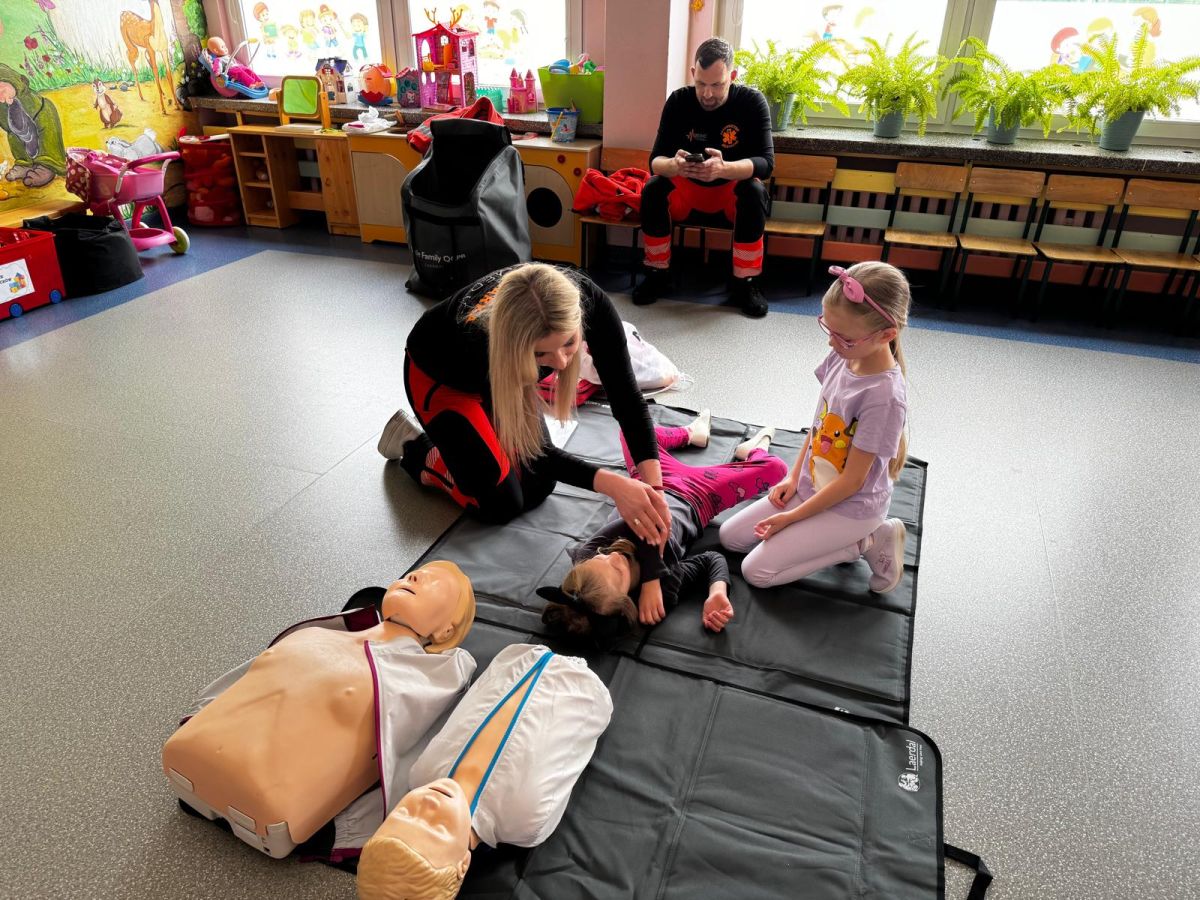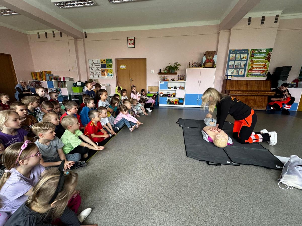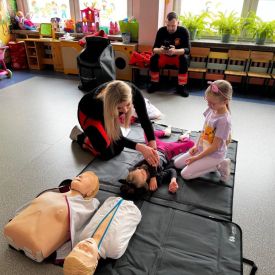15 maja 2025 r. dzieci wzięły udział w lekcji: Czym jest pierwsza pomoc i kiedy należy jej udzielić. Gośćmi w naszym przedszkolu był zespół medyczny z MMedic, Pani Magdalena i Pan Paweł. Przedszkolaki dowiedziały się czym jest pierwsza pomoc. jakie są cele pierwszej pomocy. Dzieci utrwaliły numery alarmowe, oraz sytuacje w jakich powinny być używane a także jakie informacje należy podać podczas wzywania pomocy. Przedszkolaki ćwiczyły układanie osoby w pozycji bocznej bezpiecznej, uciskanie klatki piersiowej a także dowiedziały się co to jest AED czyli przenośny defibrylator i kiedy się go używa.