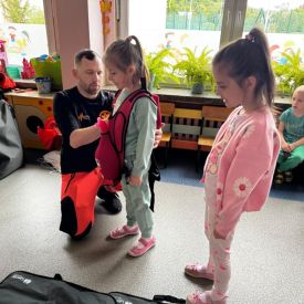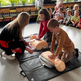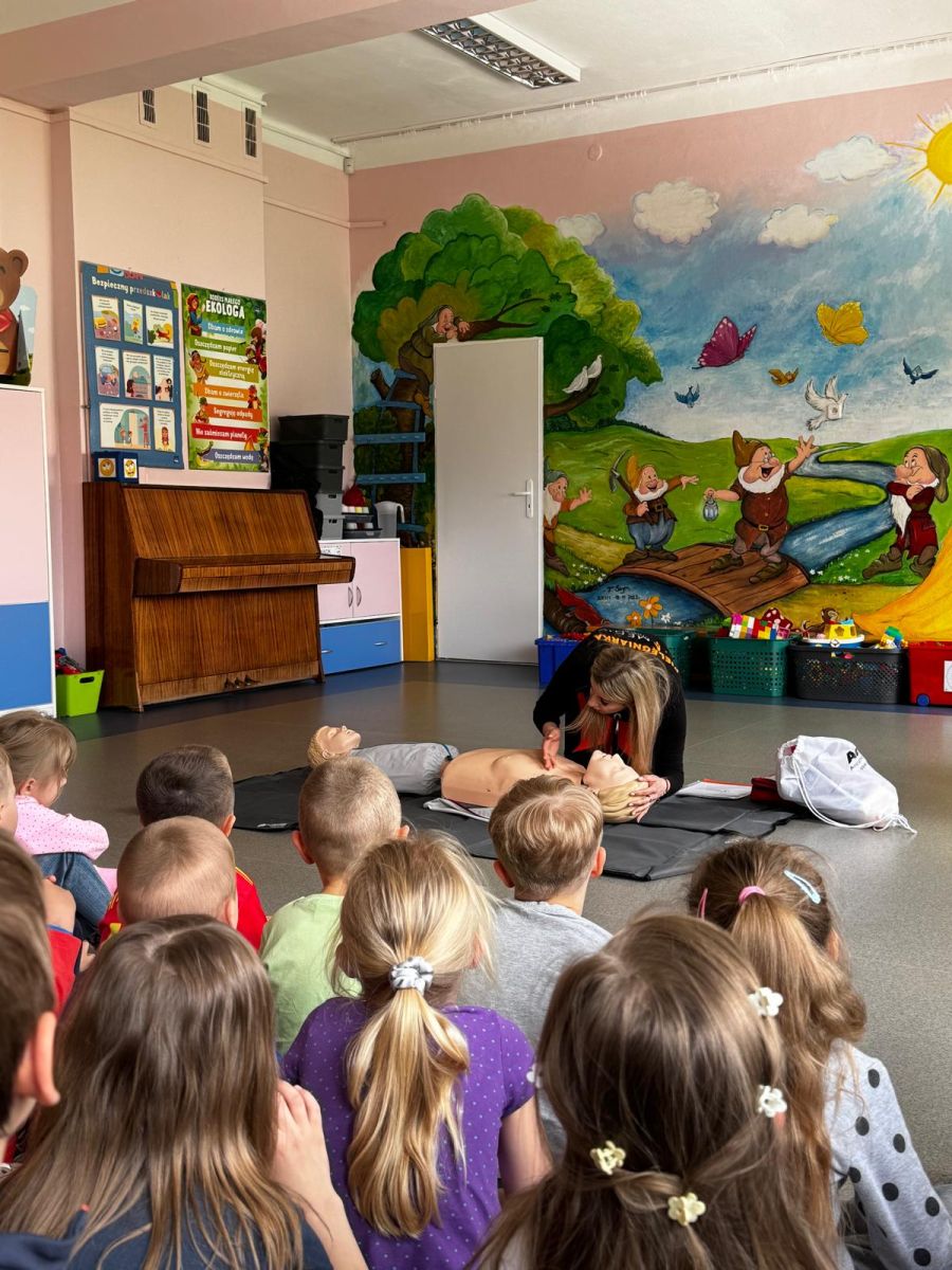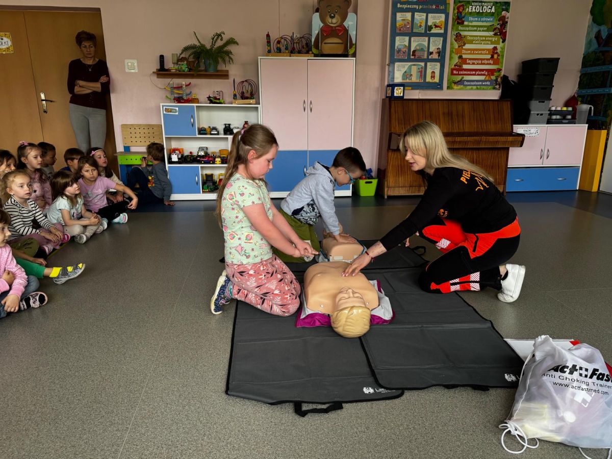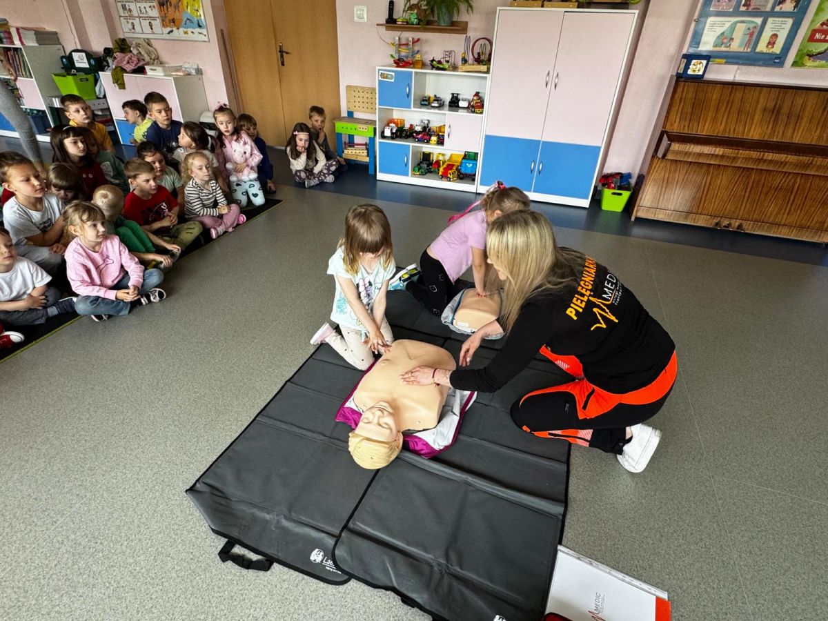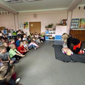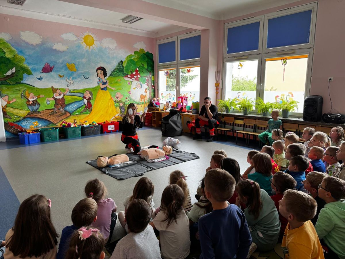 15 maja 2025 r. dzieci wzięły udział w lekcji: Czym jest pierwsza pomoc i kiedy należy jej udzielić. Gośćmi w naszym przedszkolu był zespół medyczny z MMedic, Pani Magdalena i Pan Paweł. Przedszkolaki dowiedziały się czym jest pierwsza pomoc. jakie są cele pierwszej pomocy. Dzieci utrwaliły numery alarmowe, oraz sytuacje w jakich powinny być używane a także jakie informacje należy podać podczas wzywania pomocy. Przedszkolaki ćwiczyły układanie osoby w pozycji bocznej bezpiecznej, uciskanie klatki piersiowej a także dowiedziały się co to jest AED czyli przenośny defibrylator i kiedy się go używa.