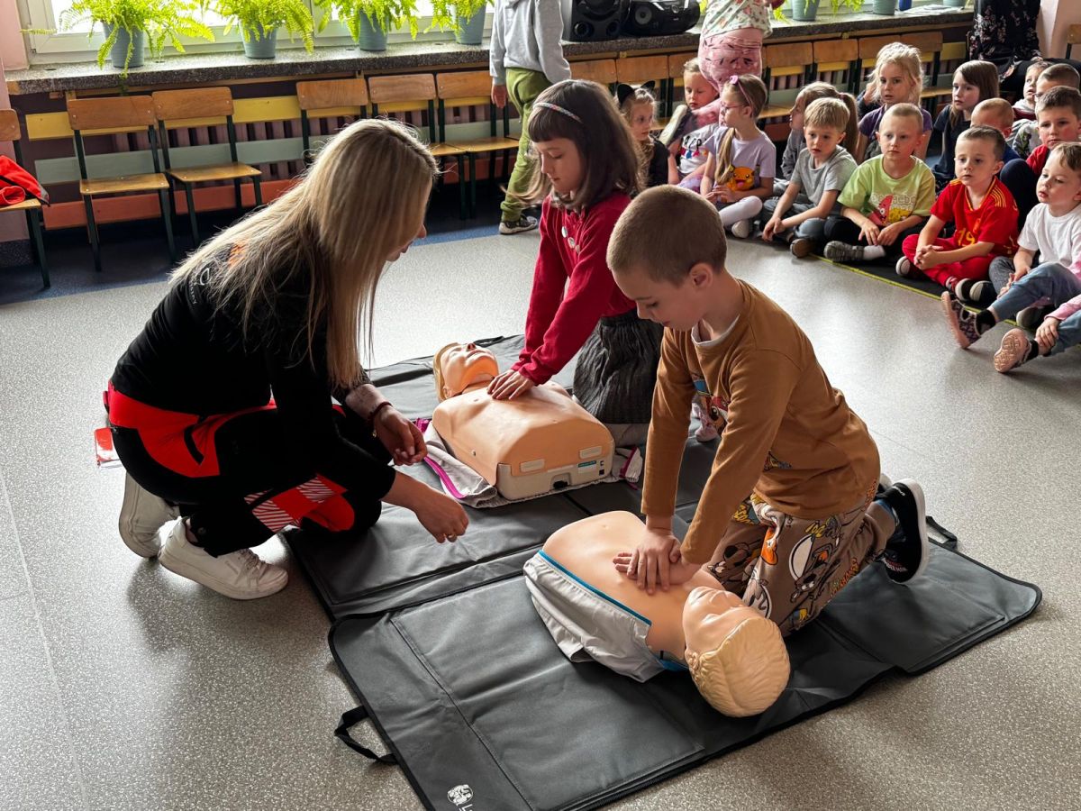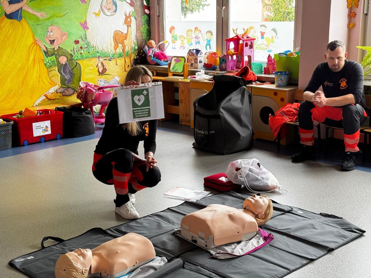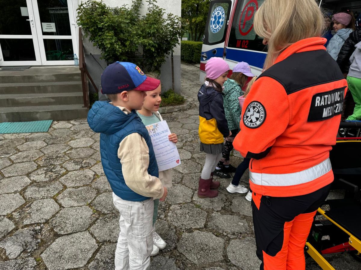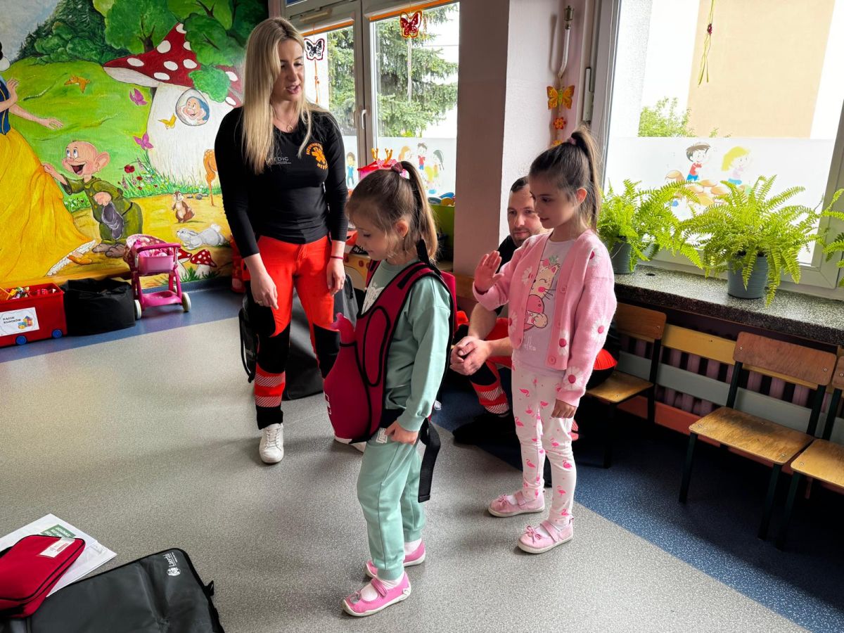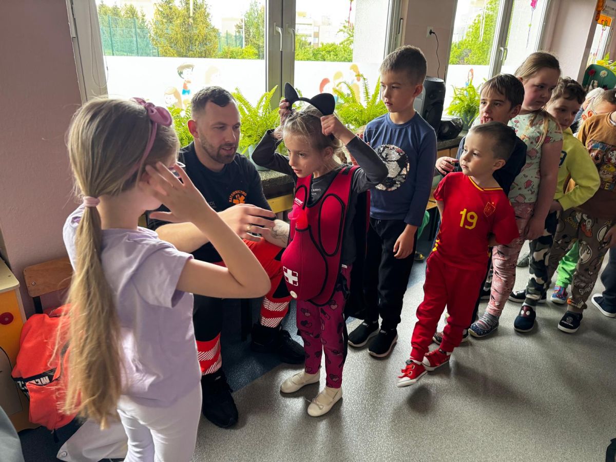 15 maja 2025 r. dzieci wzięły udział w lekcji: Czym jest pierwsza pomoc i kiedy należy jej udzielić. Gośćmi w naszym przedszkolu był zespół medyczny z MMedic, Pani Magdalena i Pan Paweł. Przedszkolaki dowiedziały się czym jest pierwsza pomoc. jakie są cele pierwszej pomocy. Dzieci utrwaliły numery alarmowe, oraz sytuacje w jakich powinny być używane a także jakie informacje należy podać podczas wzywania pomocy. Przedszkolaki ćwiczyły układanie osoby w pozycji bocznej bezpiecznej, uciskanie klatki piersiowej a także dowiedziały się co to jest AED czyli przenośny defibrylator i kiedy się go używa.