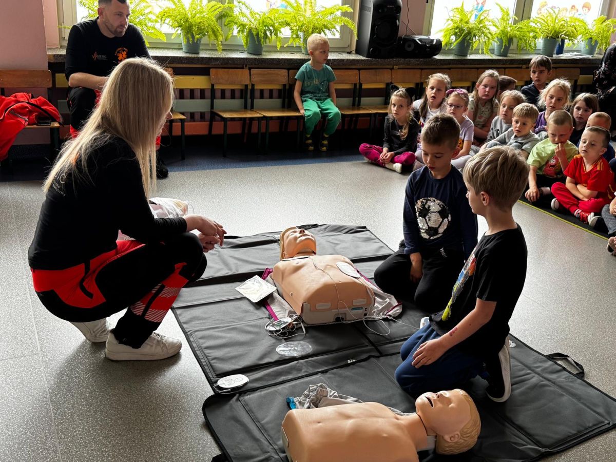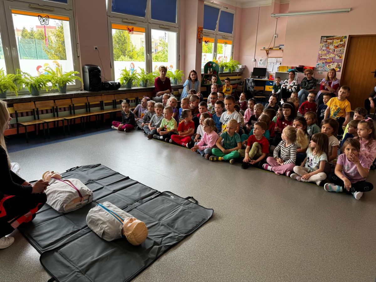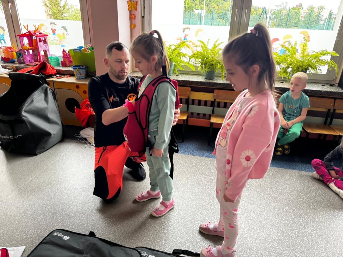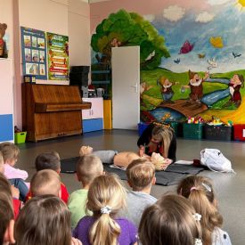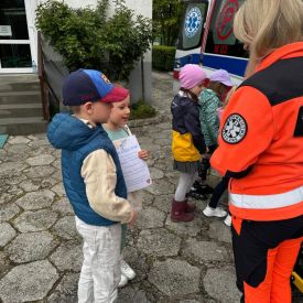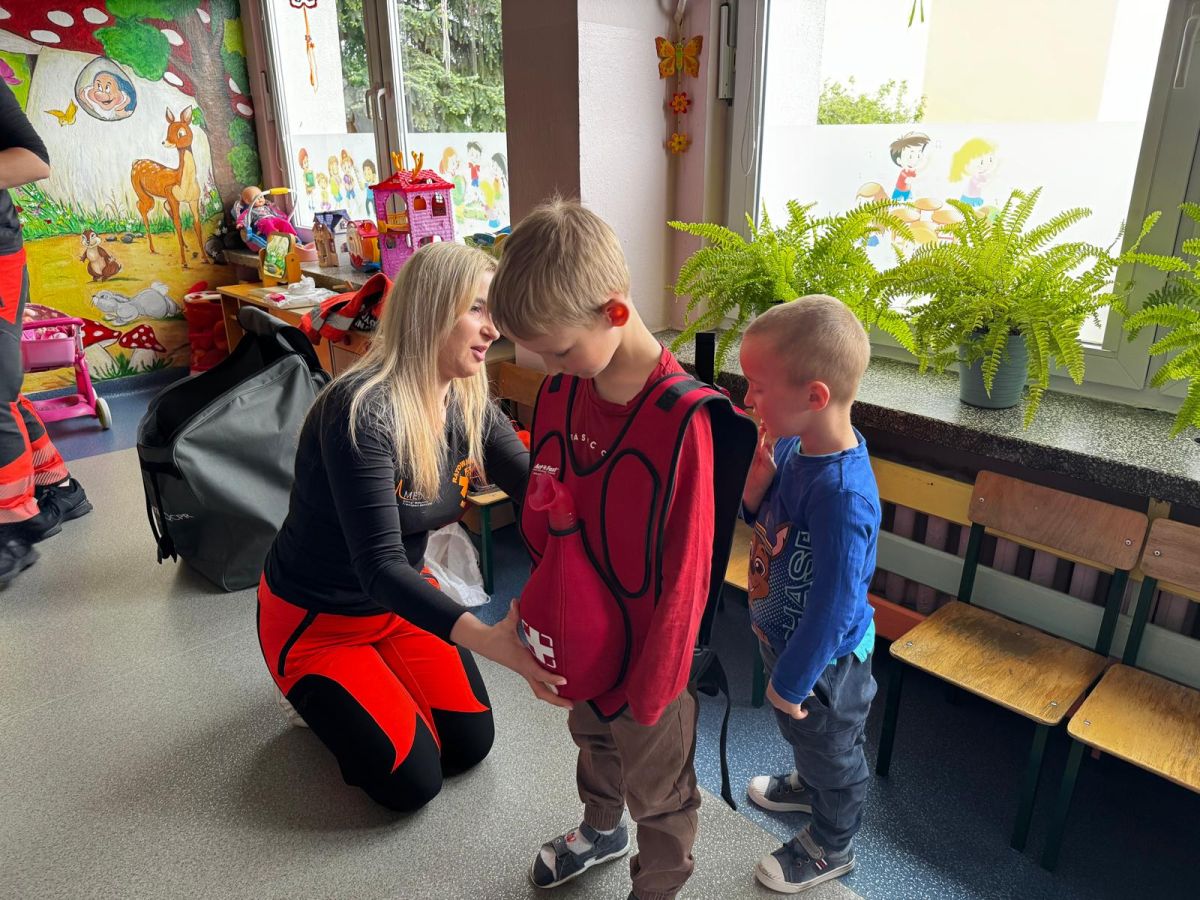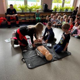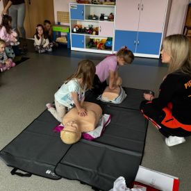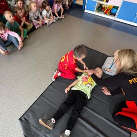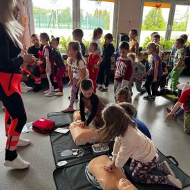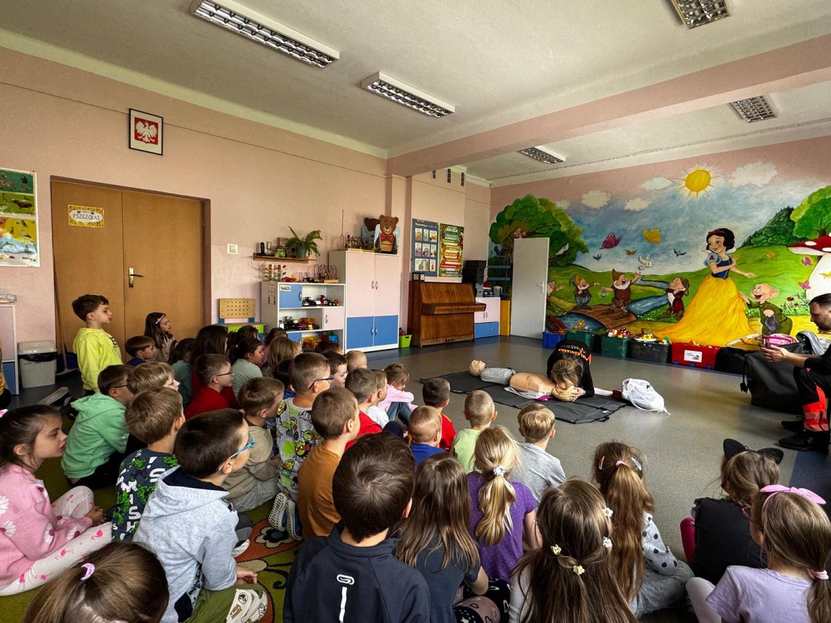 15 maja 2025 r. dzieci wzięły udział w lekcji: Czym jest pierwsza pomoc i kiedy należy jej udzielić. Gośćmi w naszym przedszkolu był zespół medyczny z MMedic, Pani Magdalena i Pan Paweł. Przedszkolaki dowiedziały się czym jest pierwsza pomoc. jakie są cele pierwszej pomocy. Dzieci utrwaliły numery alarmowe, oraz sytuacje w jakich powinny być używane a także jakie informacje należy podać podczas wzywania pomocy. Przedszkolaki ćwiczyły układanie osoby w pozycji bocznej bezpiecznej, uciskanie klatki piersiowej a także dowiedziały się co to jest AED czyli przenośny defibrylator i kiedy się go używa.