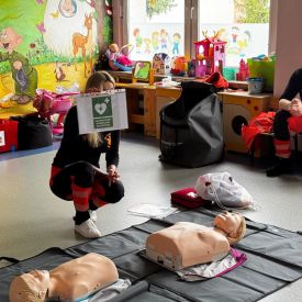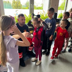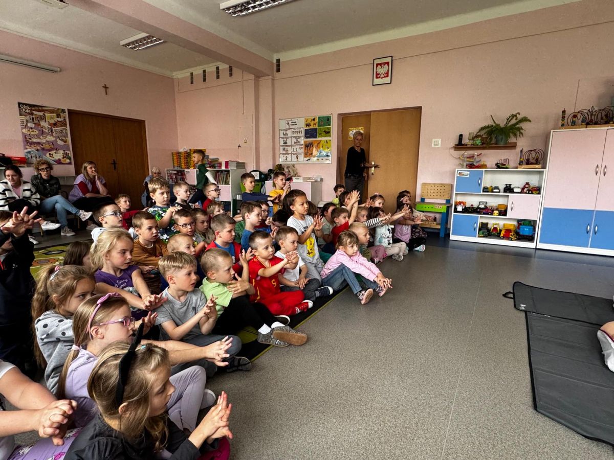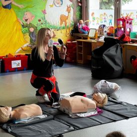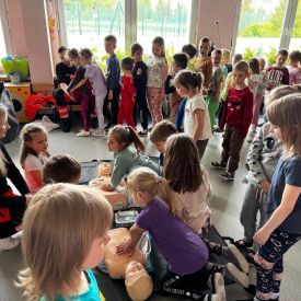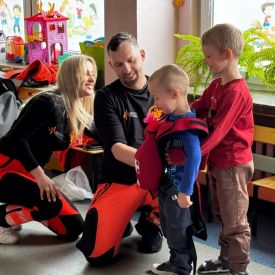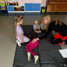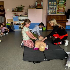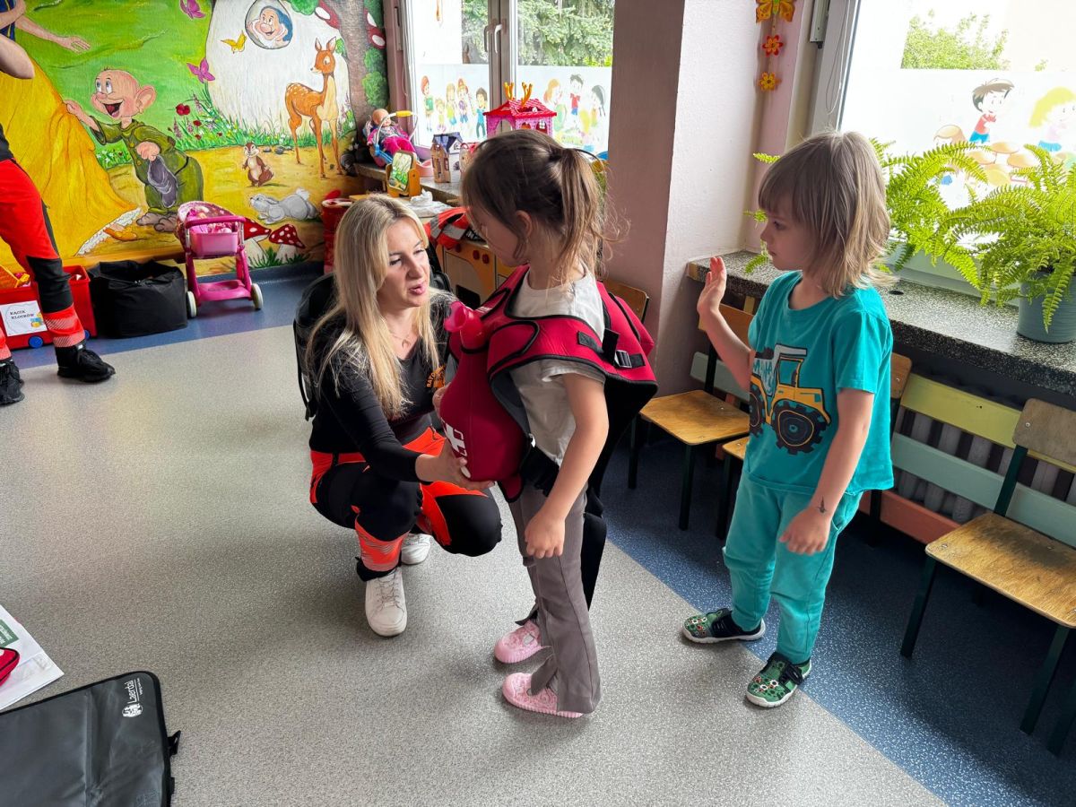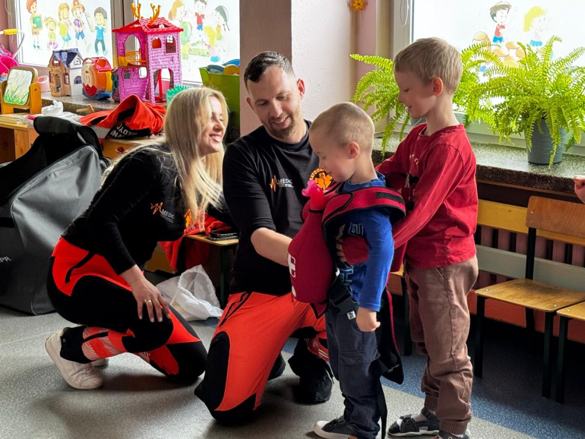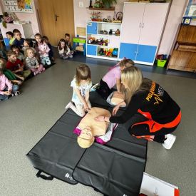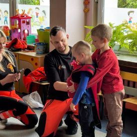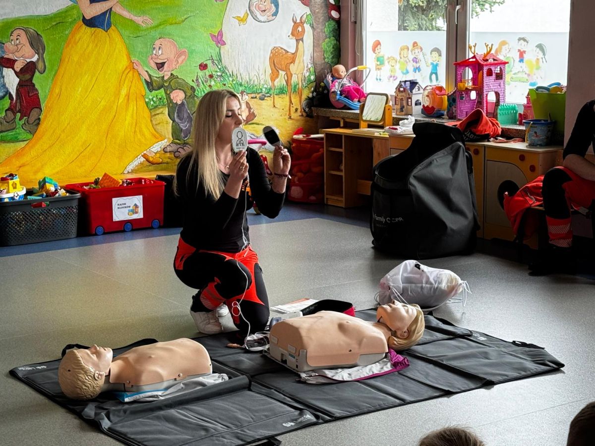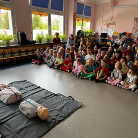 15 maja 2025 r. dzieci wzięły udział w lekcji: Czym jest pierwsza pomoc i kiedy należy jej udzielić. Gośćmi w naszym przedszkolu był zespół medyczny z MMedic, Pani Magdalena i Pan Paweł. Przedszkolaki dowiedziały się czym jest pierwsza pomoc. jakie są cele pierwszej pomocy. Dzieci utrwaliły numery alarmowe, oraz sytuacje w jakich powinny być używane a także jakie informacje należy podać podczas wzywania pomocy. Przedszkolaki ćwiczyły układanie osoby w pozycji bocznej bezpiecznej, uciskanie klatki piersiowej a także dowiedziały się co to jest AED czyli przenośny defibrylator i kiedy się go używa.