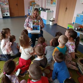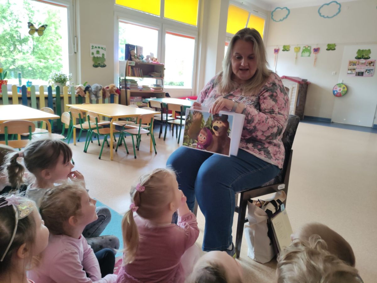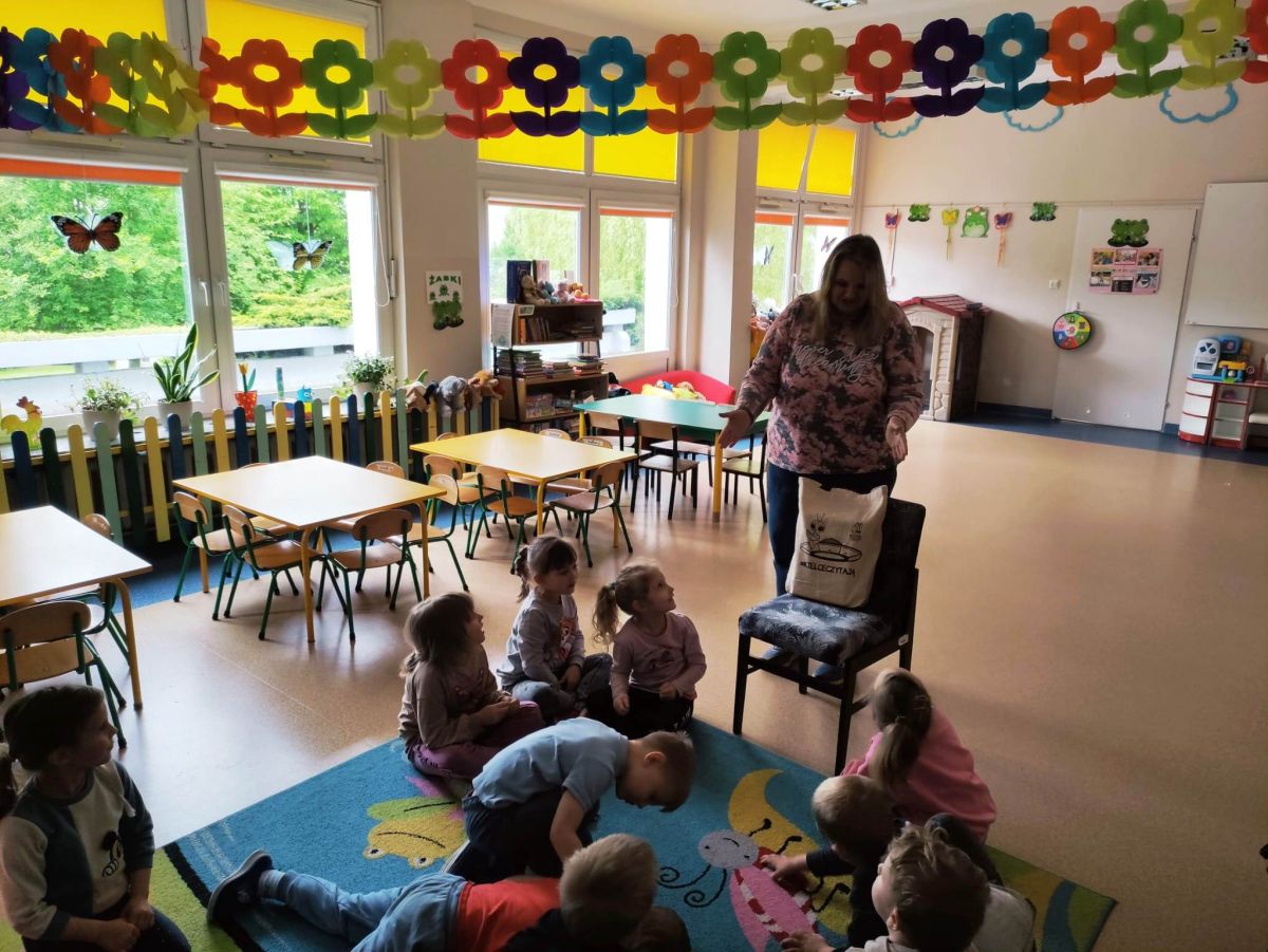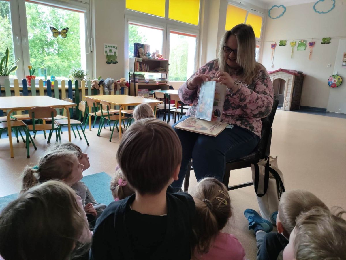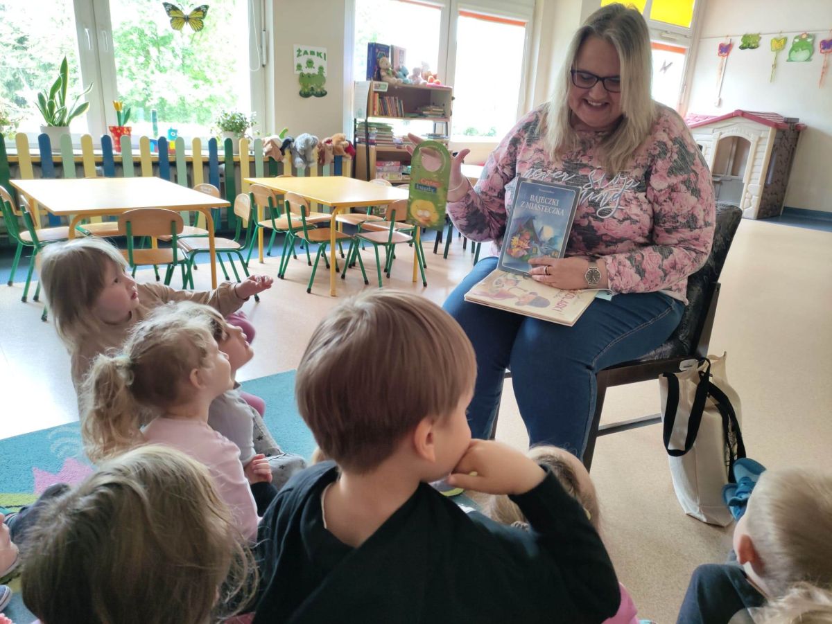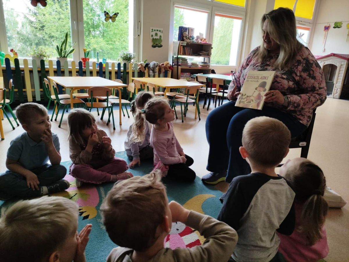 16 maja dzieci z grupy Żabek i Motylków odwiedziła Pani Ania - bibliotekarka z Miejskiej Biblioteki Publicznej Filii nr 2 w ramach akcji Cała Polska Czyta Dzieciom. Pani Ania czytała dzieciom pełne humoru, momentami zwariowane opowiastki o sąsiadce, pudlu i kocie autorstwa Doroty Gellner pt. "Czekoladki dla sąsiadki". Wysłuchane opowiadania oraz przygotowane przez bibliotekarkę zagdaki wprawiły dzieci w doskonały nastrój. Na zakończenie spotkania dzieci podziękowały Pani Ani i obiecały odwiedzić bibliotekę z rodzicami.
