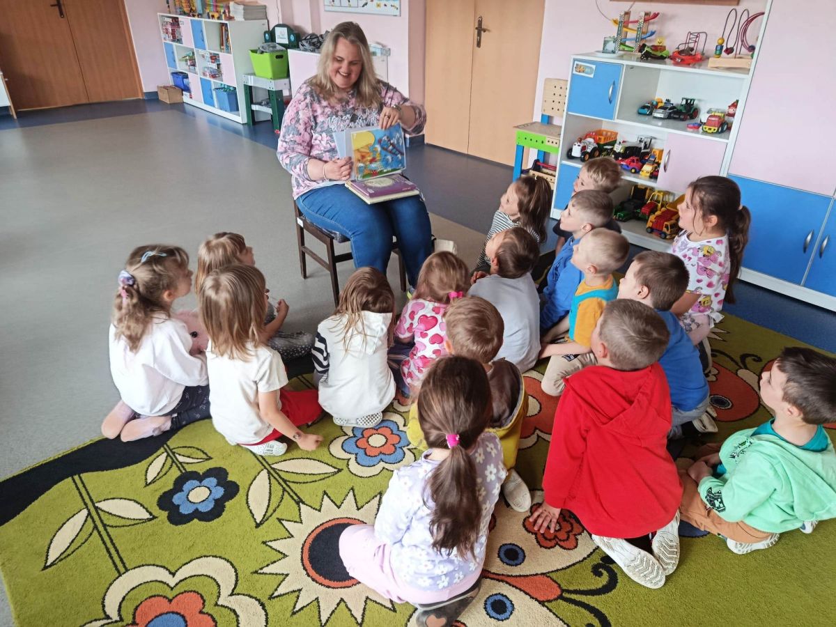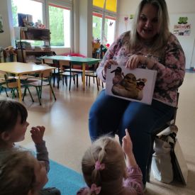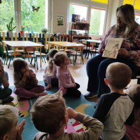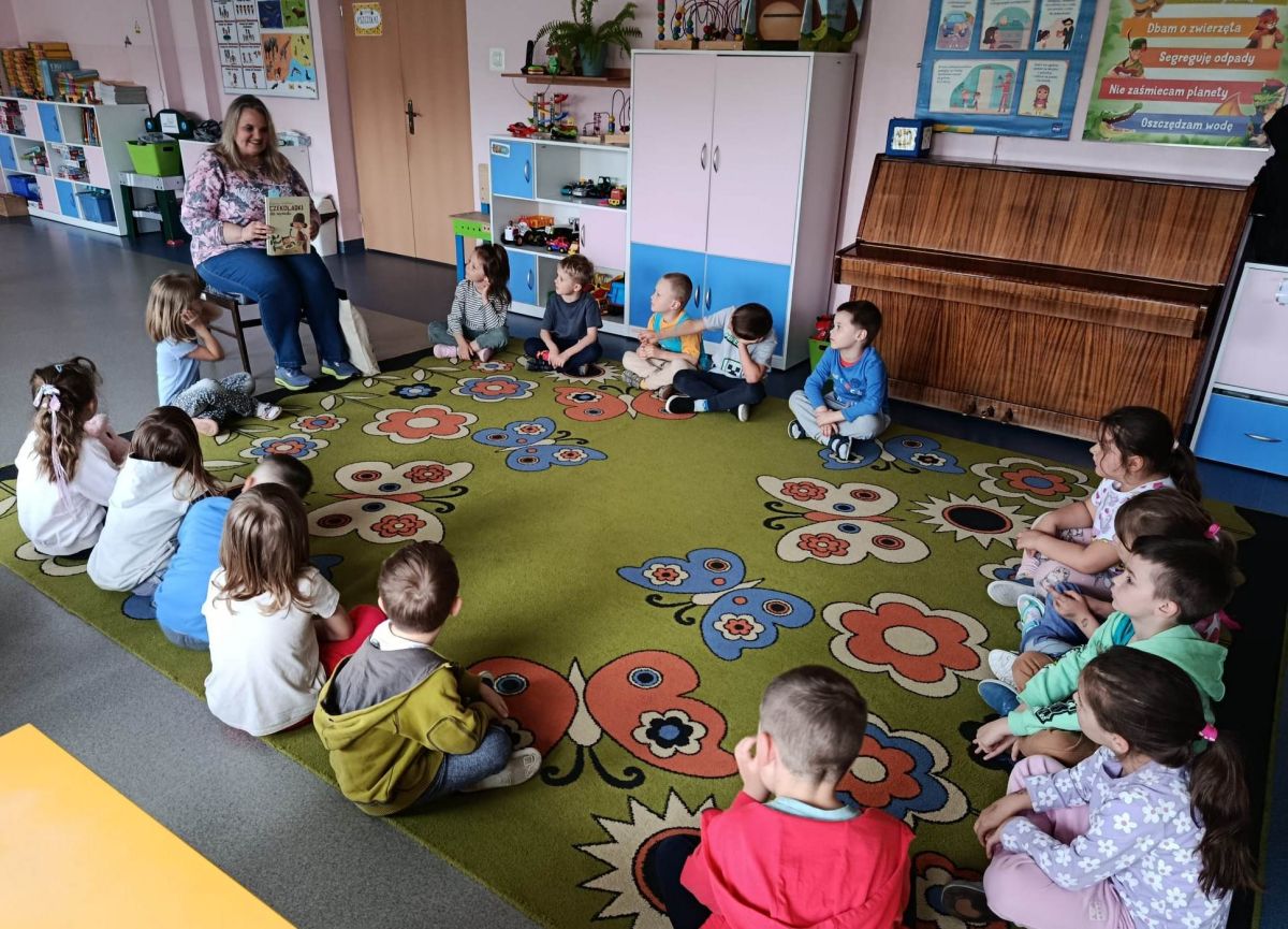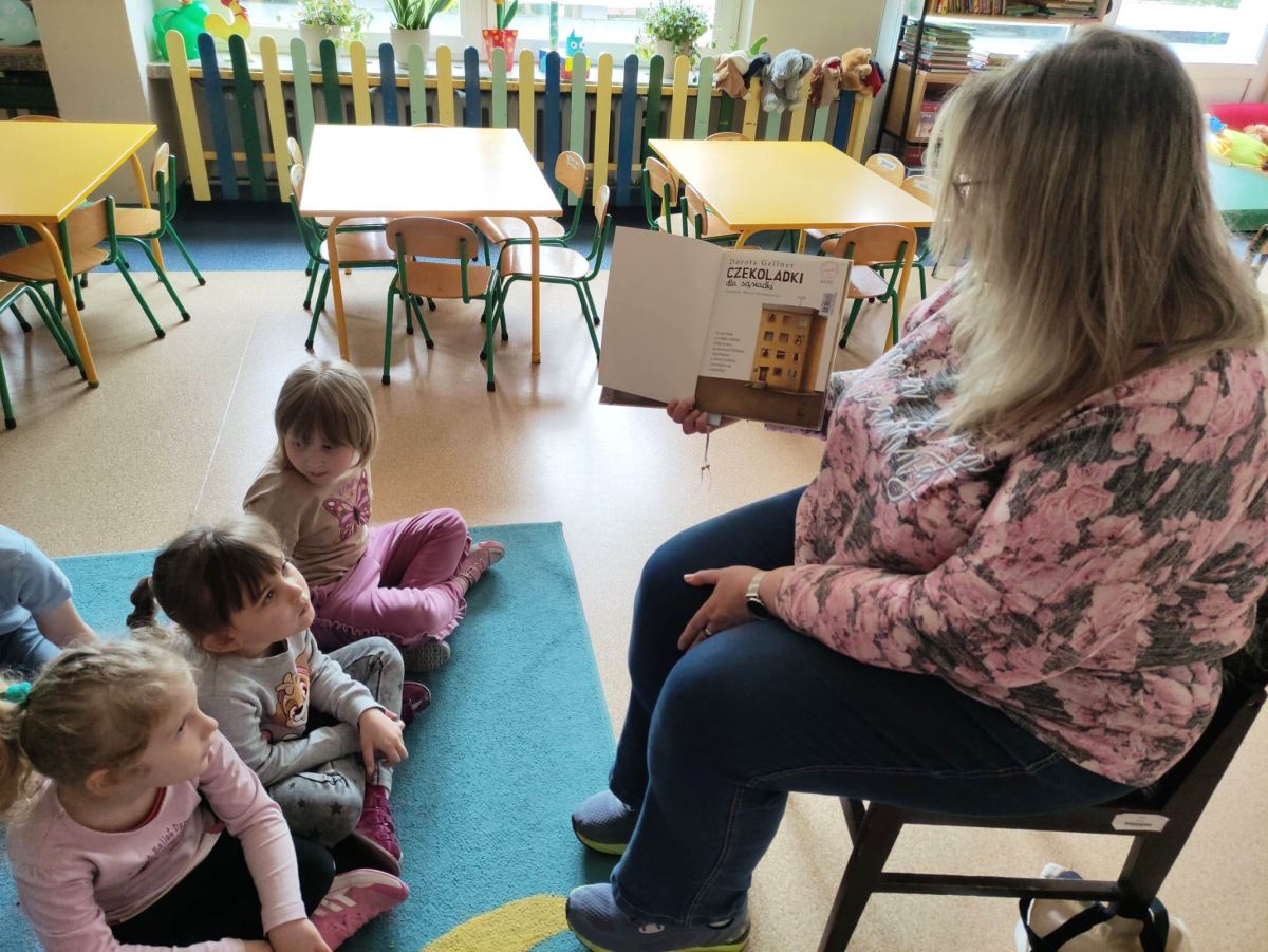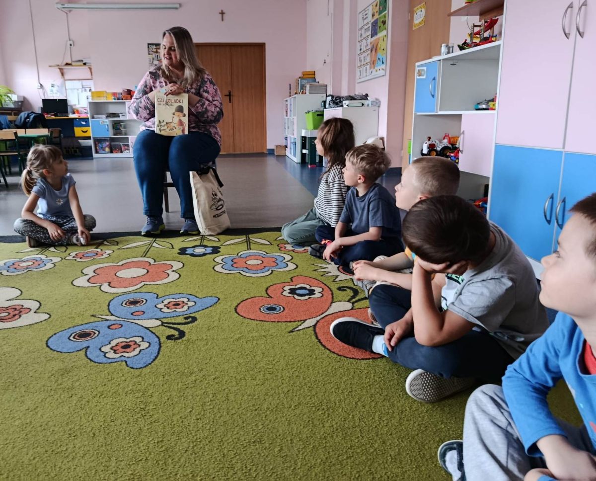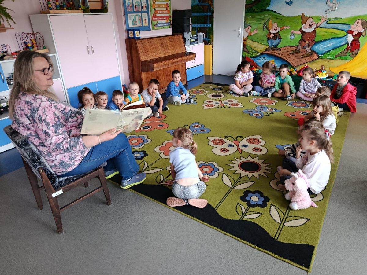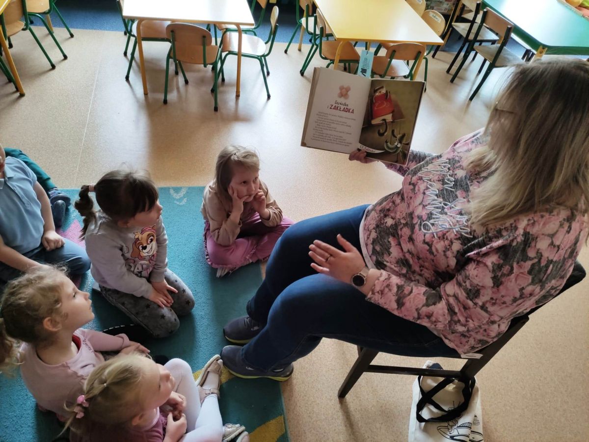 16 maja dzieci z grupy Żabek i Motylków odwiedziła Pani Ania - bibliotekarka z Miejskiej Biblioteki Publicznej Filii nr 2 w ramach akcji Cała Polska Czyta Dzieciom. Pani Ania czytała dzieciom pełne humoru, momentami zwariowane opowiastki o sąsiadce, pudlu i kocie autorstwa Doroty Gellner pt. "Czekoladki dla sąsiadki". Wysłuchane opowiadania oraz przygotowane przez bibliotekarkę zagdaki wprawiły dzieci w doskonały nastrój. Na zakończenie spotkania dzieci podziękowały Pani Ani i obiecały odwiedzić bibliotekę z rodzicami.