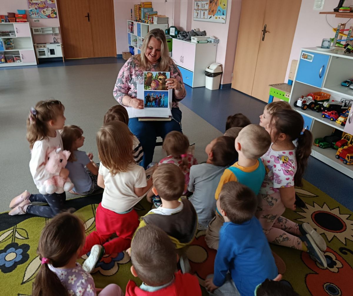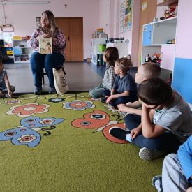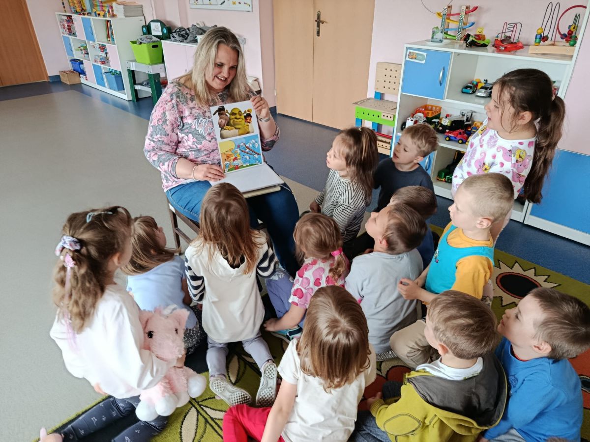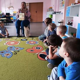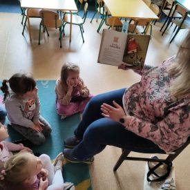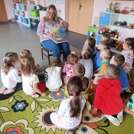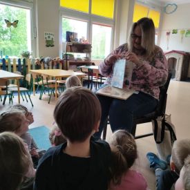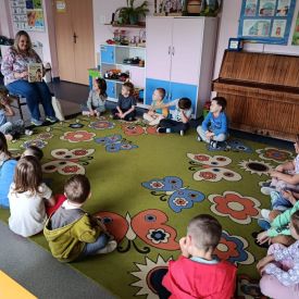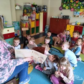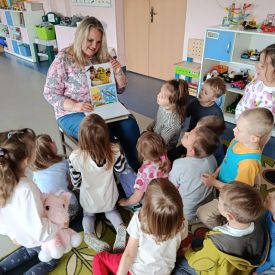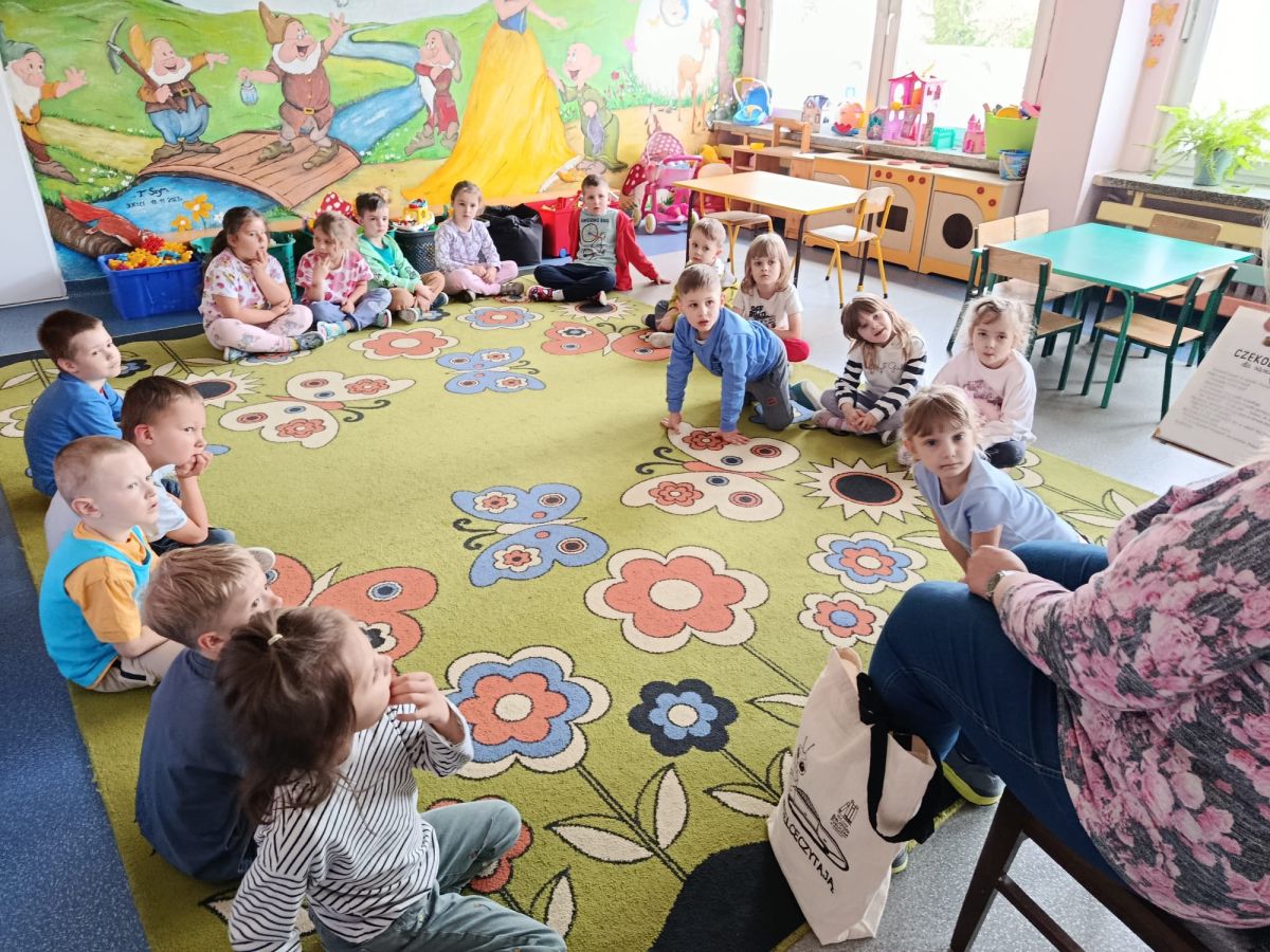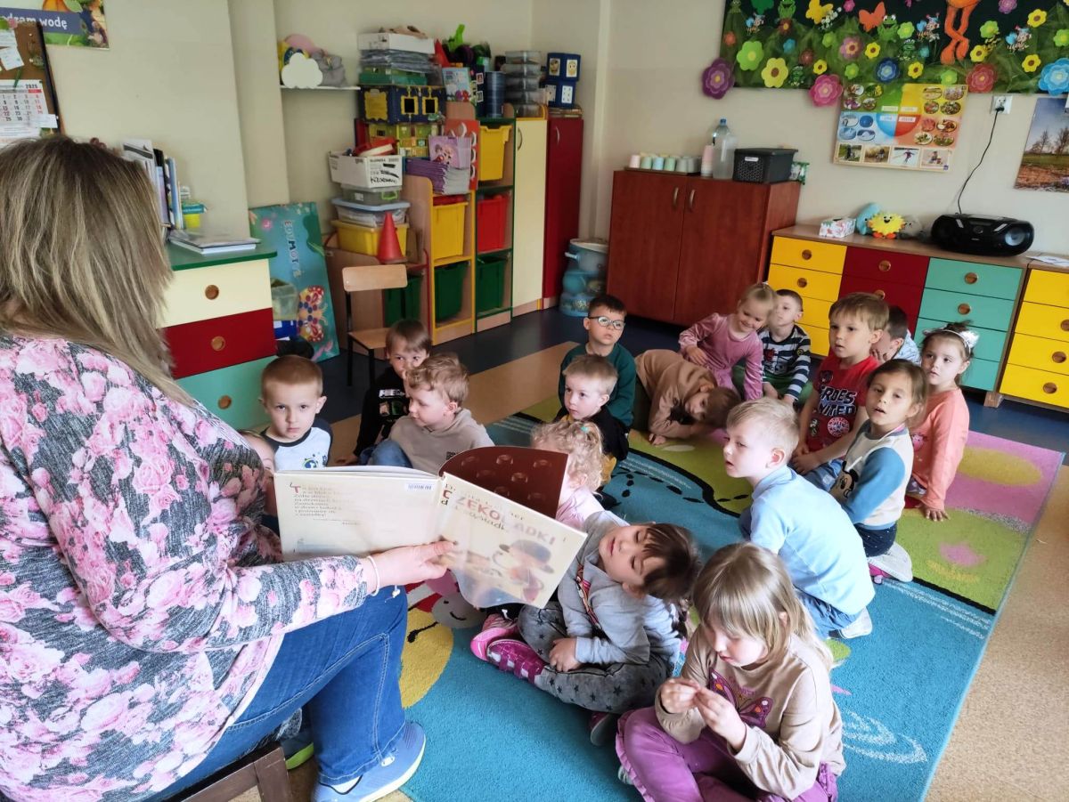 16 maja dzieci z grupy Żabek i Motylków odwiedziła Pani Ania - bibliotekarka z Miejskiej Biblioteki Publicznej Filii nr 2 w ramach akcji Cała Polska Czyta Dzieciom. Pani Ania czytała dzieciom pełne humoru, momentami zwariowane opowiastki o sąsiadce, pudlu i kocie autorstwa Doroty Gellner pt. "Czekoladki dla sąsiadki". Wysłuchane opowiadania oraz przygotowane przez bibliotekarkę zagdaki wprawiły dzieci w doskonały nastrój. Na zakończenie spotkania dzieci podziękowały Pani Ani i obiecały odwiedzić bibliotekę z rodzicami.